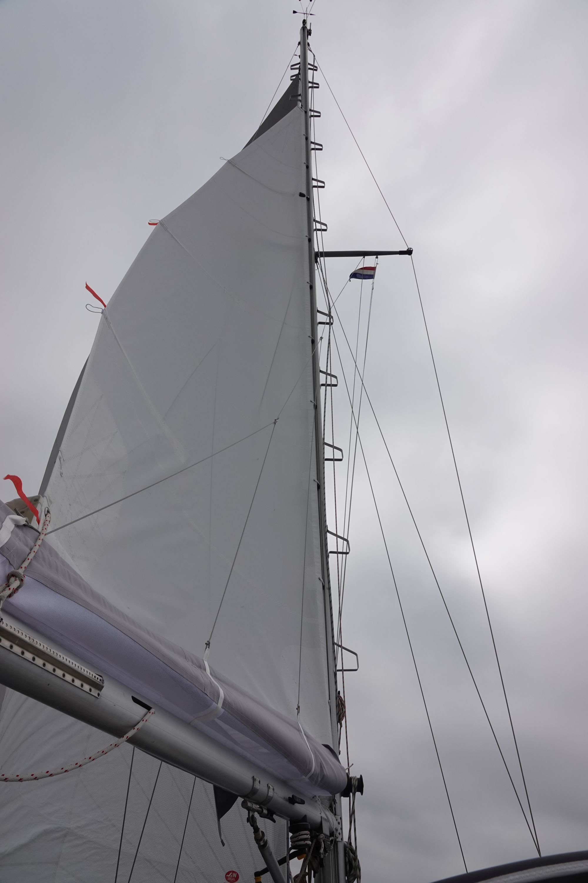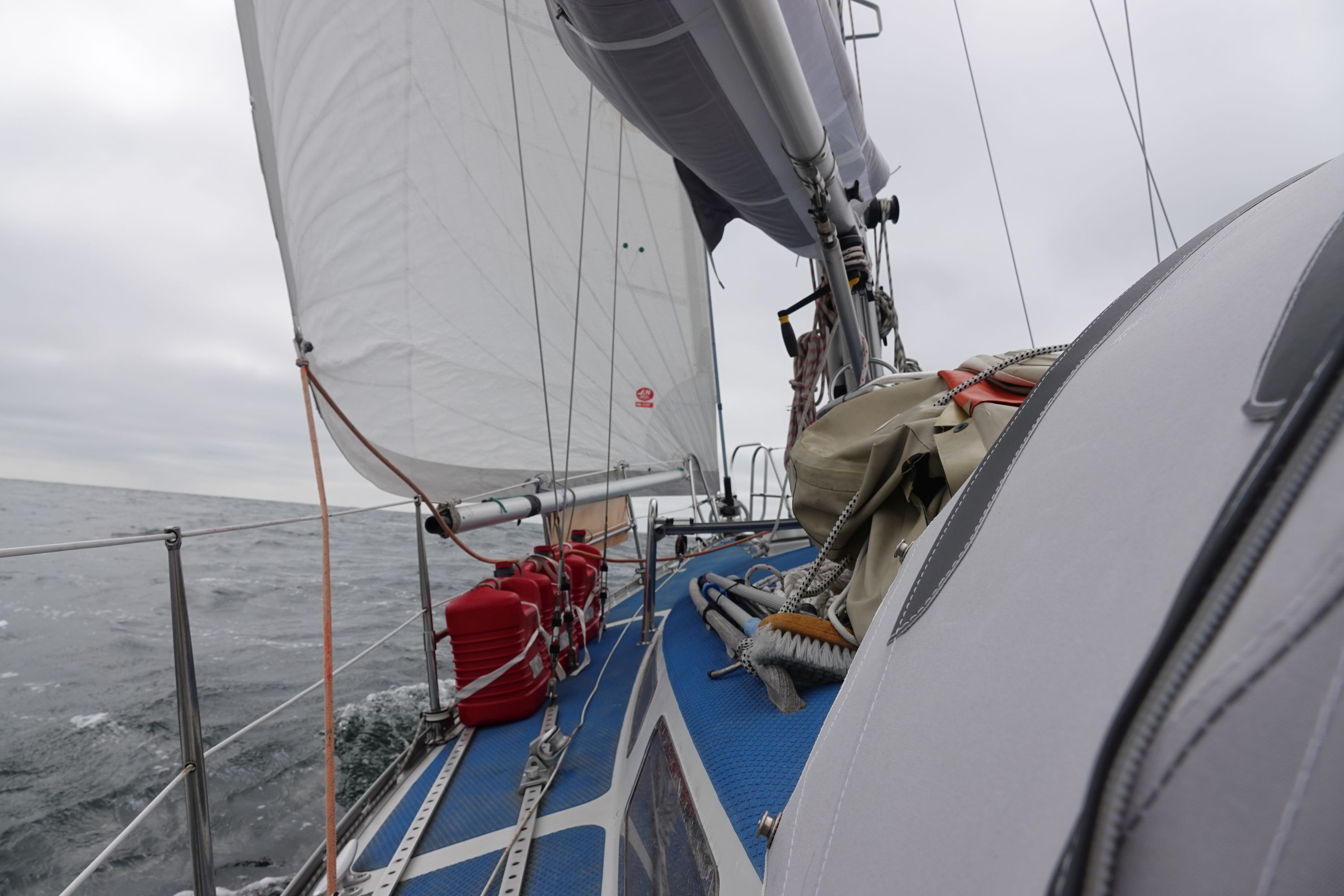Auch hier gibt es eine kräftige Schaukelei. Im tiefen Wasser angekommen setze ich erst die Genua und kurz später noch das Groß mit zweitem Reff. Ich bin dick angezogen und das ist auch gut so, aber beim Arbeiten an Deck komme ich bald ins Schwitzen.