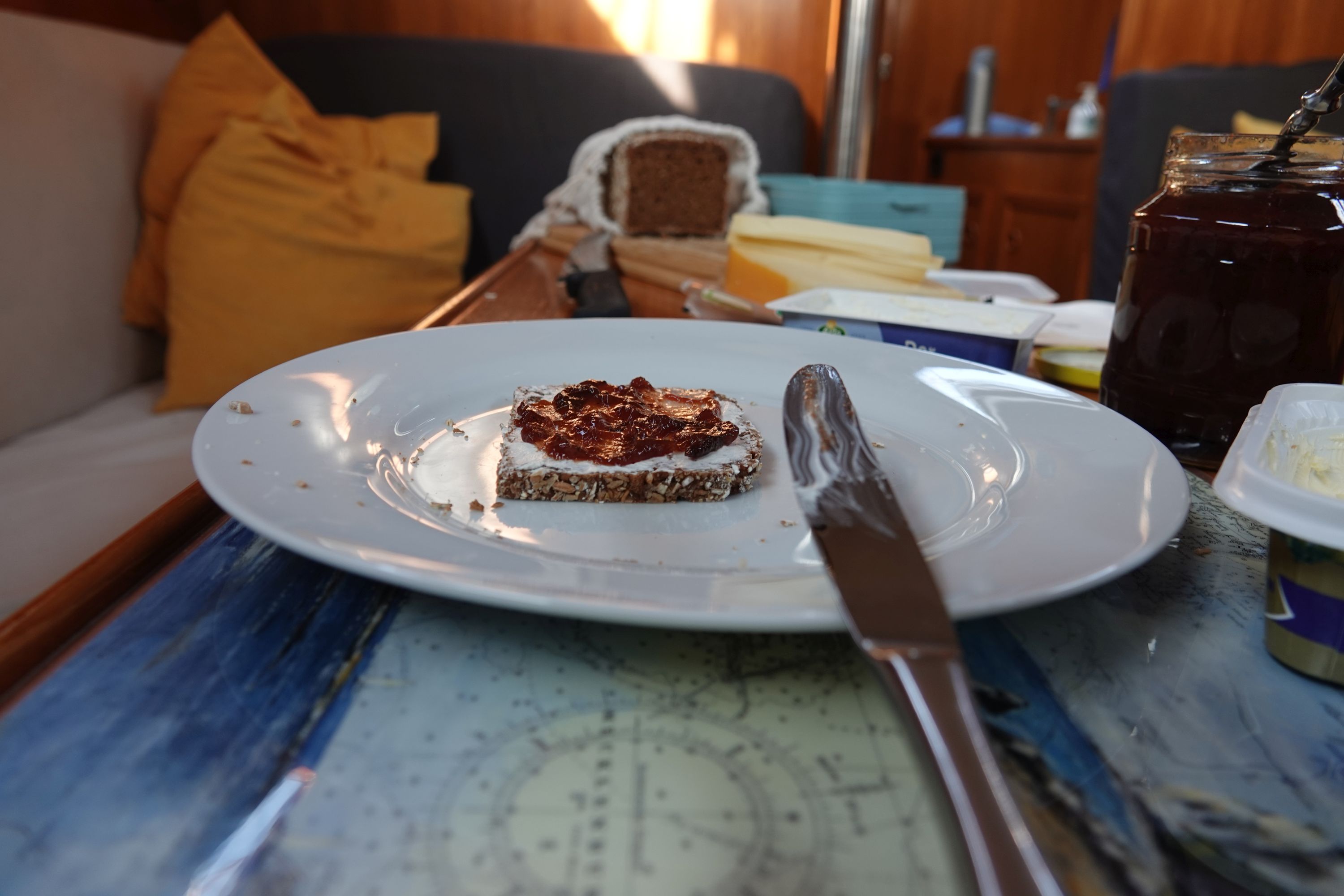 Um sechs Uhr stehe ich auf, schlüpfe in mehrere Lagen Funktionswäsche, frühstücke und schmiere Brote für unterwegs. Auf den Stegen ist schon reges Treiben, die ersten gehen bereits kurz nach sieben raus. Wind weht wie vorhergesagt kaum. Die Sonne scheint. Eine meiner vielen Schichten ziehe ich gleich wieder aus um bein Ablegen nicht ins Schwitzen zu kommen.