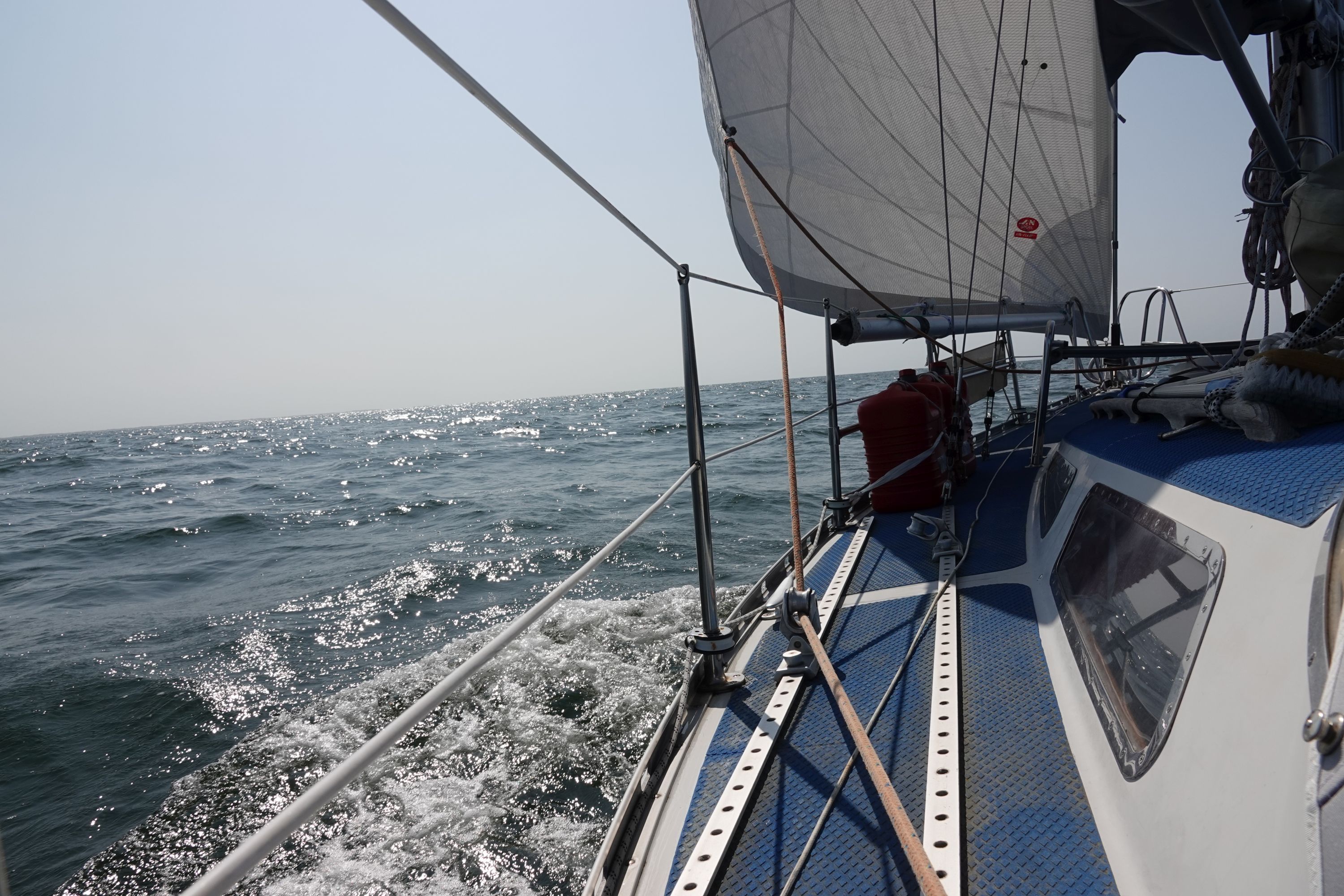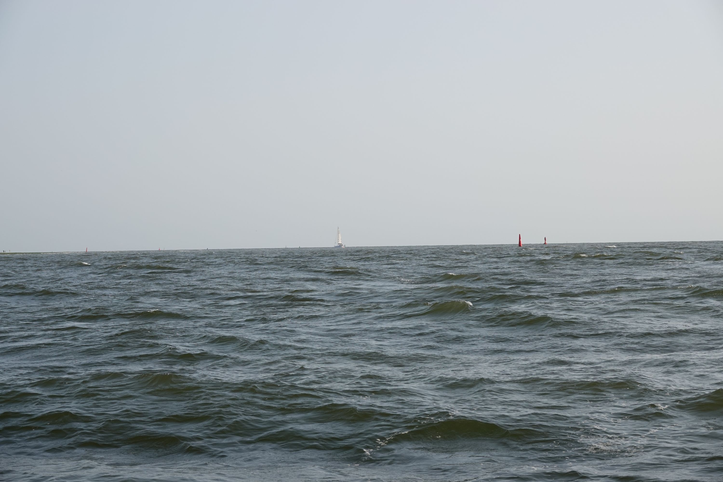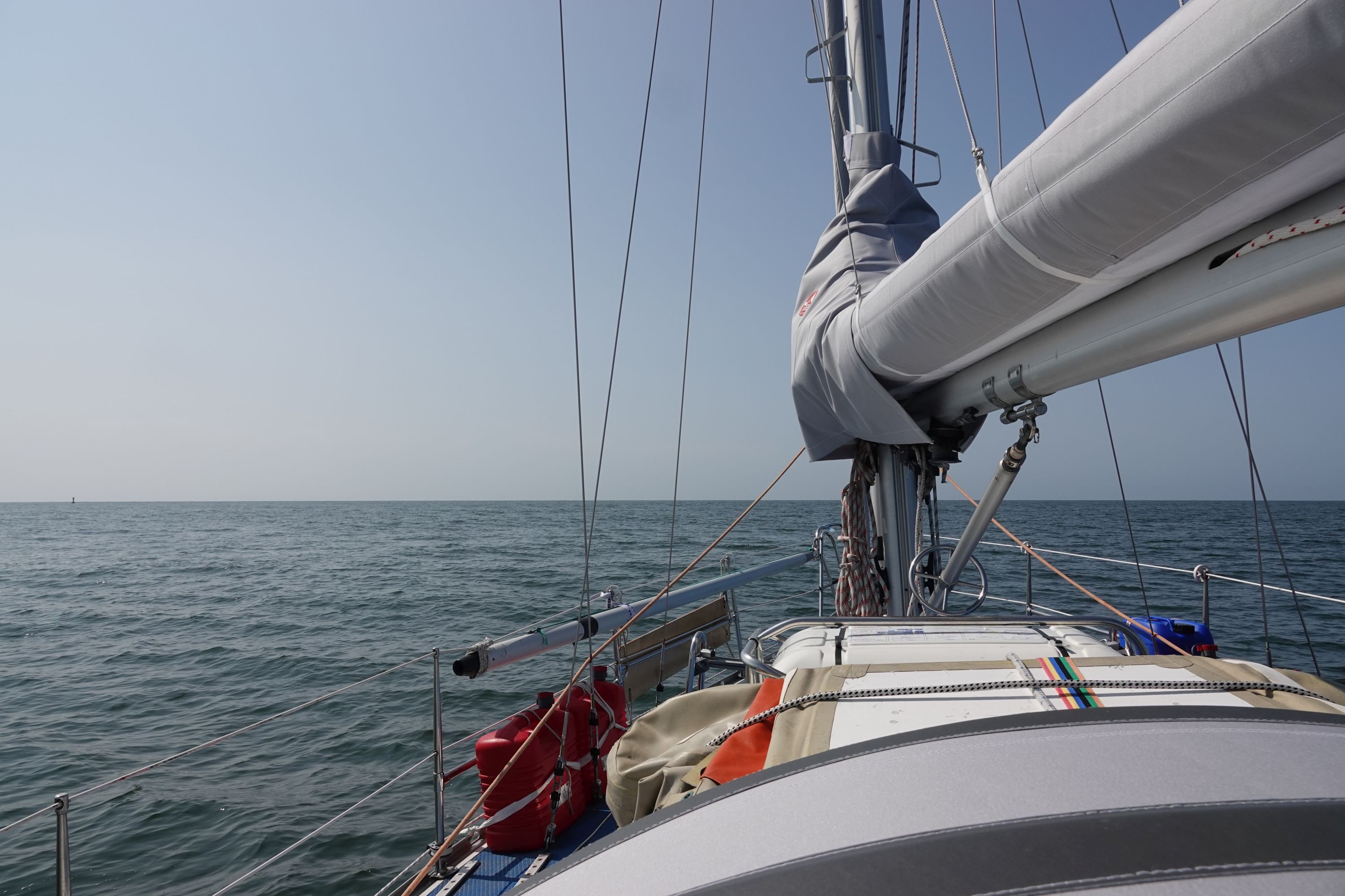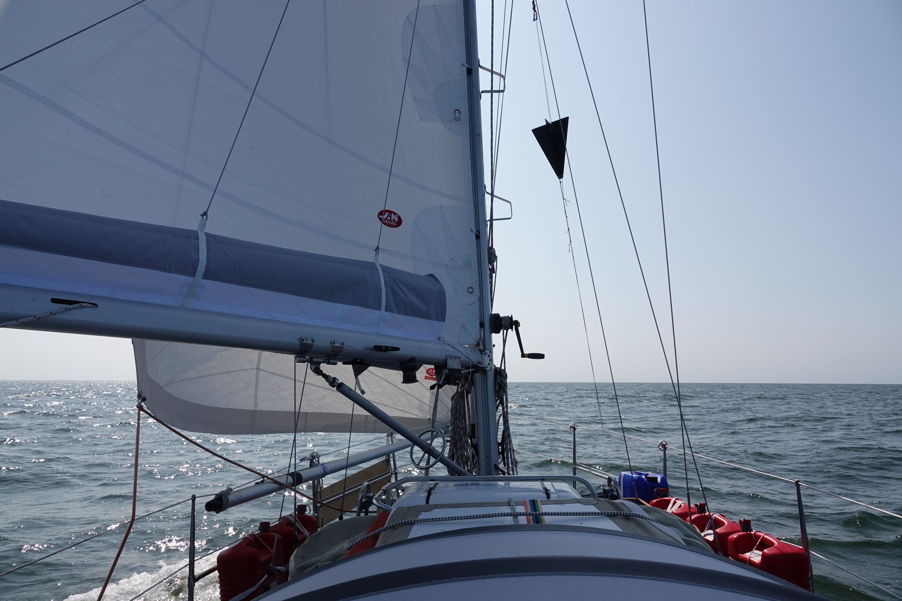 Ab der Wesermündung läuft der Strom dann merklich gegenan. Es fehlt ein guter Knoten. Selbst mit erhöhter Drehzahl kommen nur noch knapp fünf Knoten zusammen. Langsamer darf nicht, sonst passt das mit dem Seegatt nicht. Als am Nachmittag ein bisschen mehr Wind aufkommt hadere ich lange mit der Entscheidung Segel zu setzen. Überzeugt bin ich nicht, dass der Wind für die nötige Geschwindigkeit reicht. Als ich mich schließlich dazu durchringe bestätigt sich meine Vermutung. Großsegel und Genua bleiben stehen und ich starte wieder die Maschine. So gewinne ich immerhin einen guten halben Knoten über reine Motofahrt.