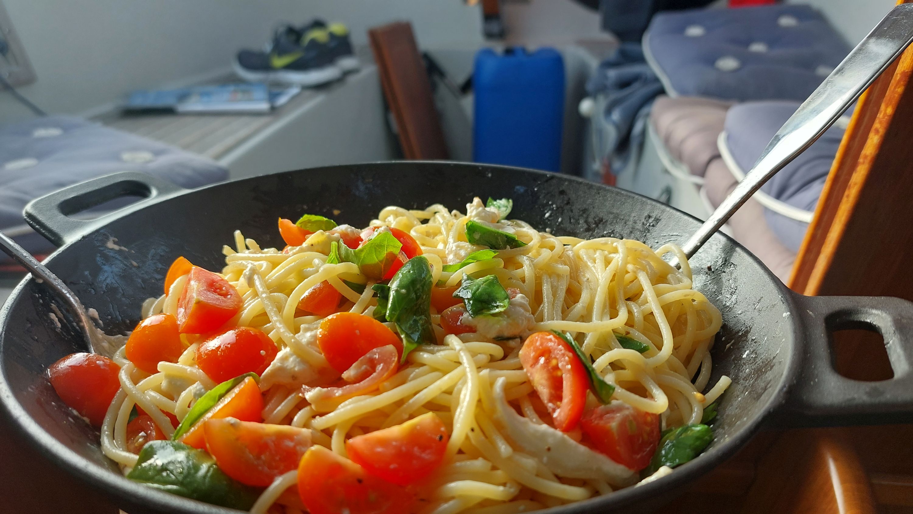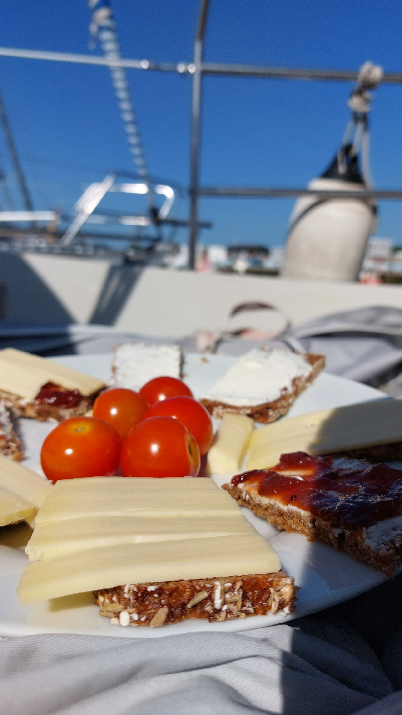 Die meisten wollen wohl heute hierbleiben. Zum Glück gehen aber ein paar wenige Boote morgens bei Hochwasser raus und ich kann mich auf einen freien Liegeplatz verholen. Anschließend Frühstück im sonnigen Cockpit bevor ich die Kuchenbode aufbaue um mich gegen den kalten Wind zu schützen. Ein paar Boote weiter wird gemunkelt, dass wir morgen alle Sonnenbrand und Erkältung haben werden.