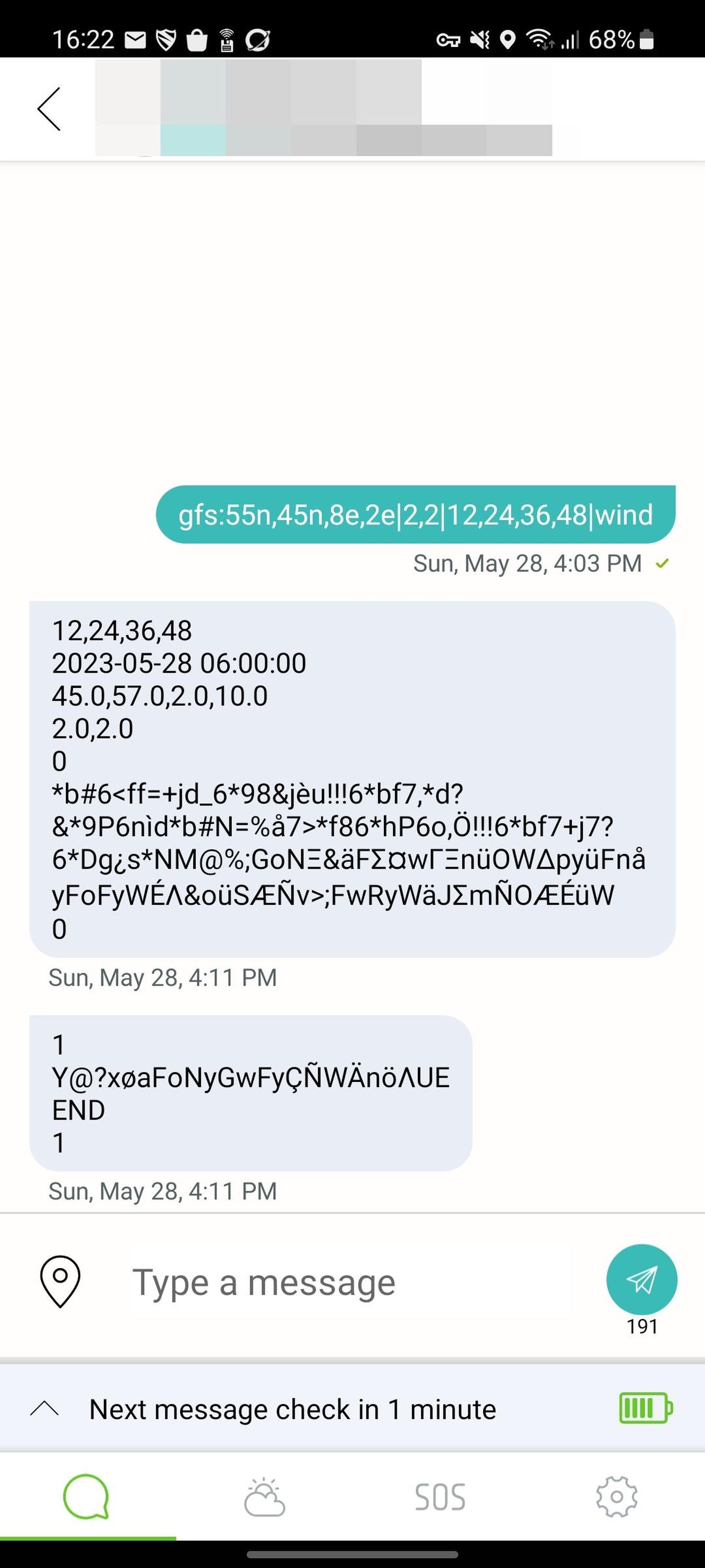 - Die vereinfachten binären GRIB-Daten werden als Text kodiert und bei Bedarf auf mehrere Nachrichten mit maximal 200 Zeichen aufgeteilt. Das ist die maximale Nachrichtenlänge bei Zoleo.