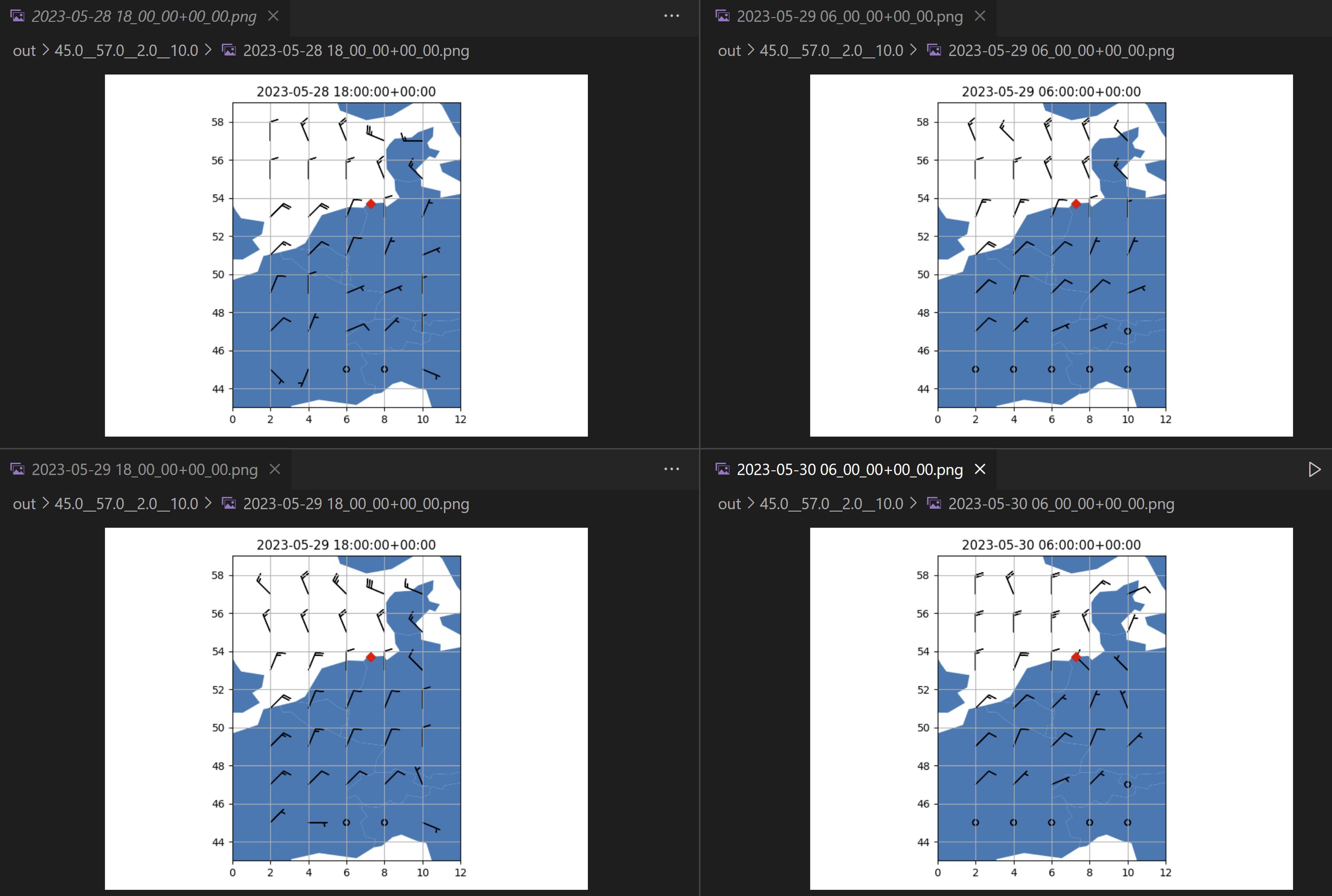 Modell ist GFS, Bereich geht von 55°N 8°E bis 45°N 2°E mit einer Auflösung von 2° in beiden Richtungen und Vorhersagen für die nächsten 12, 24, 36 und 48 Stunden. - Nachdem die Mail eingeht ruft mein Server (der gleiche Server, auf dem mein Blog liegt) die angefragten GRIB-Daten ab und vereinfacht diese. Windgeschwindigkeiten werden auf fünf Knoten gerundet, Windrichtungen auf sechzehn Richtungen.