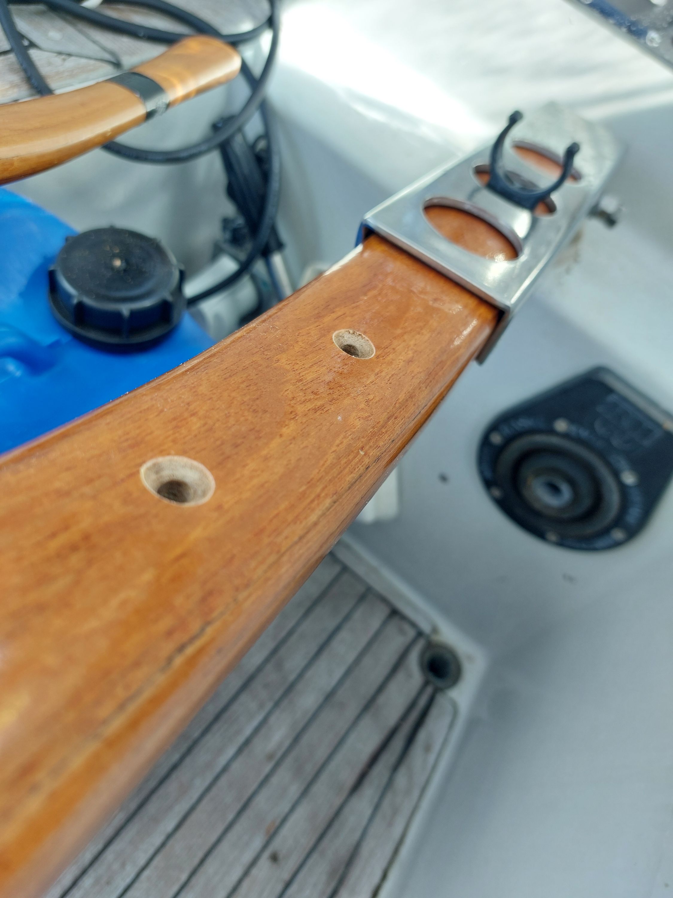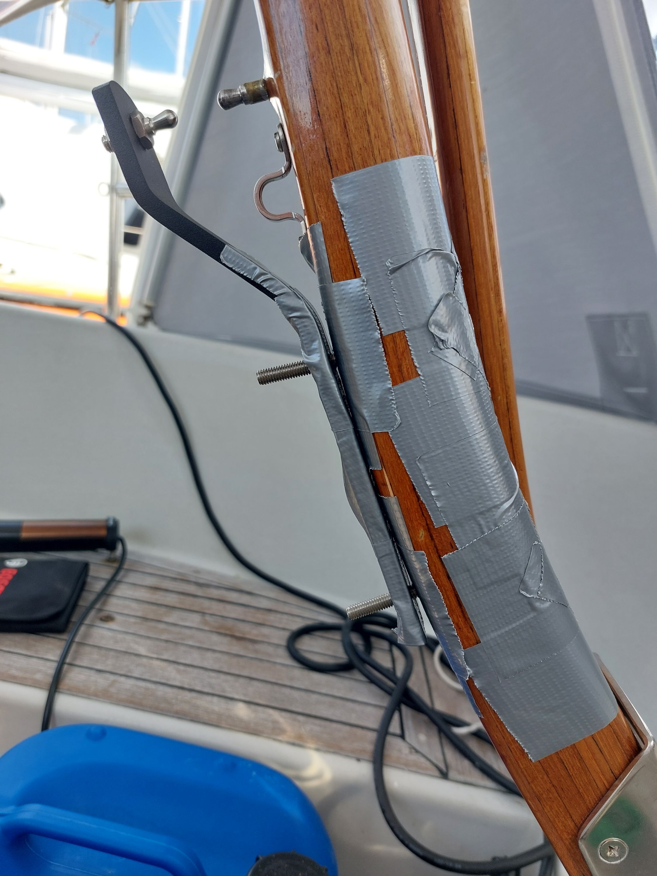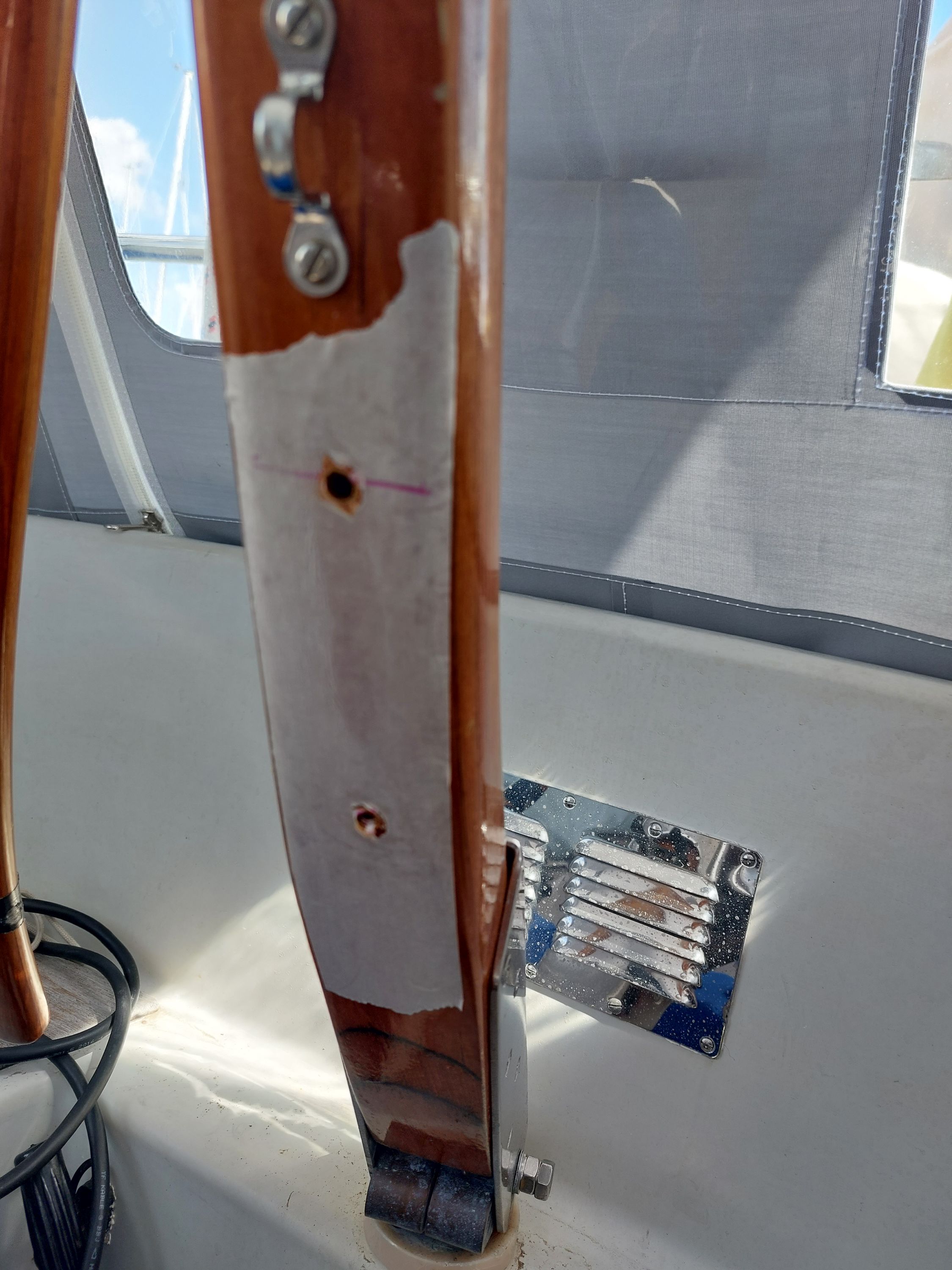 Sonntag wollte ich nach Helgoland und ein paar Tage später von dort nach Norderney. Der Umweg resultiert in zwei kürzeren Schlägen als der direkte Weg von Cuxhaven nach Norderney und macht mir das abpassen der Gezeiten deutlich einfacher. Jetzt kündigt sich aber kräftigerer Wind aus nördlichen Richtungen für die nächsten Tage an. Das ist zwar auf Helgoland kein Problem, das Passieren des Seegatts vor Norderney empfiehlt sich dann aber nicht unbedingt. Zumindest für einen Revierneuling wie mich. Die Gefahr von Grundseen oder in der Brandung übersehenen Tonnen ist mir zu groß. Zum Pfingstwochenende auf Helgoland festzuhängen, wenn die Flotte der Nordseewoche dort einfällt möchte ich aber auch nicht. Also bleibe ich noch ein paar weitere Tage in Cuxhaven. Das gibt mir auch genug Zeit, die Halterung für meinen Pinnenpiloten an der Pinne zu montieren. Das Winkelblech mit der Aufnahme für den Pinnenpiloten wird mit zwei Bolzen durch die Pinne hindurch verschraubt. Die Bolzen werden in Epoxy eingesetzt und das soll fünf Tage ruhen bevor Last drauf kommt.