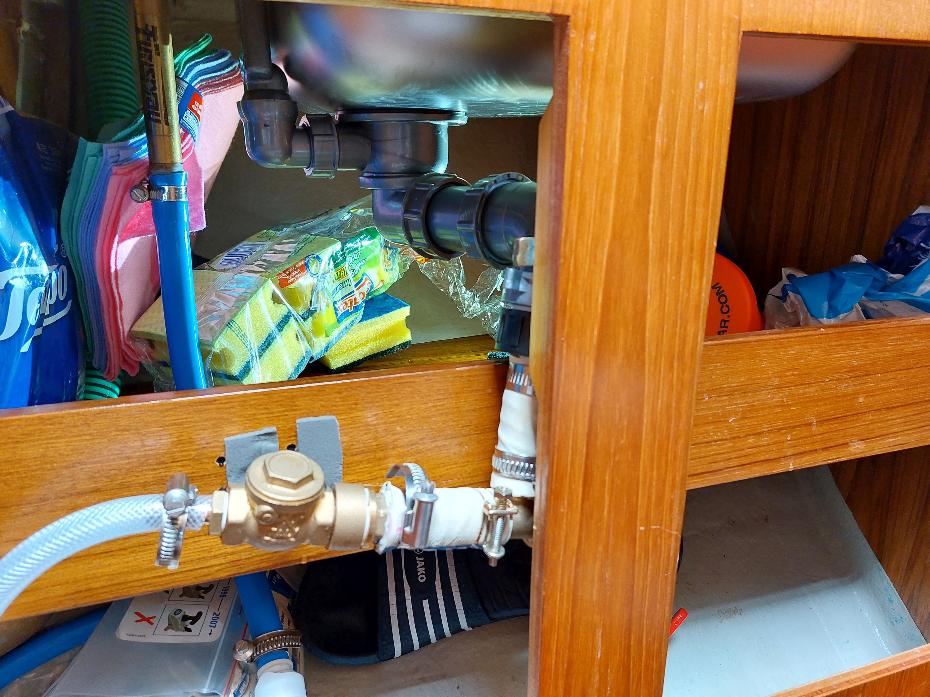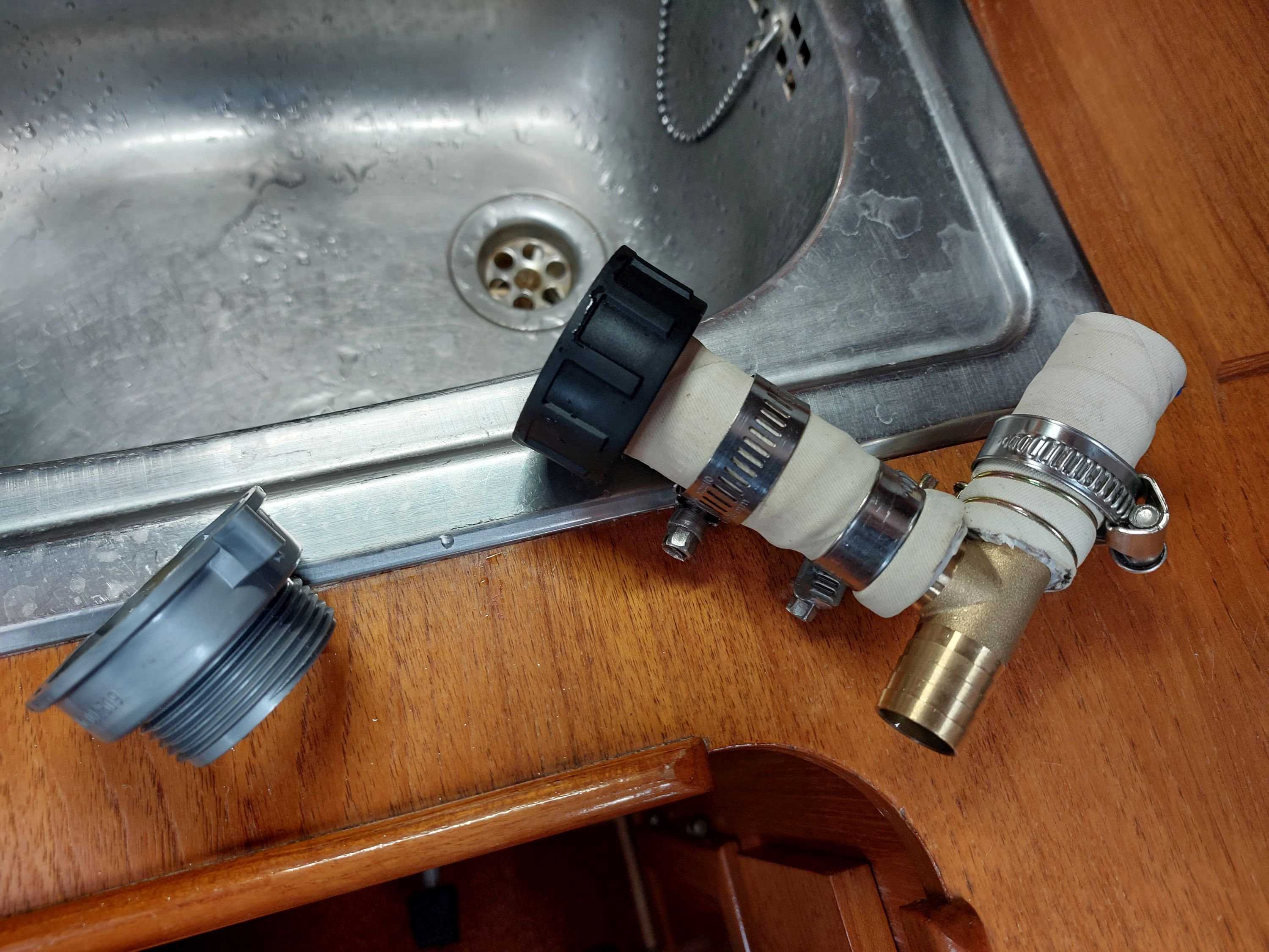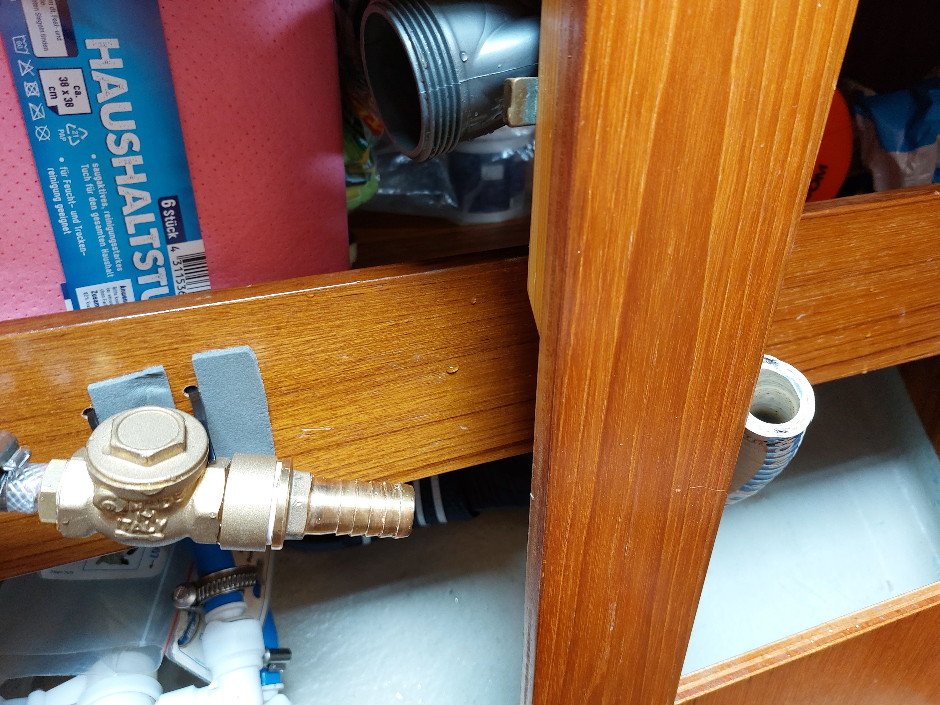 Die nächsten Tage läuft es aber wieder andersherum. Als erstes mache ich mich an das undichte Waschbecken. Direkt abnehmen kann ich die Kunststoffteile vom Ablauf leider nicht weil auf dem engen Raum unterm Waschbecken auch noch die Salzlake des Wassermachers mit eingespeist wird. Die wird über den gleichen Borddurchlass entsorgt. So wird das ein ganz schönes gefummel und hin und her. Ein halbes Dutzend Schlauchschellen öffnen, Schläuche abziehen, Kunststofffittinge auseinandernehmen, Teflonband um die Gewinde wickeln, und schließlich alles wieder zusammenbauen. Das ganze dann noch ein zweites Mal weil ich mit dem Teflonband zu sparsam war für die groben Plastikgewinde. Und noch ein drittes Mal, weil es an anderer Stelle, direkt unter dem Auslauf des Beckens auch noch tropft. Doch dann ist es geschafft! Ich lasse zum Schluss noch einmal zwei Stunden lang das Waschbecken bei verschlossenem Seeventil voll Wasser stehen und alles bleibt trocken.