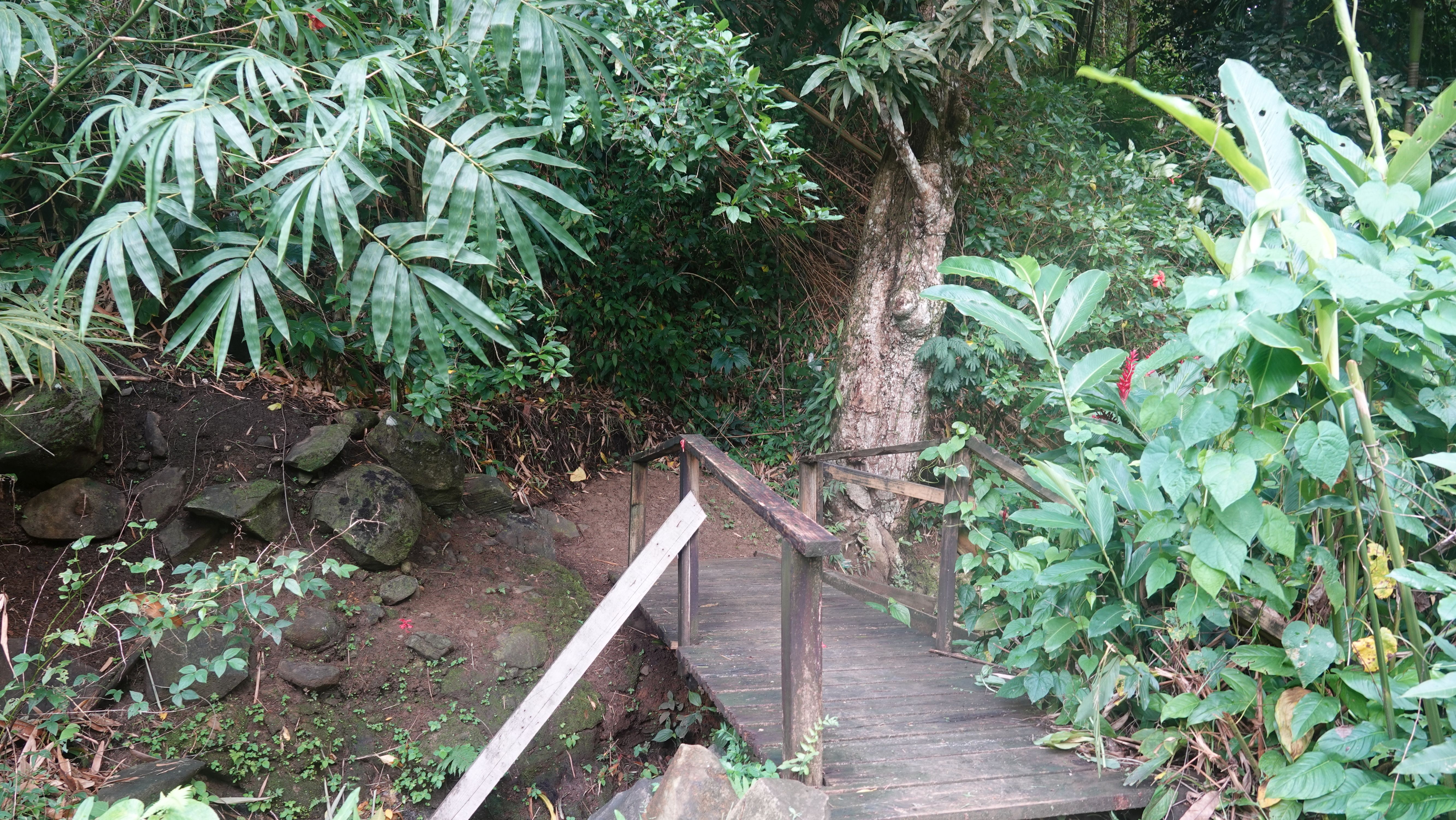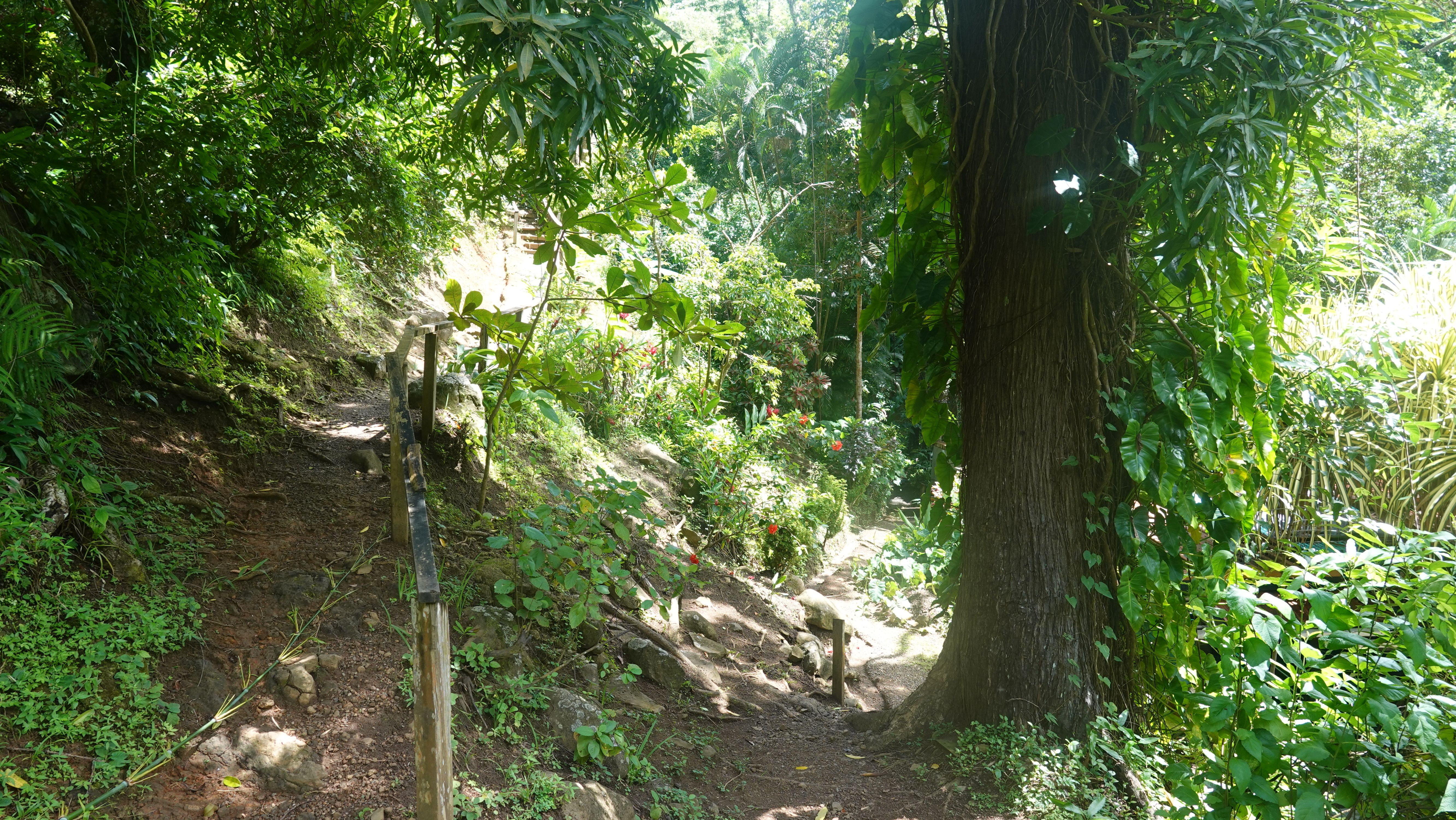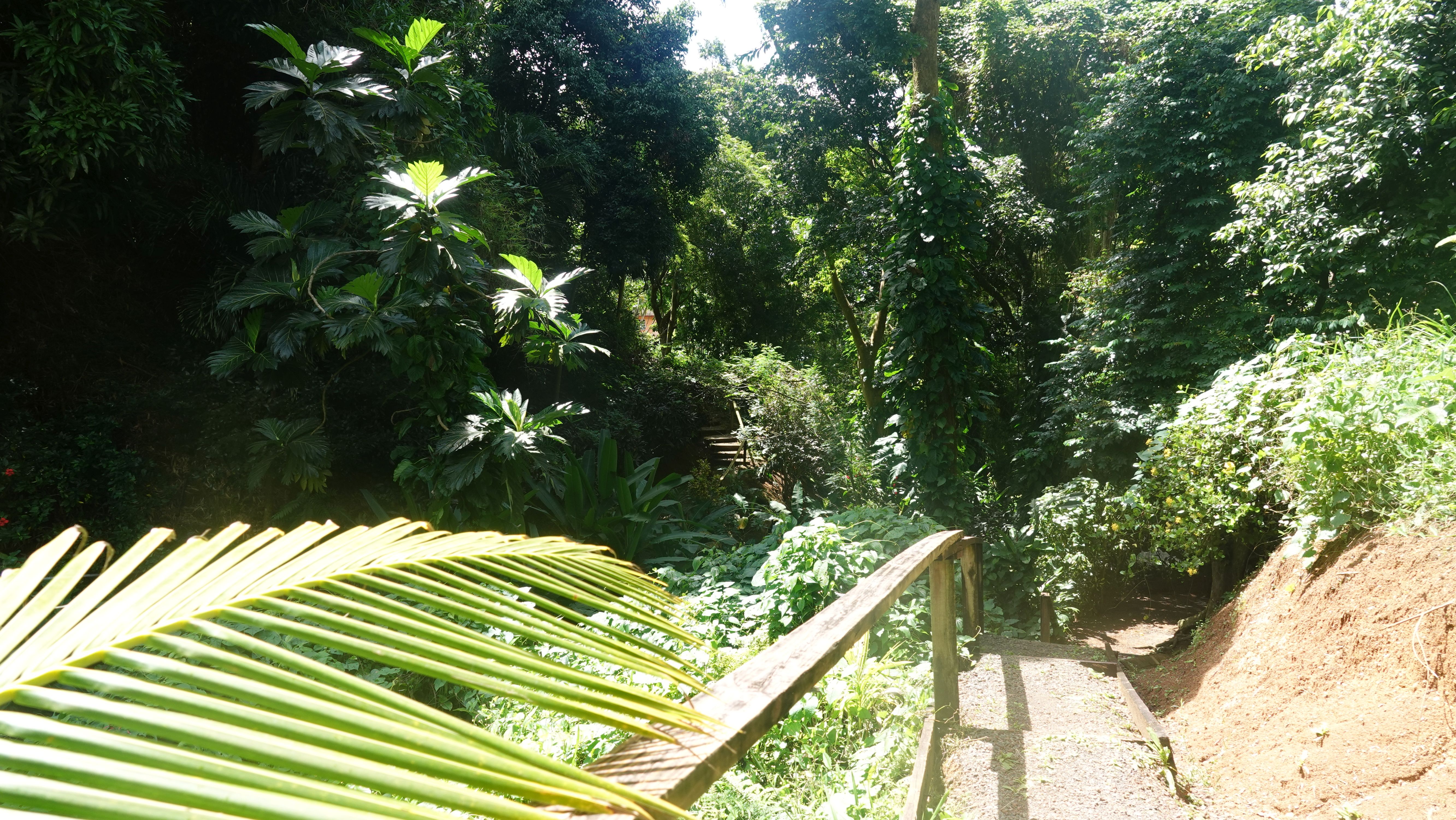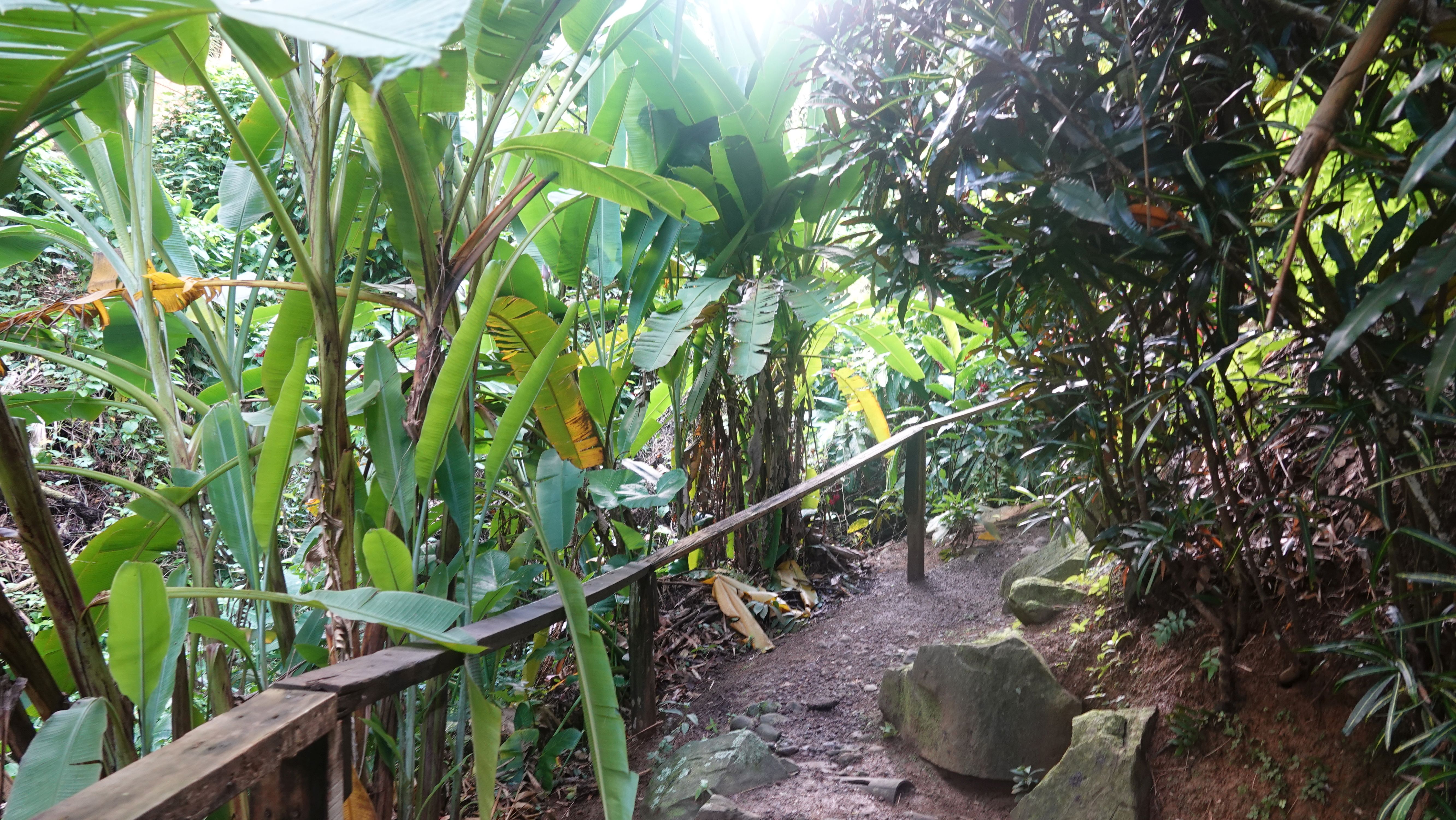 Es gibt einen betonierten Weg direkt runter zum Wasserfall, aber ich entscheide mich für den Wanderweg durch den tropischen Garten. Unbeschreiblich dichtes und kräftiges Grün.