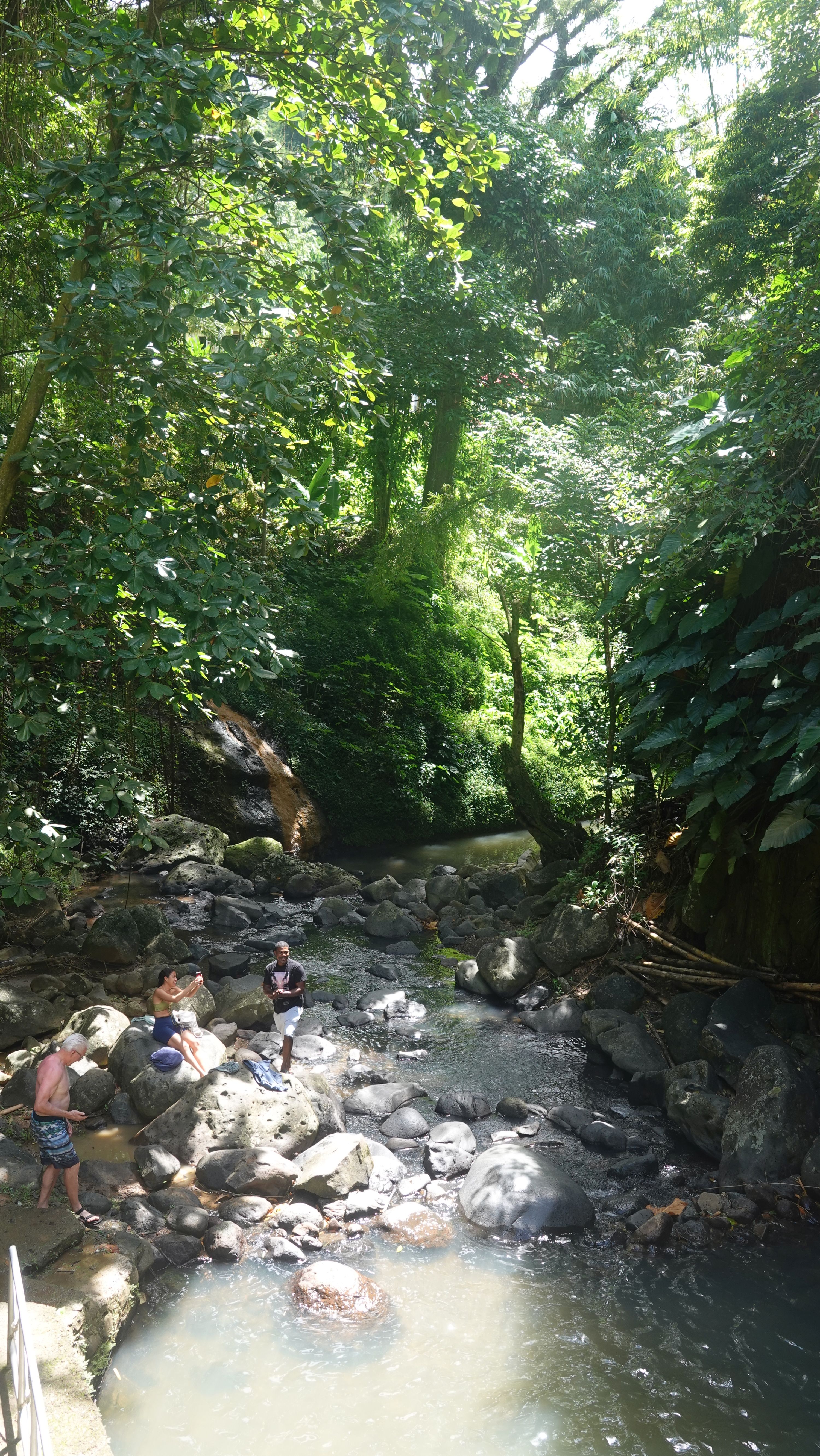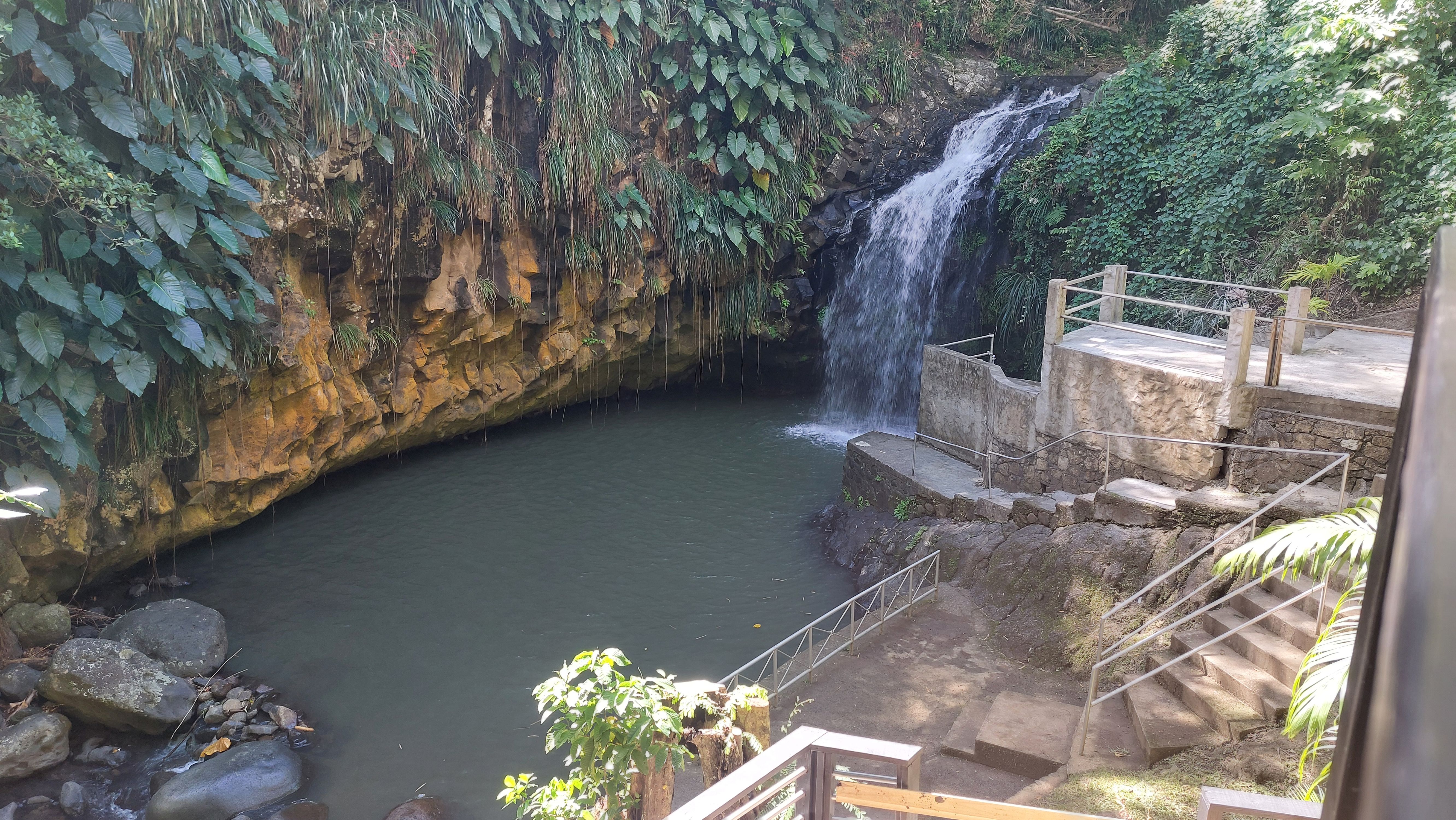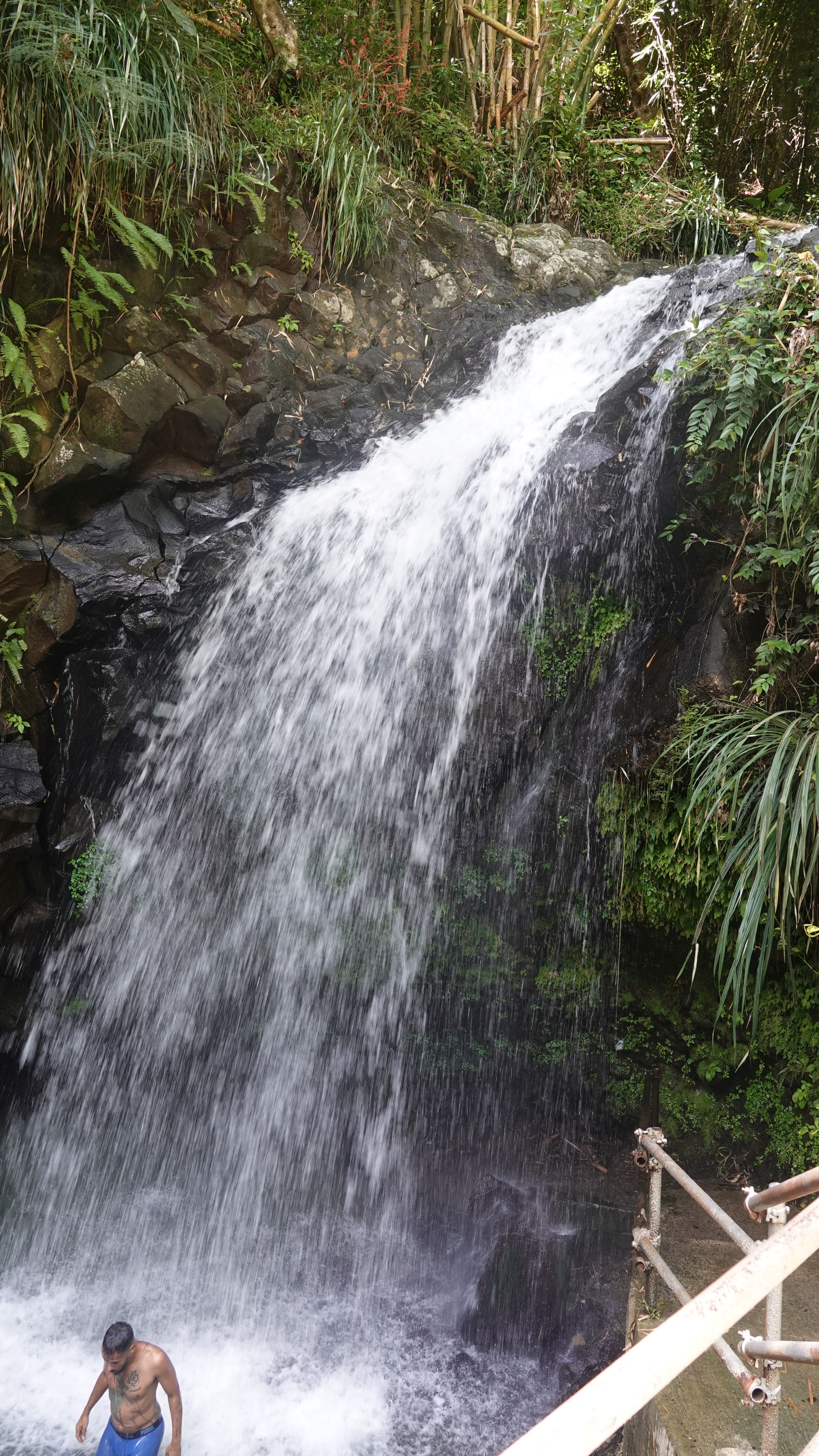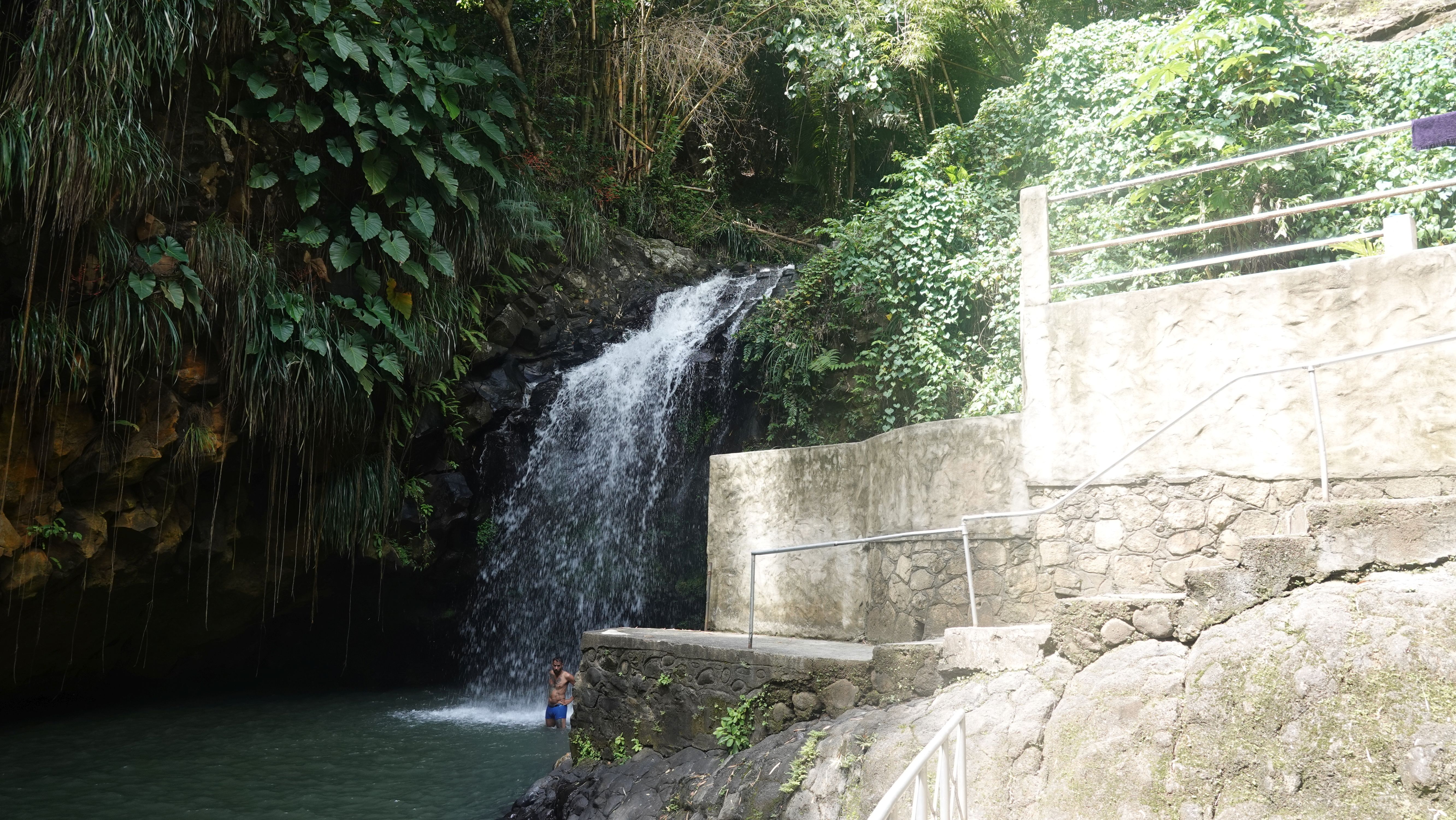 Natürlich kann ich es mir nicht entgehen lassen, hier schwimmen zu gehen. Der Pool ist überwiegend flach mit einem tiefen Loch kurz vor dem Wasserfall. Das Wasser ist eine ganze Ecke frischer als die Karibik, aber immer noch deutlich wärmer als alles was ich von der Ostsee gewöhnt bin. Also nichts wie rein und ab unter den Sturzbach.