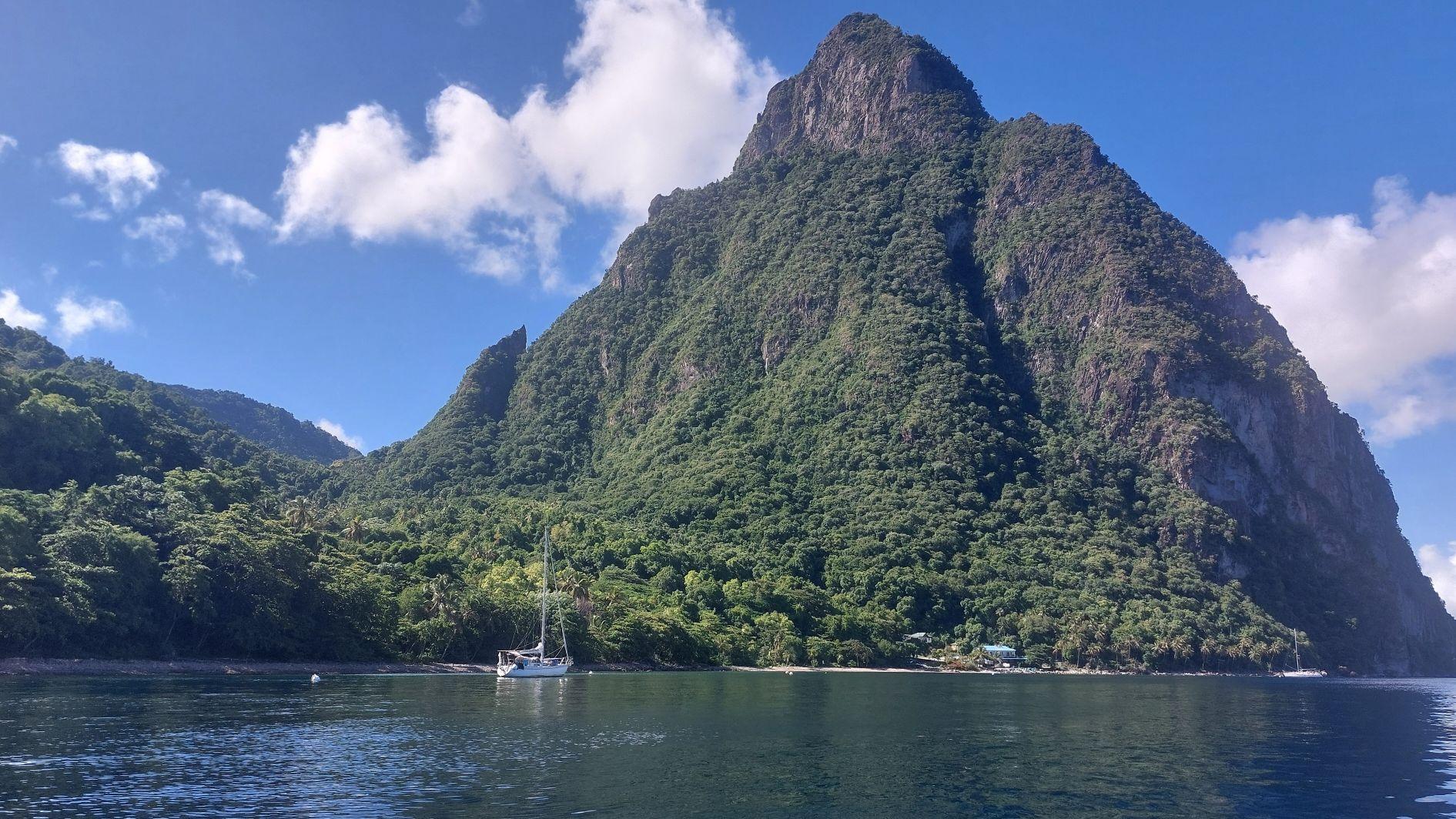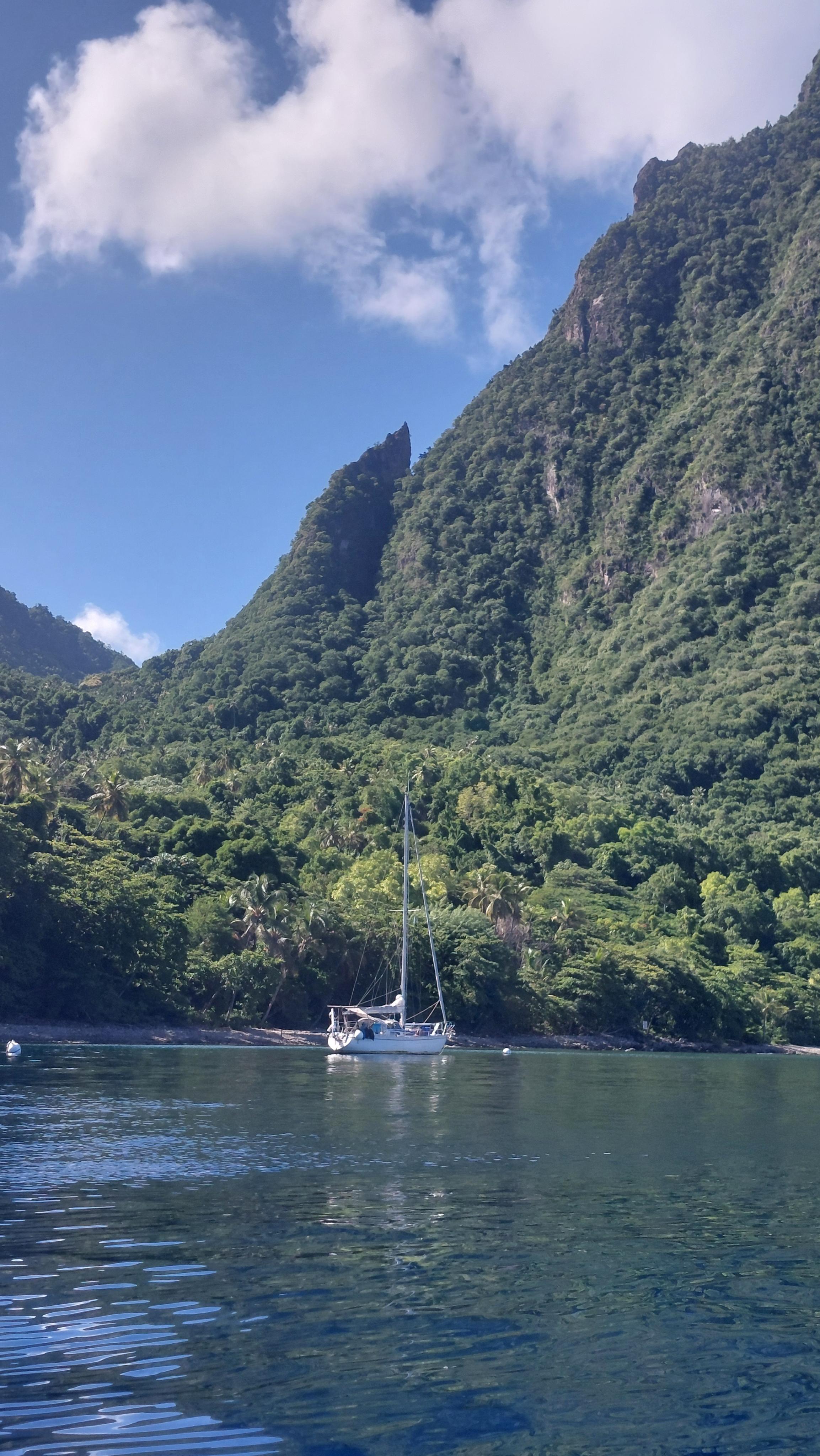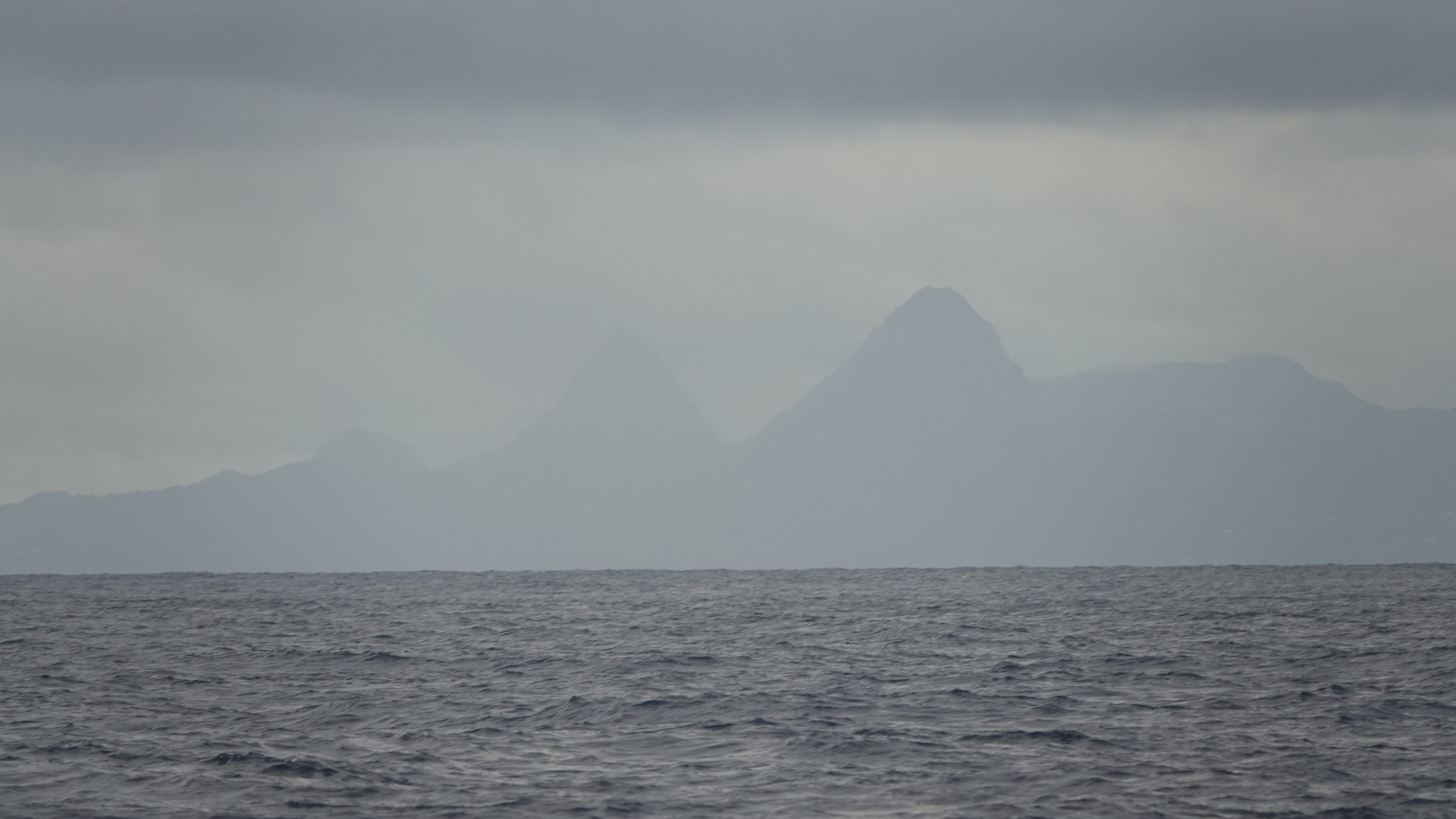 Die ersten paar Meilen merkt man den Einfluss der Pitons. Es gibt kaum Wind, der Hauch der da ist kommt aber aus allen Richtungen im ständigen Wechsel. Erst nach einer guten Stunde wird es etwas beständiger und es ist möglich länger als zwei Minuten am Stück zu segeln.