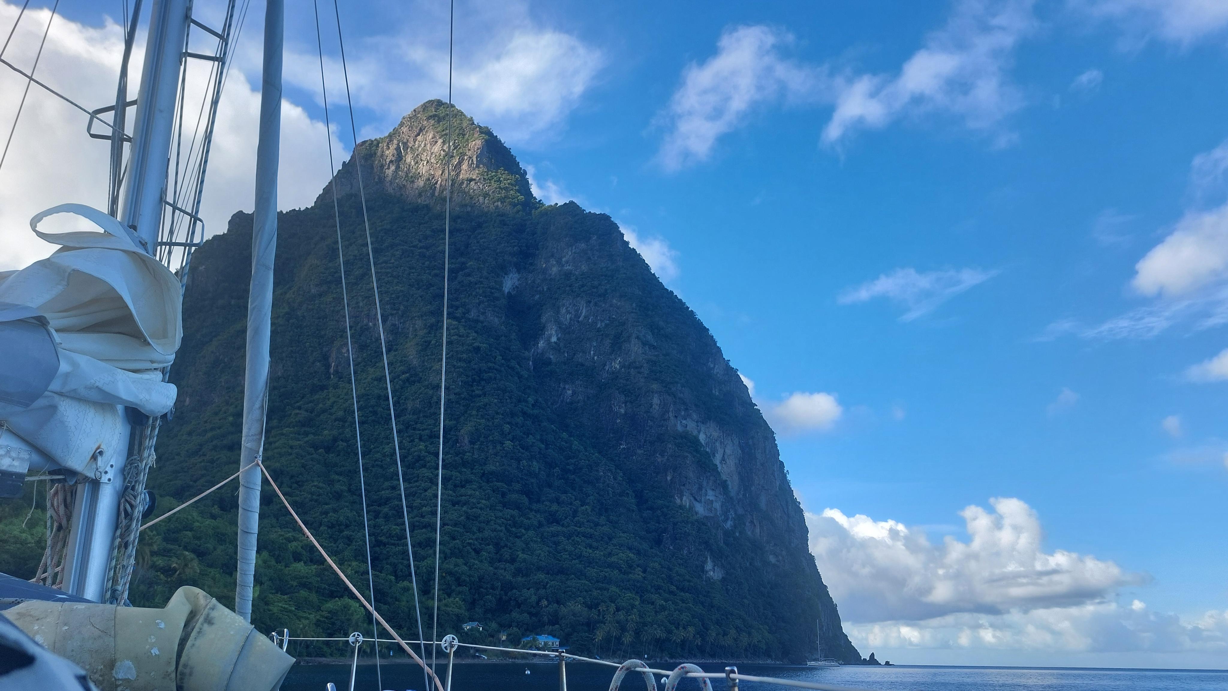 Mit "Hilfe" (für EC$10) eines Boat Boys angel ich mir eine Boje vor der beeindruckenden Kulisse der Pitons. Diesmal aber nicht zwischen den beiden Gipfeln, sondern dichter am Ort. Ich habe nur mein Paddelboard um zu den Behörden zu kommen. Und auch von hier am Malgretoute Beach im Norden des Petit Pitons ist es noch eine gute halbe Meile.