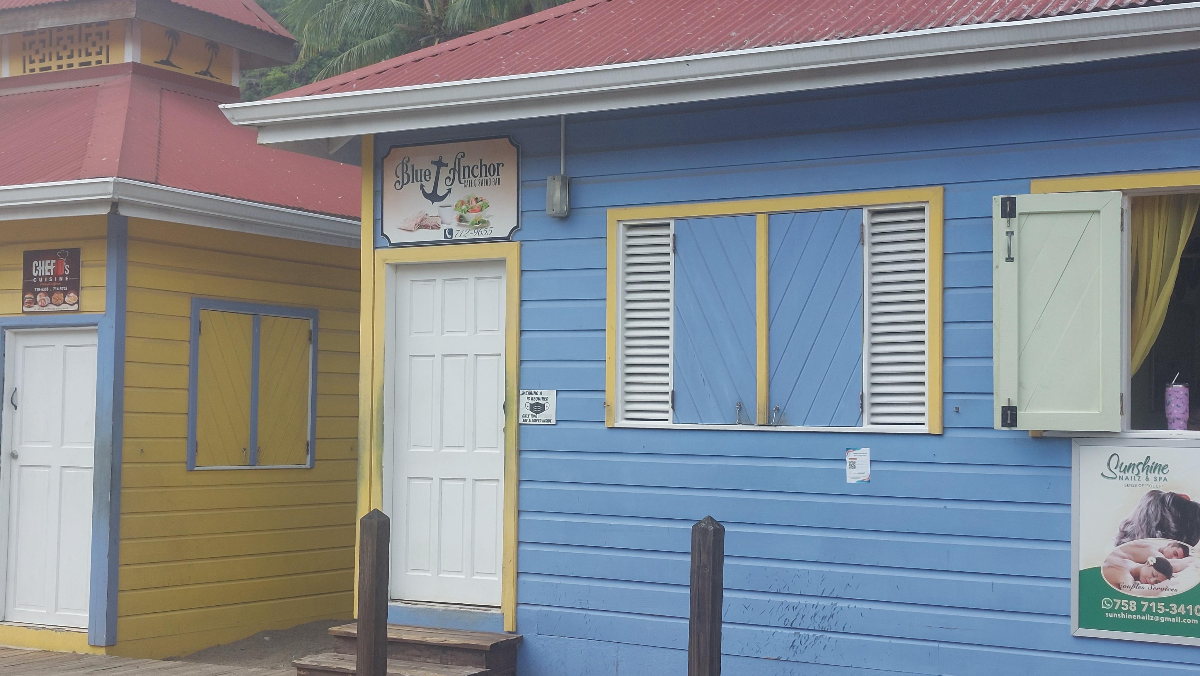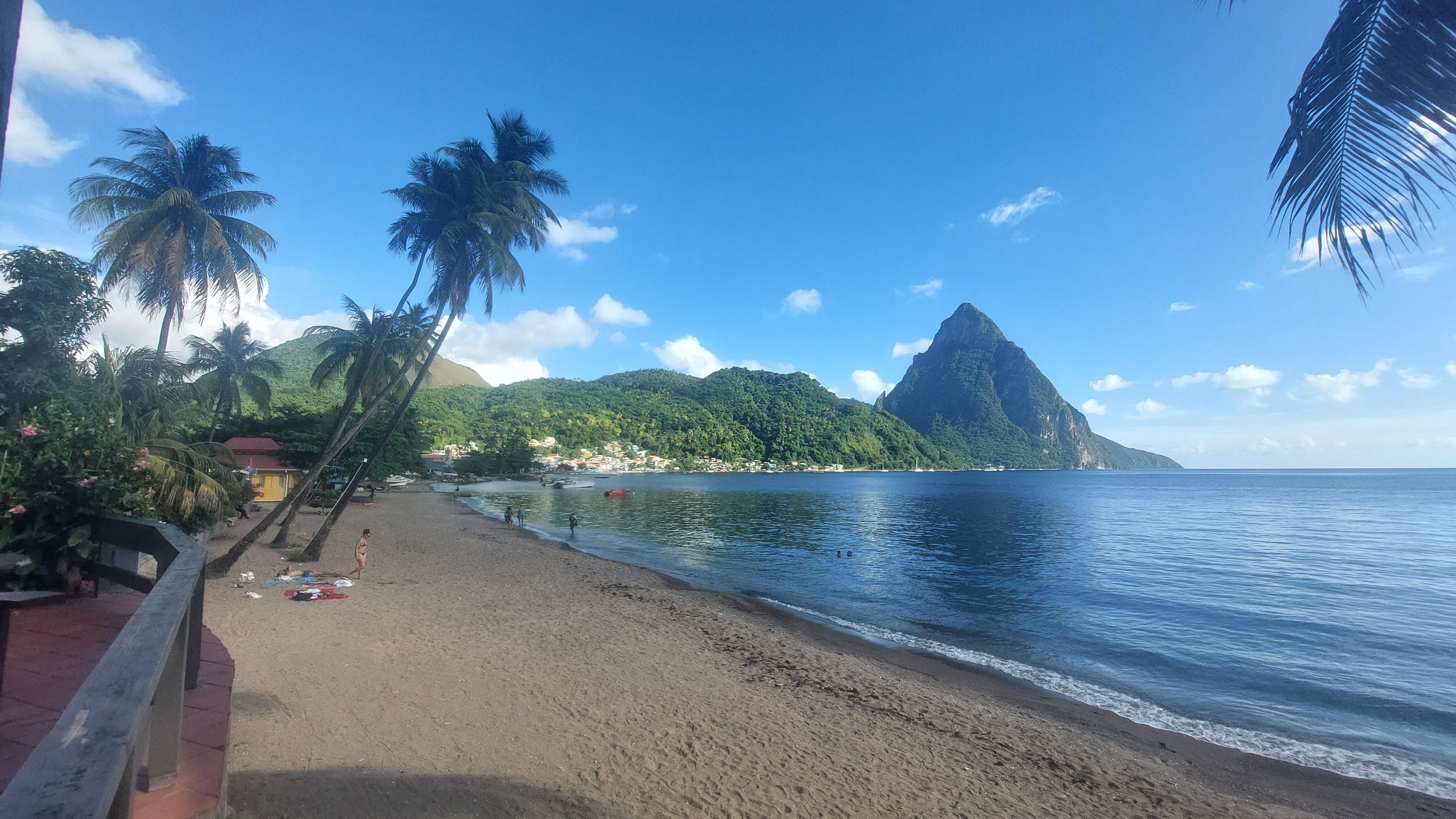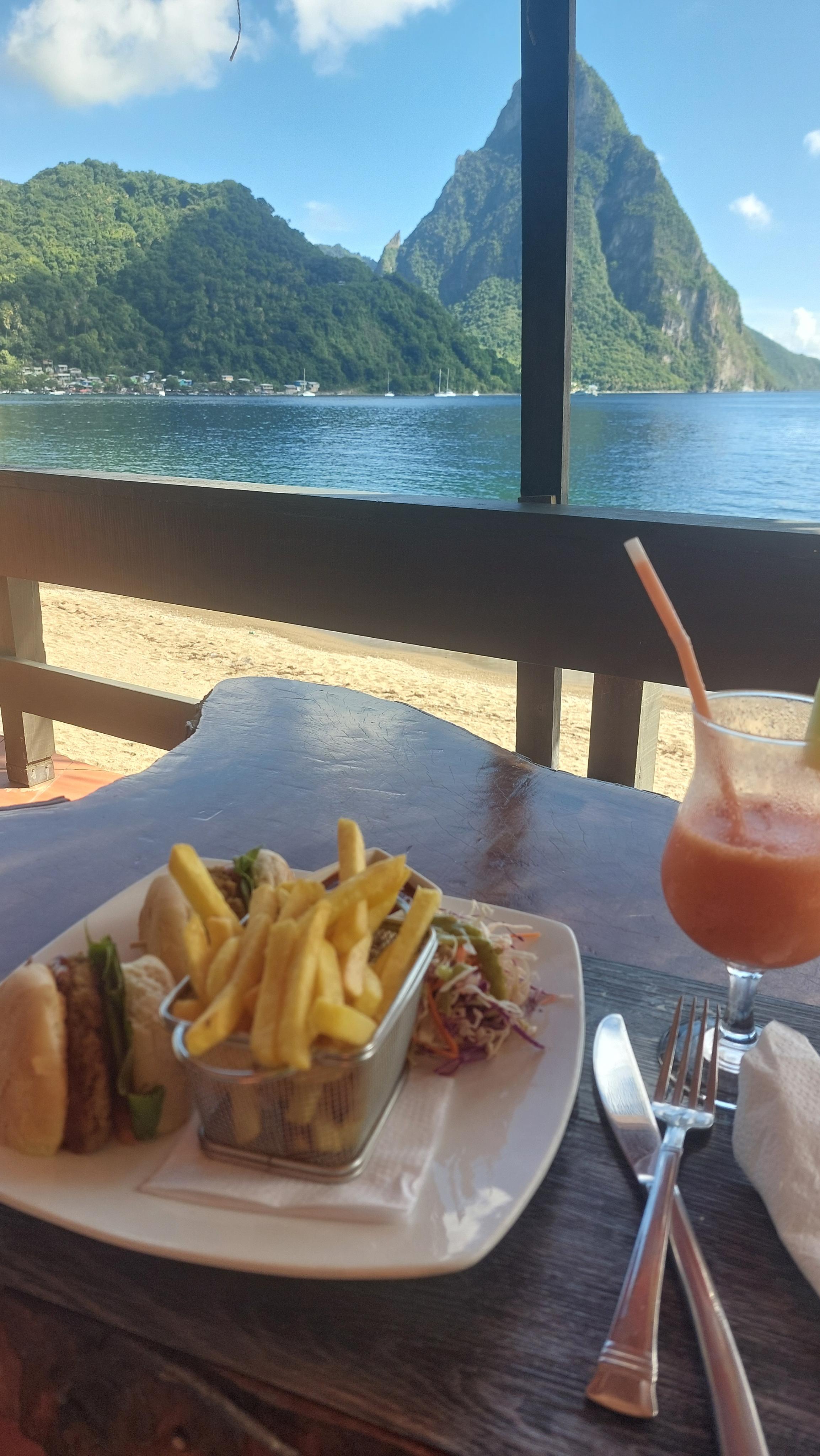 Anschließend besuche ich noch einmal den Strand, an dem wir Anfang des Jahres einige Male zum Baden waren. Der Blue Anchor Imbiss mit den köstlichen Wraps und Plantanenchips hat leider geschlossen. Ich bekomme einen köstlichen Burger und leckere Smoothies beim Seashell Restaurant überm Strand mit tollen Blick auf den Petit Piton und (ganz klein in der Ferne) Lua.
