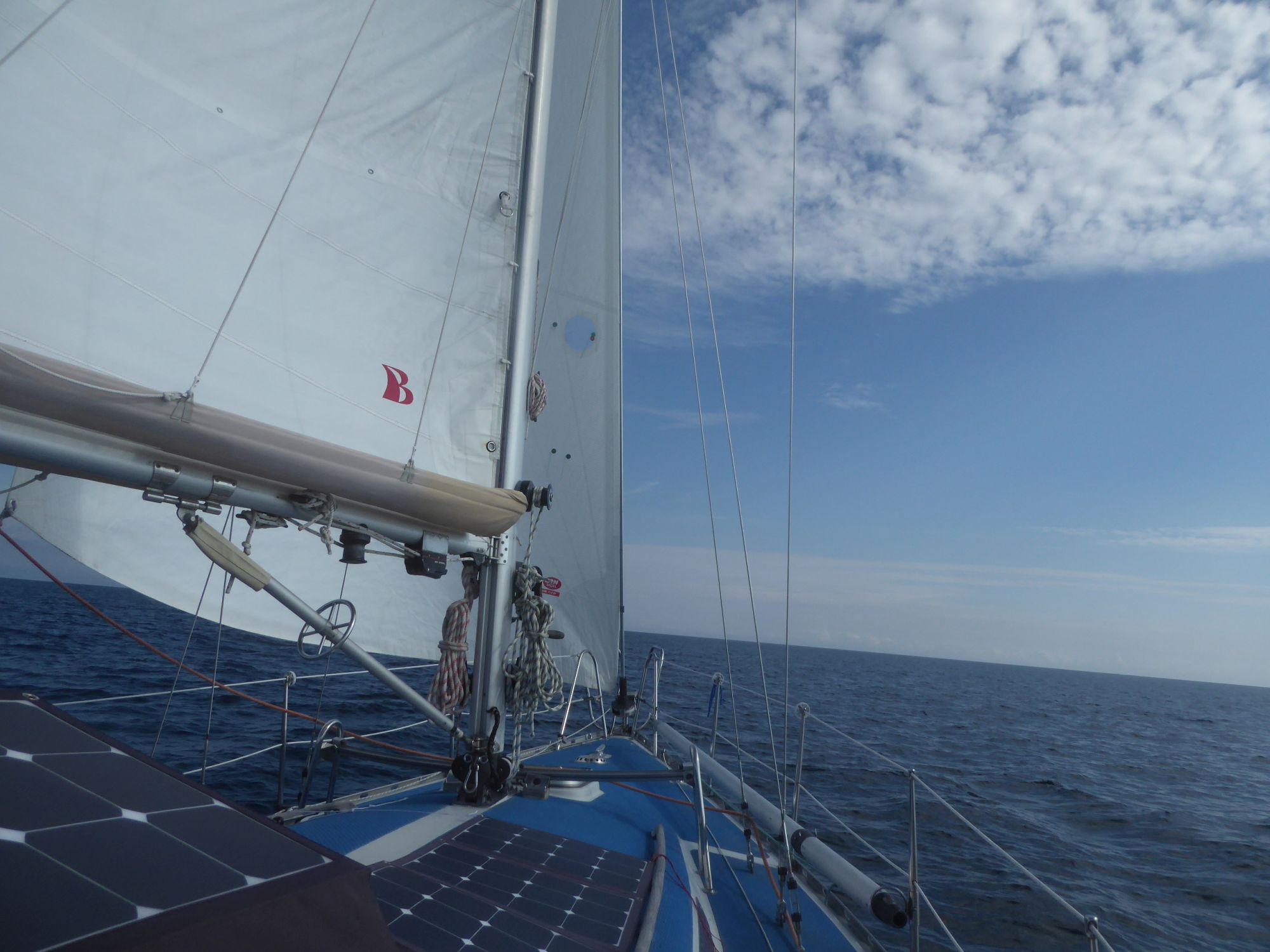 Ein paar Meilen weg von der Küste lässt der Wind nach und dreht auf Ost bis Nordost. Nicht so günstig für das heutige Ziel, aber noch lässt es sich schön segeln.