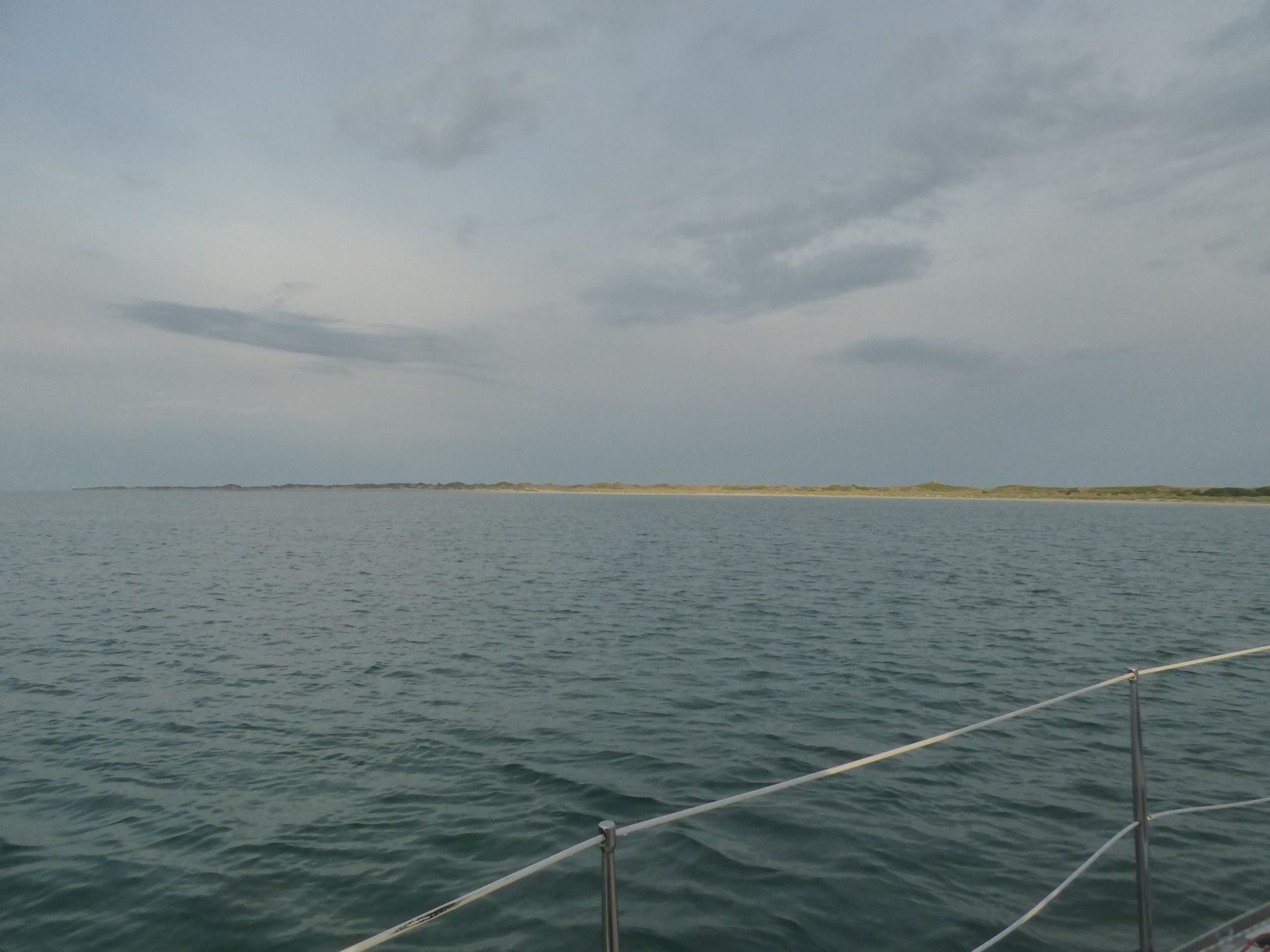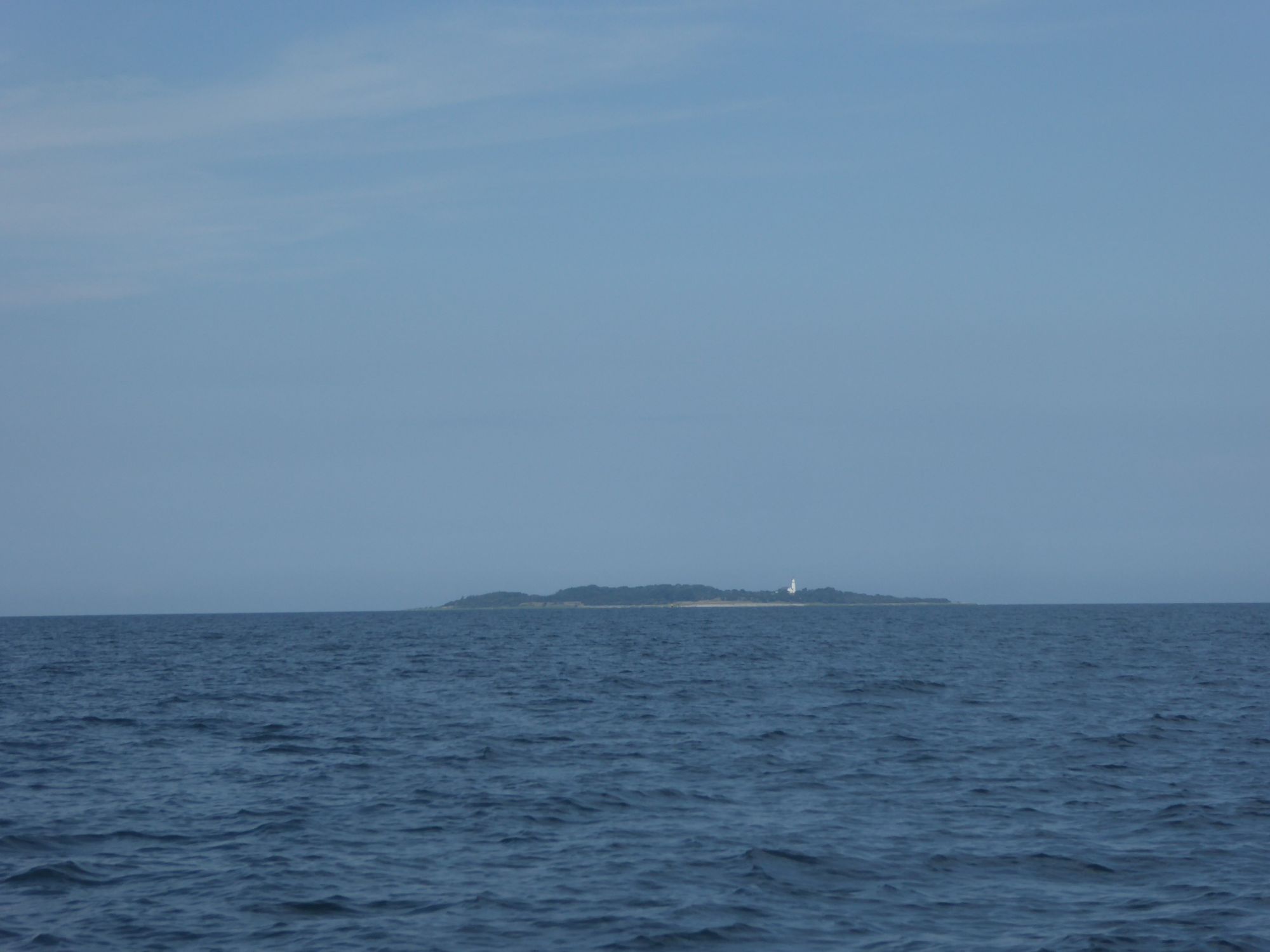 Als die Sicht wieder etwas besser wird und Anholt wieder schemenhaft in der Ferne zu erkennen ist gehe ich wieder auf meinen alten Kurs. Es regnet noch, aber der Wind ist jetzt vollständig eingeschlafen und ein Versuch wieder zu segeln bringt keinen Erfolg.