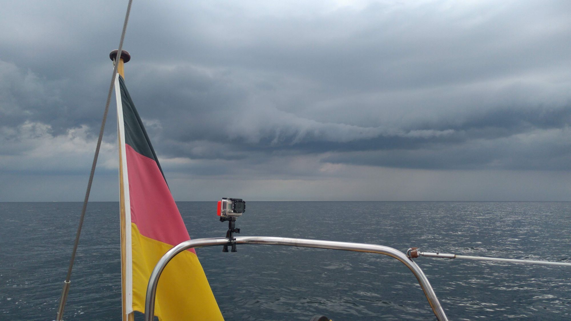 Etwa zehn Meilen vor Anholt rollt von Süden eine gewaltige Gewitterwolke an. Die Wolkenwalze streckt sich zu beiden Seiten bis zum Horizont.