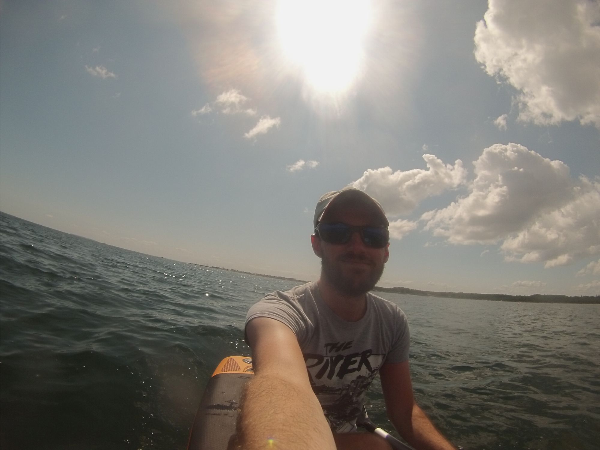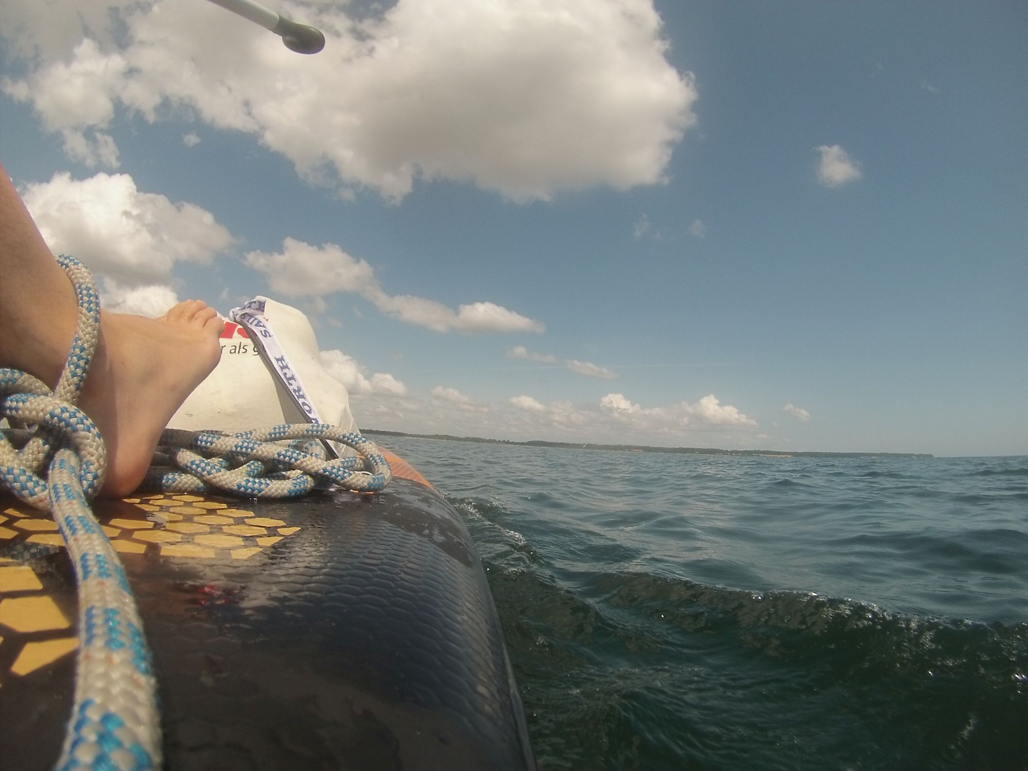 Montag lässt der Wind nach, es ist gleich wesentlich angenehmer. Am Mittag mache ich mich auf den Weg zum Einkaufen. Eine knappe Meile paddel ich über die Bucht zu dem kleinen Strand zwischen den beiden Hafenbecken. Auf halber Strecke schaut mir ein Seehund entgegen. Um den neugierigen Beobachter nicht zu verschrecken halte ich still, er kommt aber nicht näher. Als ich schließlich weiter paddel taucht er ab und nimmt Reißaus.