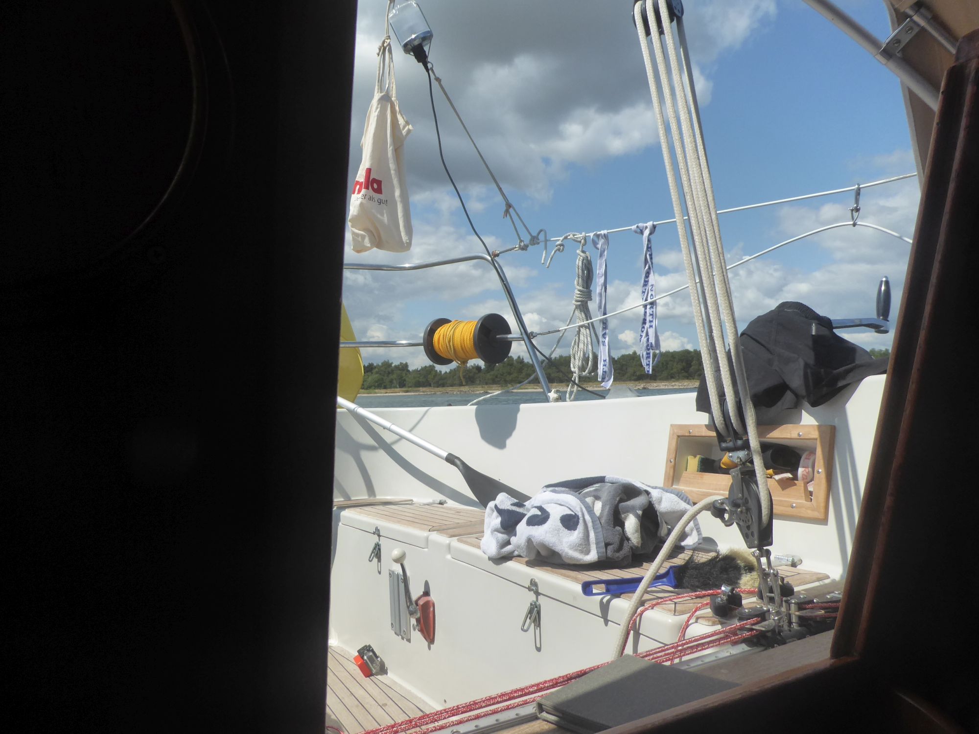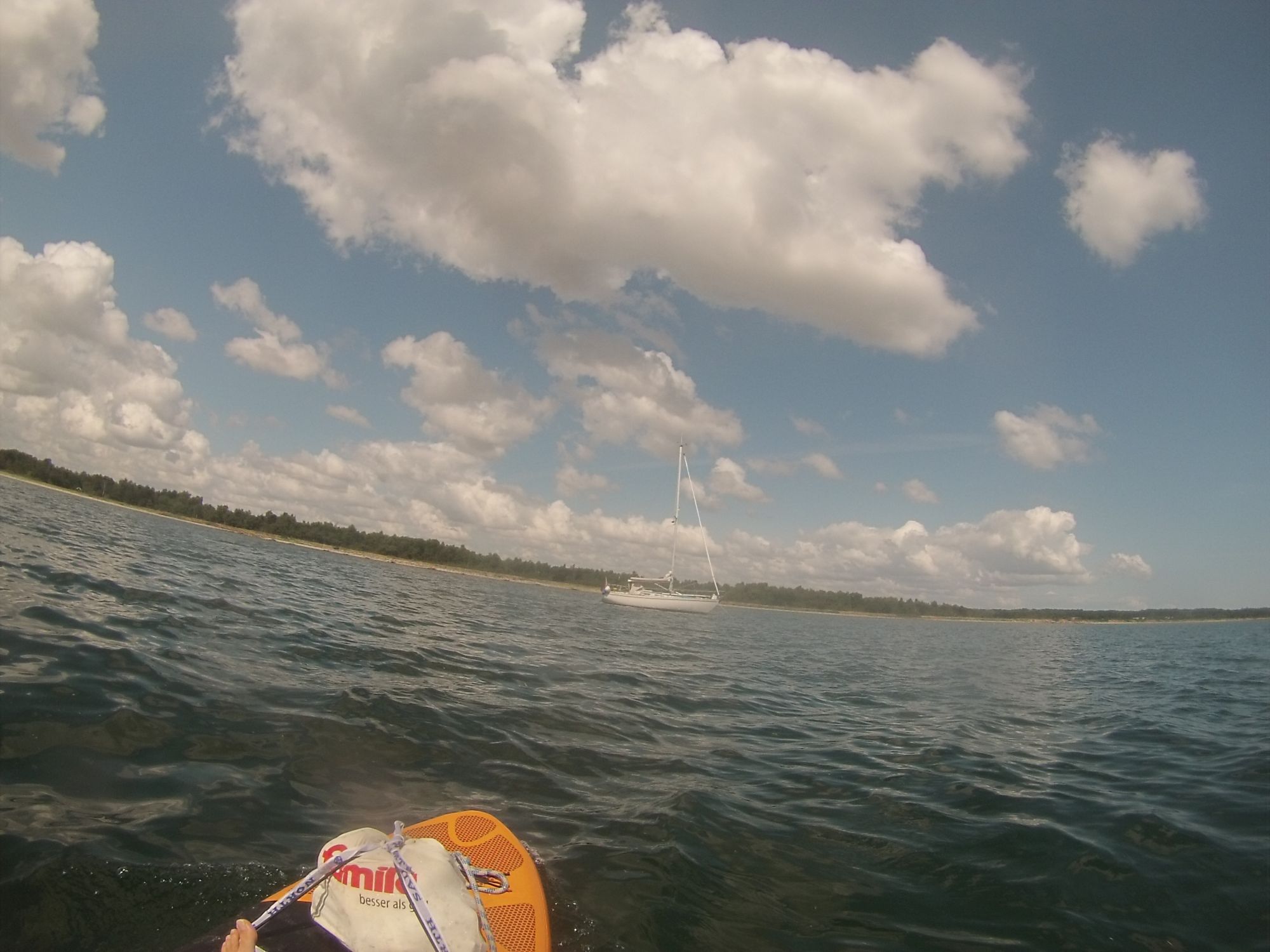 Am nächsten Tag hängen dicke, dunkle Wolken im Osten. An meinem Ankerplatz ist es zum Glück zumindest morgens noch einigermaßen sonnig. Das ist am frühen Nachmittag dann leider auch vorbei. Die Luft ist zwar angenehm warm, aber der Wind wieder so frisch, dass es mich unter Deck treibt.