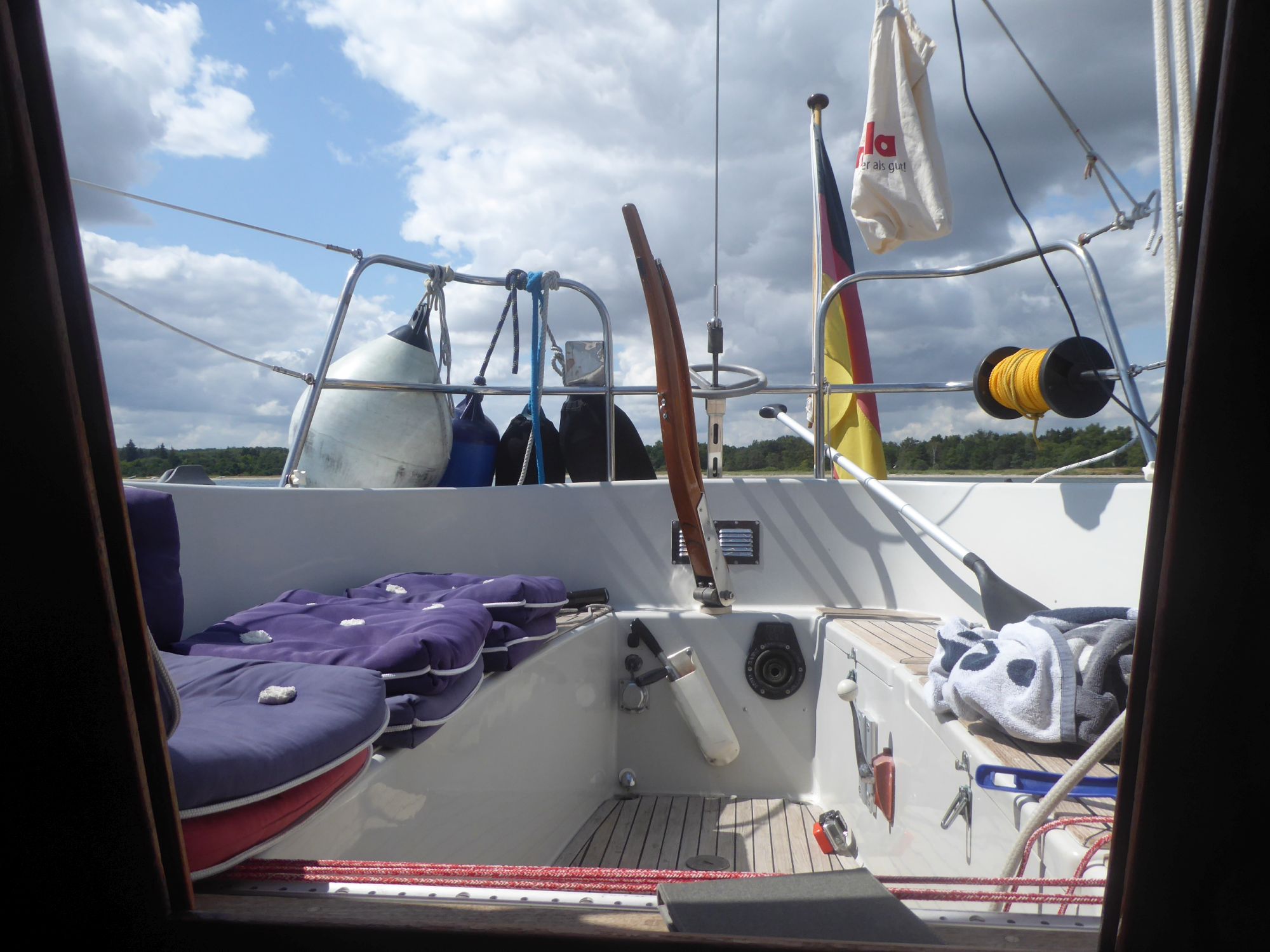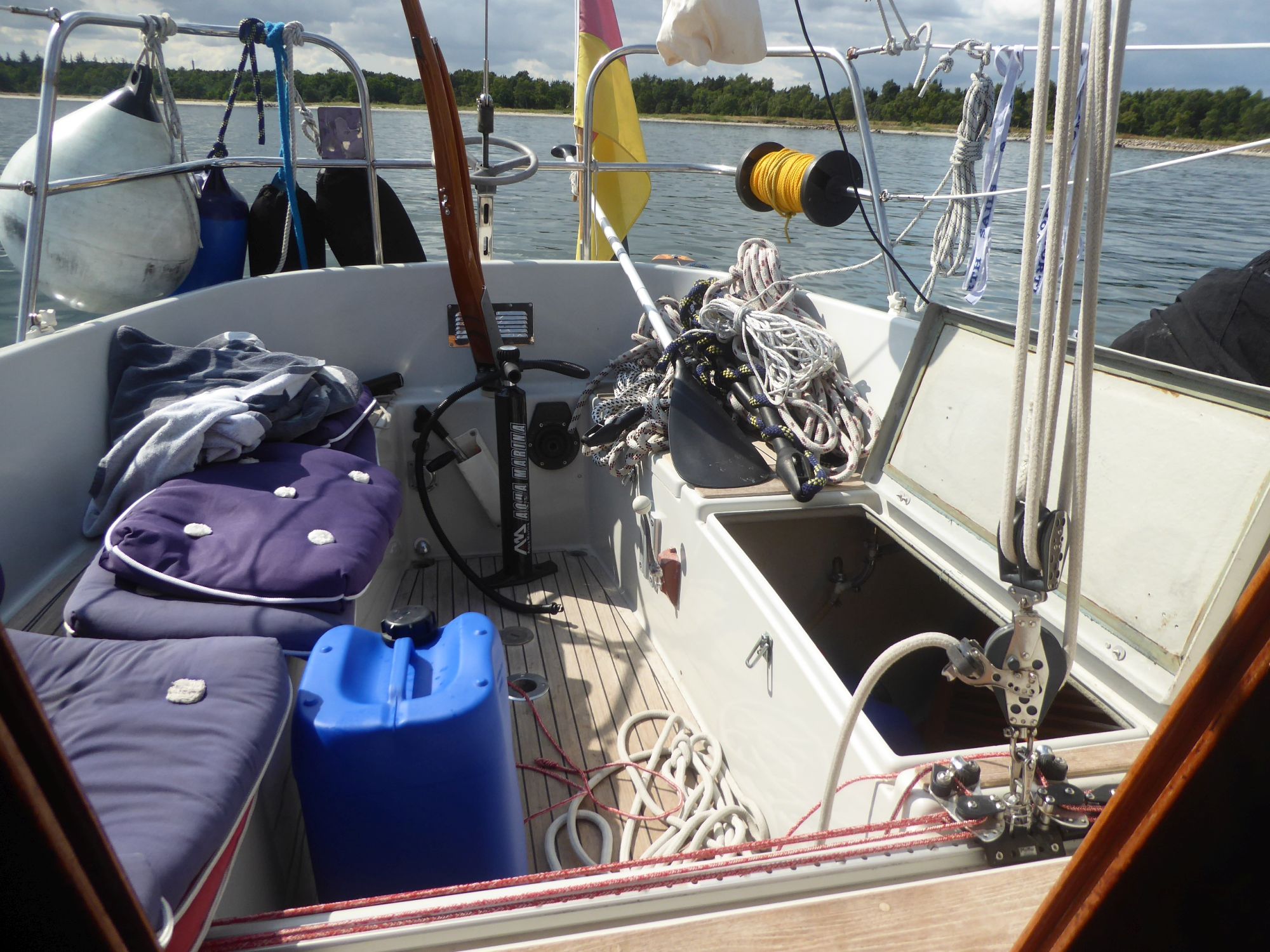 Am Nachmittag ist der Wasserkanister leer. Ich räume die halbe Backskiste aus um den nächsten Kanister herauszuwühlen. Der leere wird stattdessen verstaut, dann kann alles wieder obenrauf.