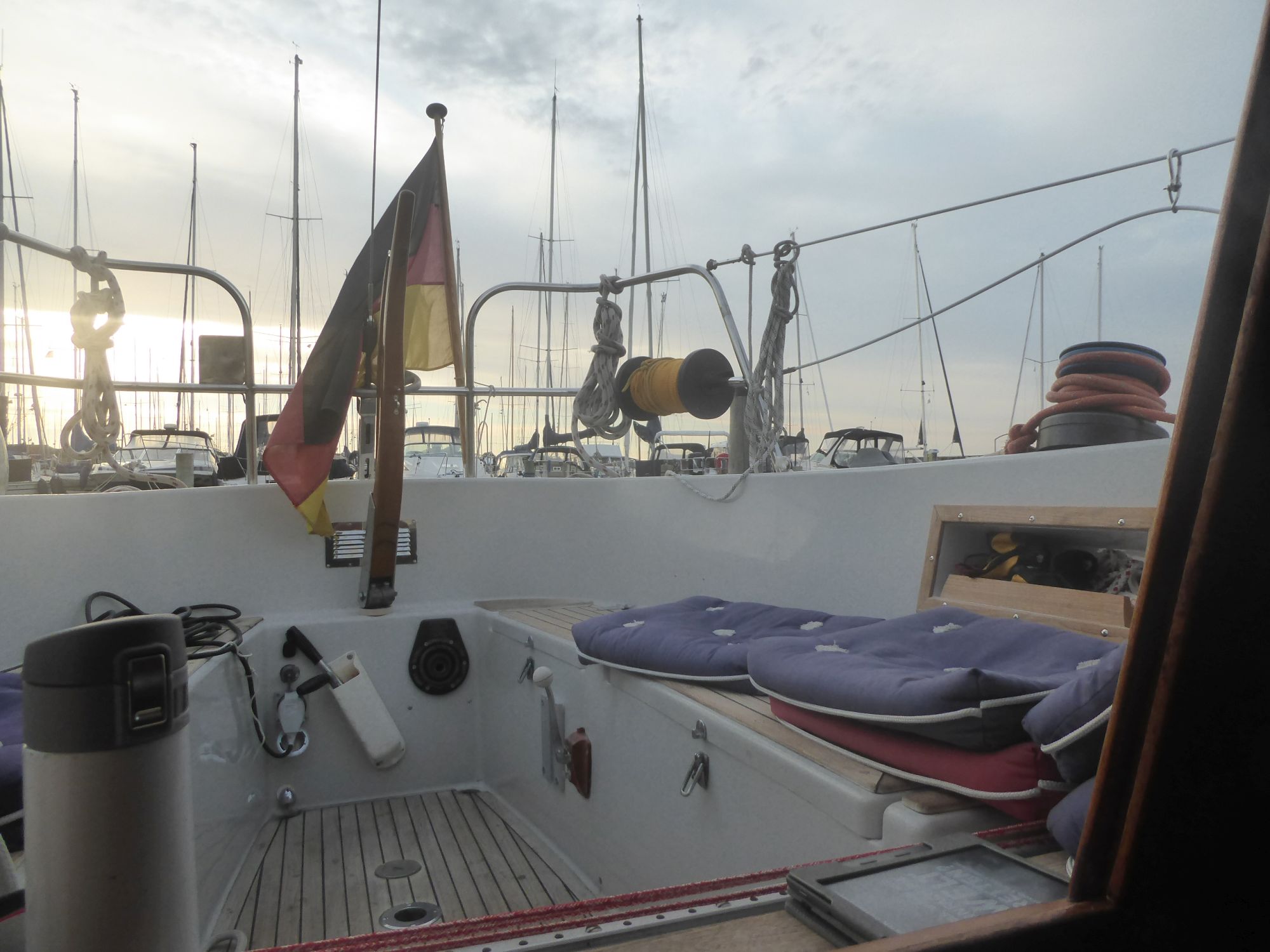 Nach Trompetenkonzert und Flaggenparade verstaue ich alle Cockpitpolster und stecke zum ersten Mal die Schotten in den Niedergang. Der Wind kommt genau hintenrein und für die Nacht ist Regen angekündigt. Der fängt dann auch um zehn Uhr an zu plattern.