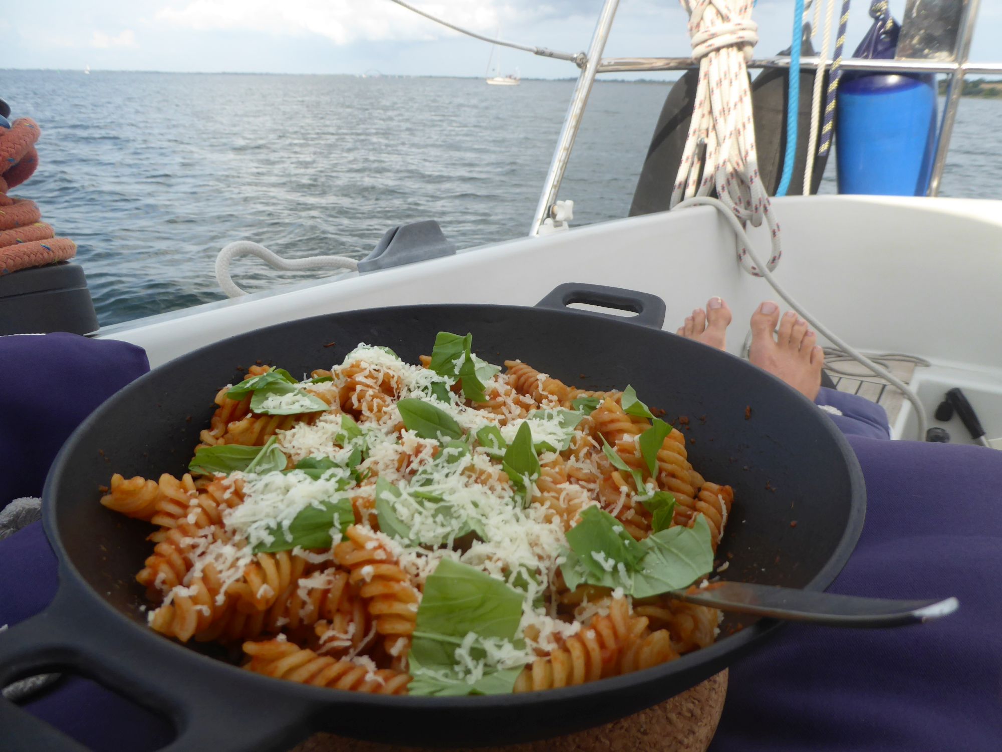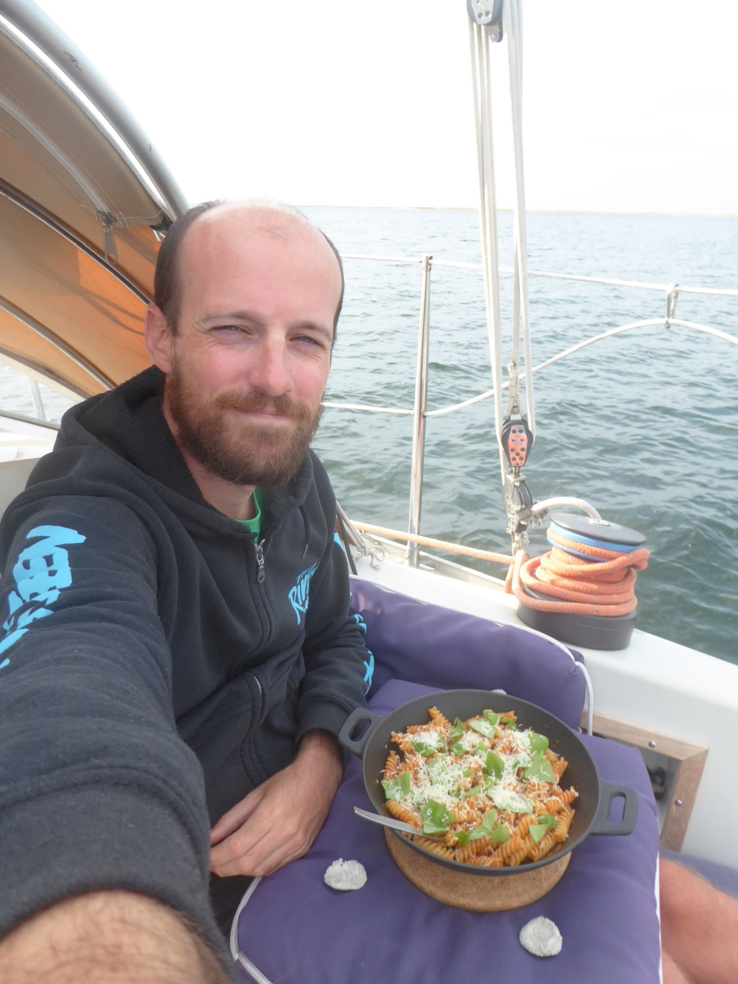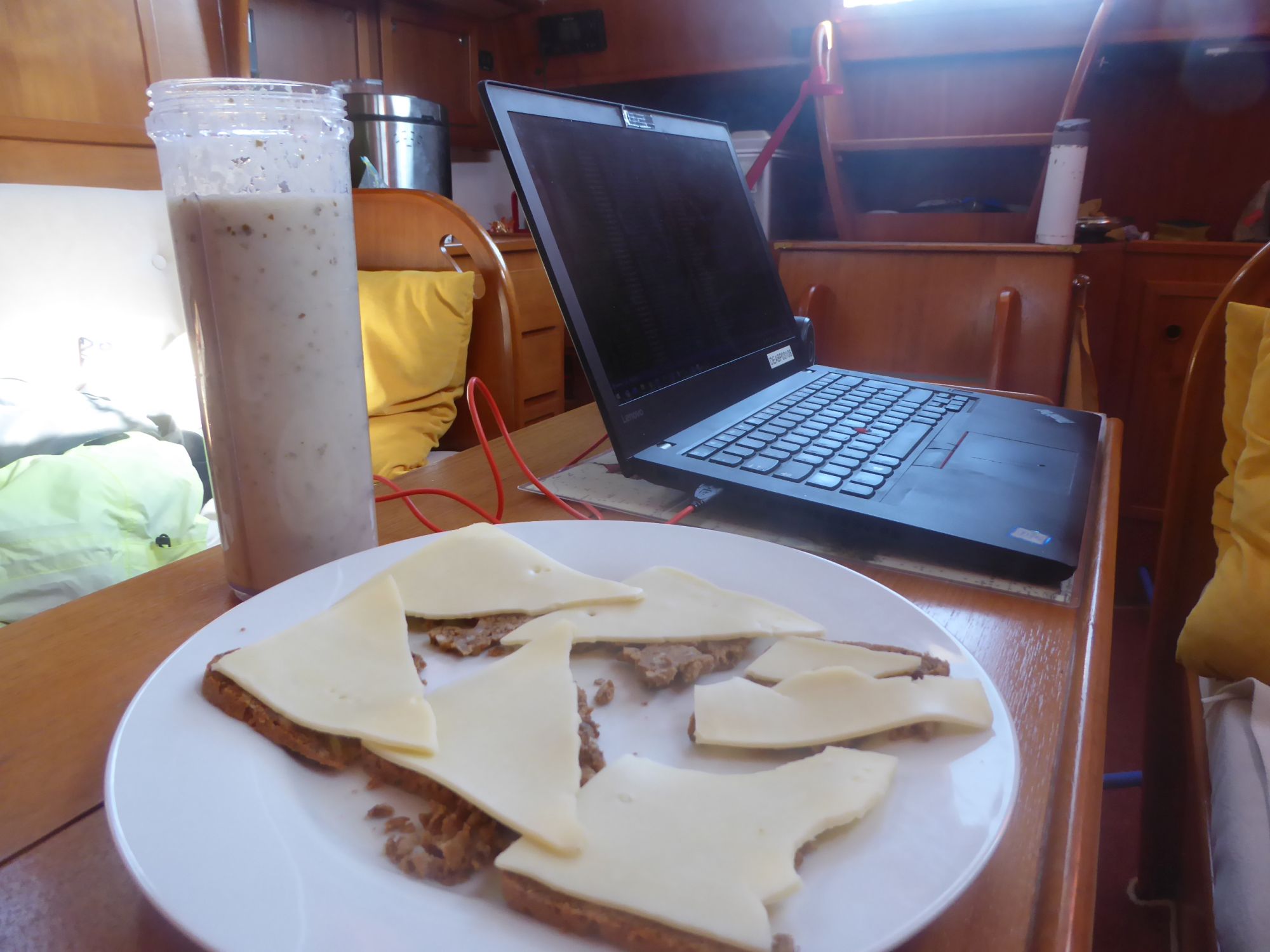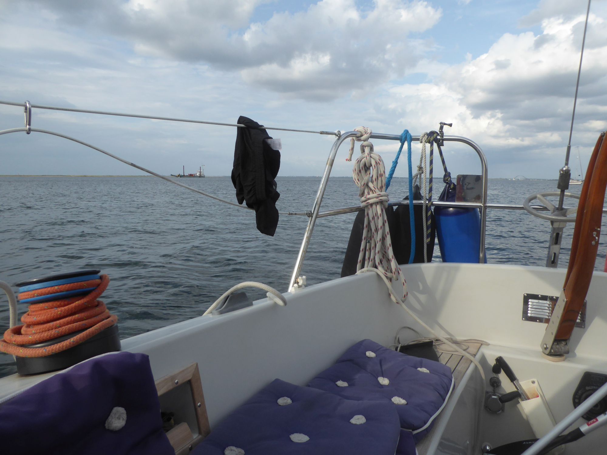 ...ist das Wetter am Montag wieder freundlich. Kurz vorm Frühstück fahren Mario und Roswitha vorbei. Ich arbeite den Tag vom Ankerplatz und bleibe noch zum Abendessen. Dann endlich raffe ich mich auf und mache mich auf den Heimweg nach Lemkenhafen.