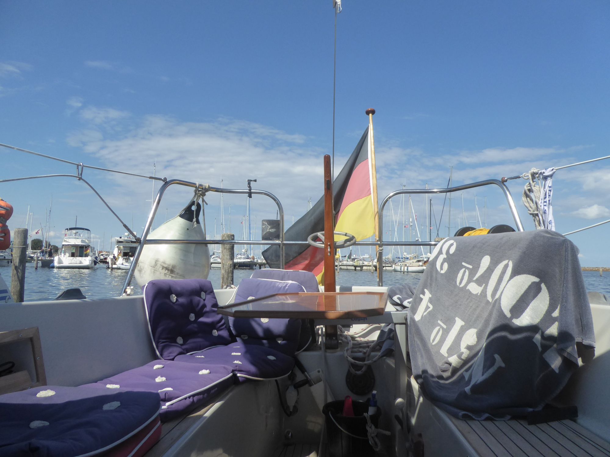 Dienstagmittag tucker ich das kurze Stück nach Marstal. Noch habe ich freie Auswahl, am Nachmittag füllt sich der Hafen dann aber schnell. Außerdem fehlen an den Gästestegen einige Pfähle. Zum Teil schwimmen Fender und Bojen, wo einst Heckpfähle standen.