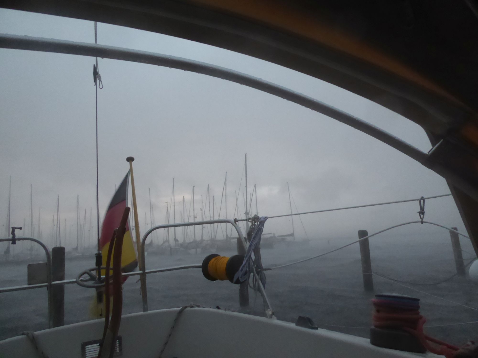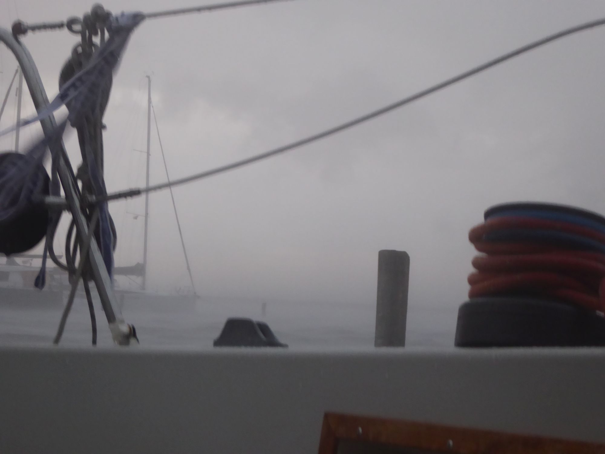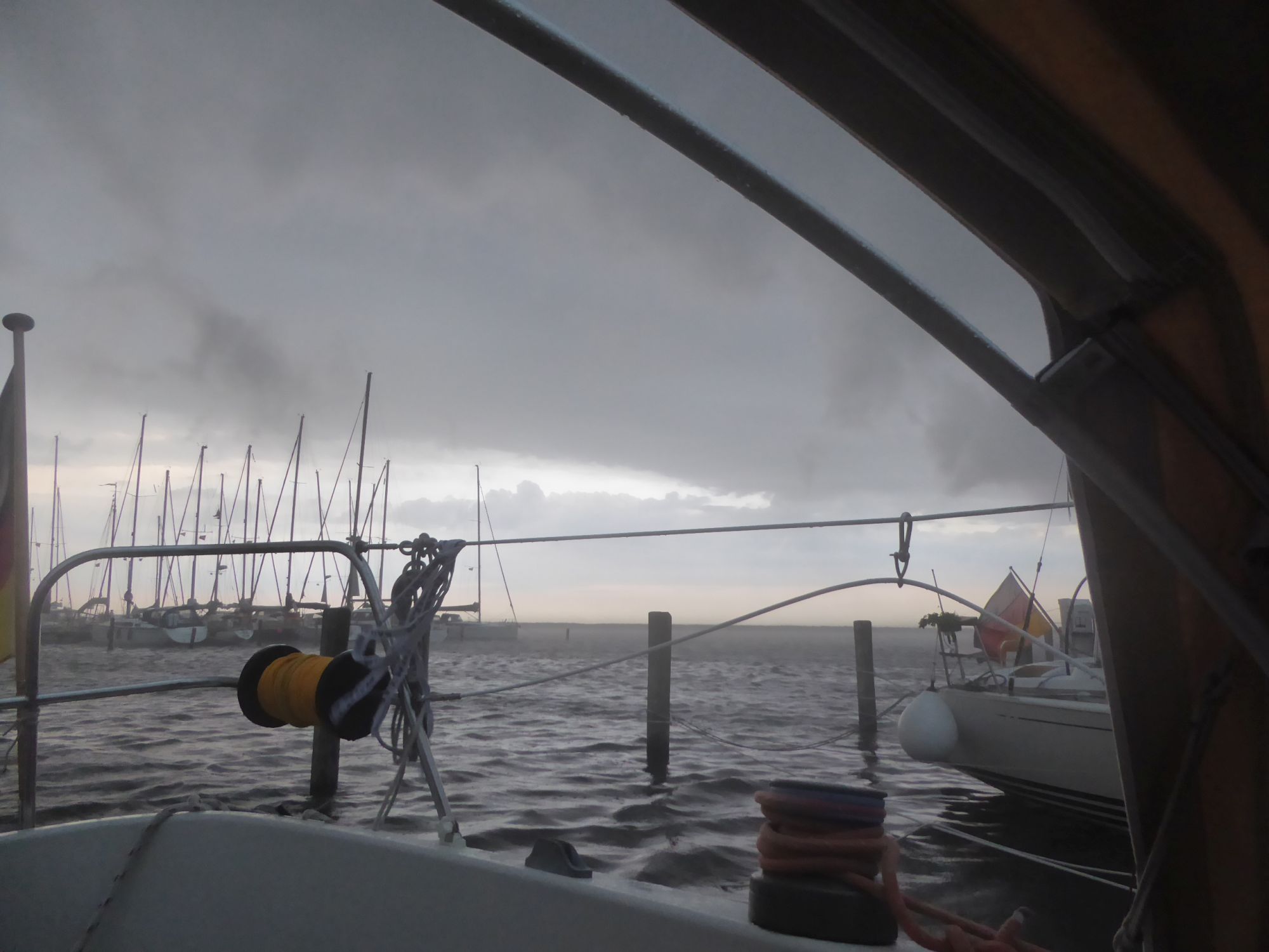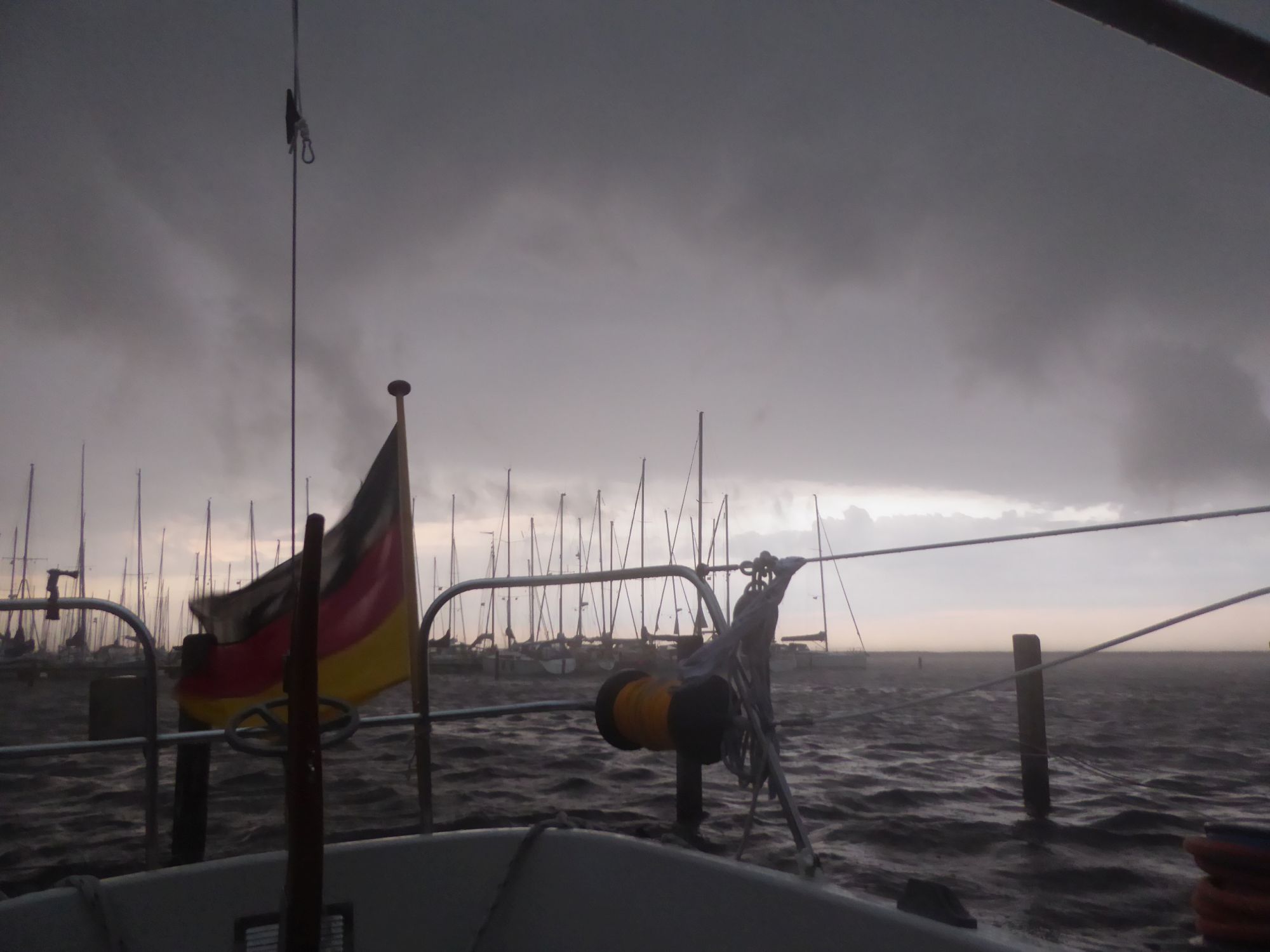 Abends zieht ein kräftiges Gewitter auf. Plötzlich weht es mit dreißig bis vierzig Knoten, dicke Regentropfen peitschen das Wasser auf. Auch nachdem das Gewitter vorüber ist weht es noch die ganze Nacht durch mit an die dreißig Knoten. Am nächsten Morgen klopft ein verlorener Flaggenstock gegen den Rumpf.