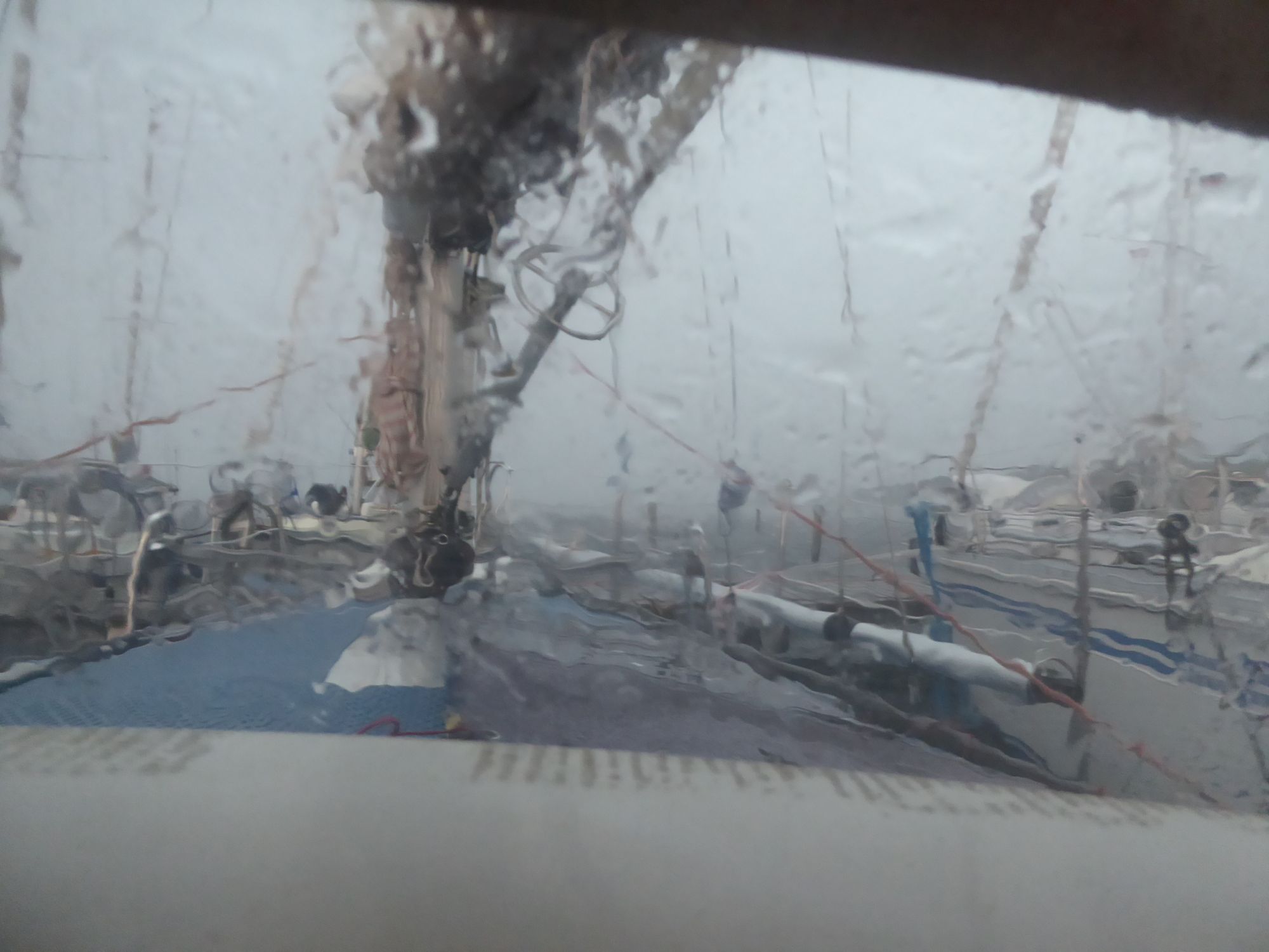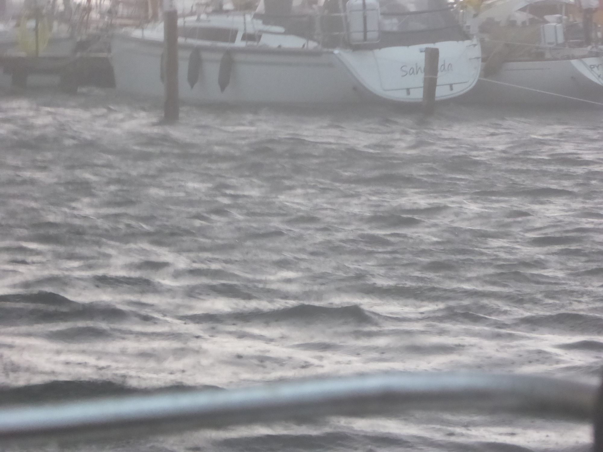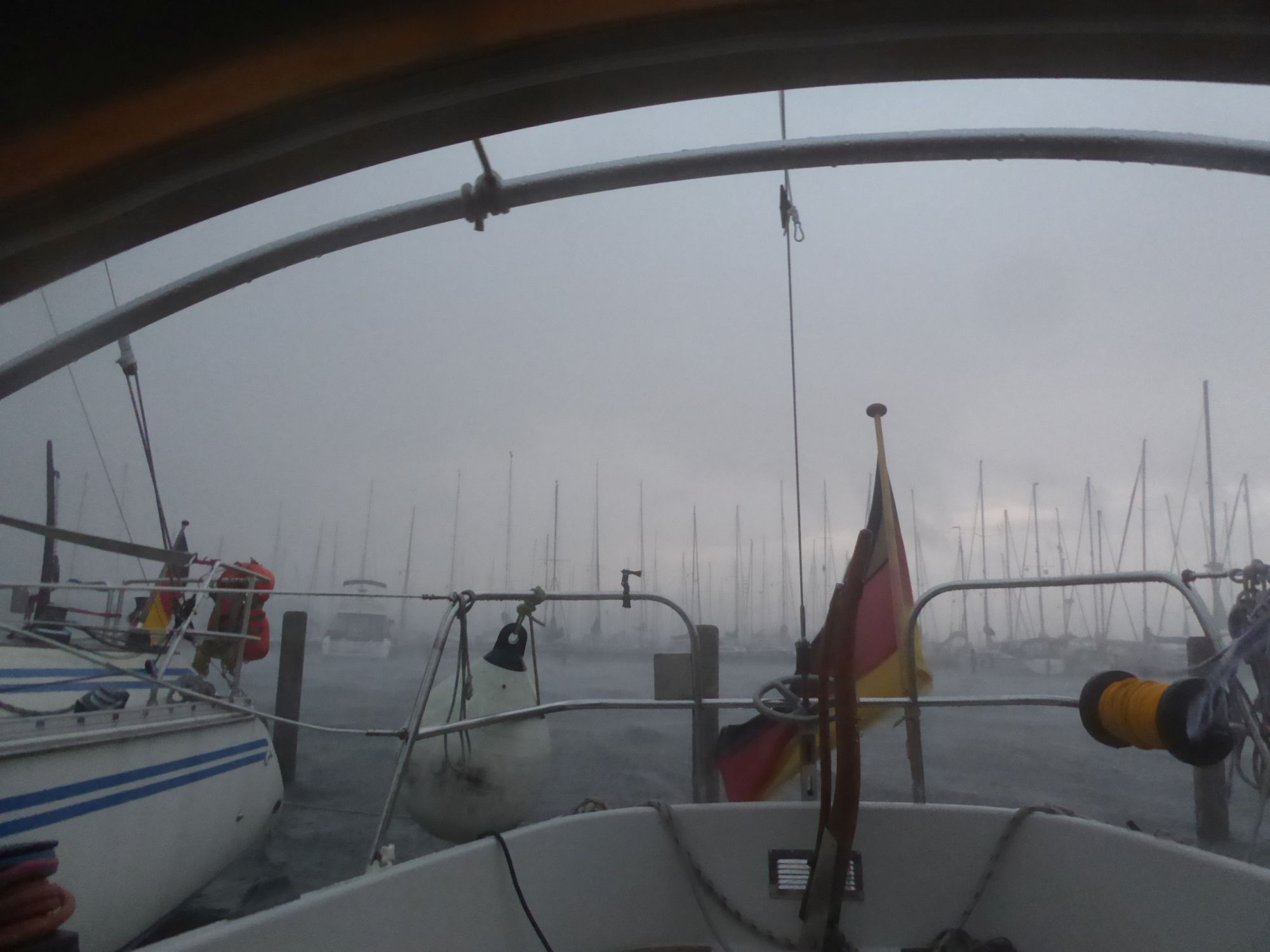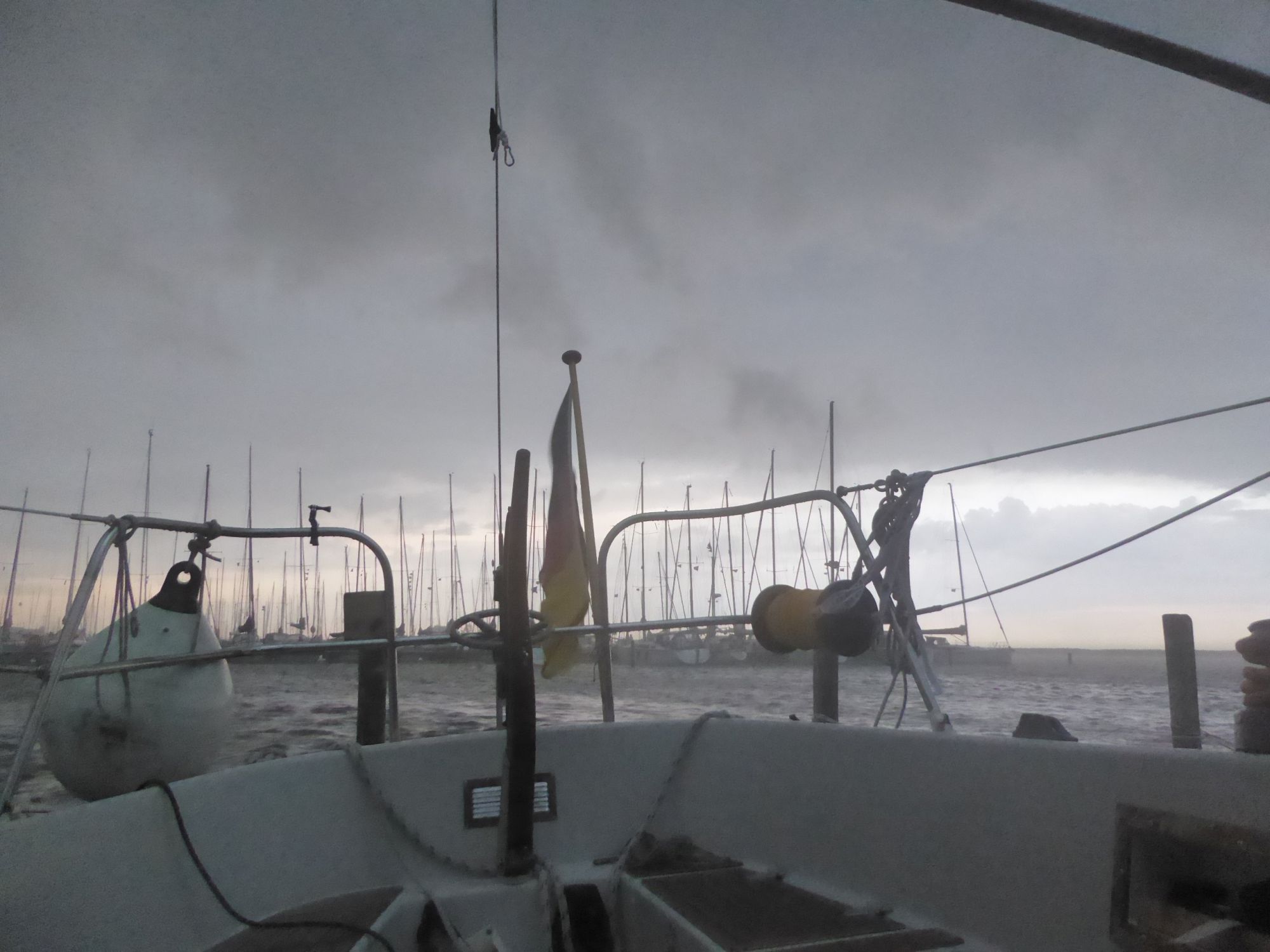 Abends zieht ein kräftiges Gewitter auf. Plötzlich weht es mit dreißig bis vierzig Knoten, dicke Regentropfen peitschen das Wasser auf. Auch nachdem das Gewitter vorüber ist weht es noch die ganze Nacht durch mit an die dreißig Knoten. Am nächsten Morgen klopft ein verlorener Flaggenstock gegen den Rumpf.