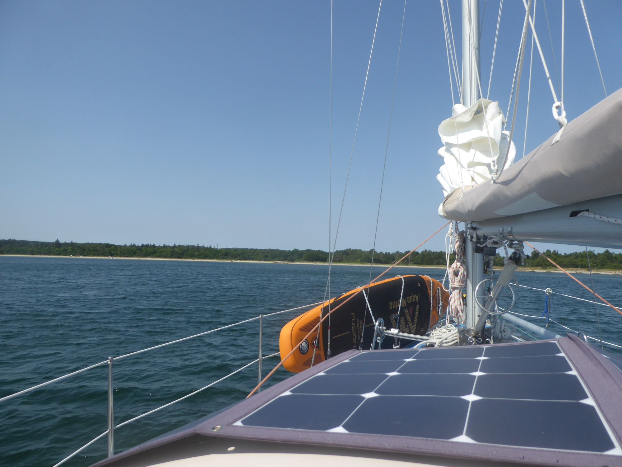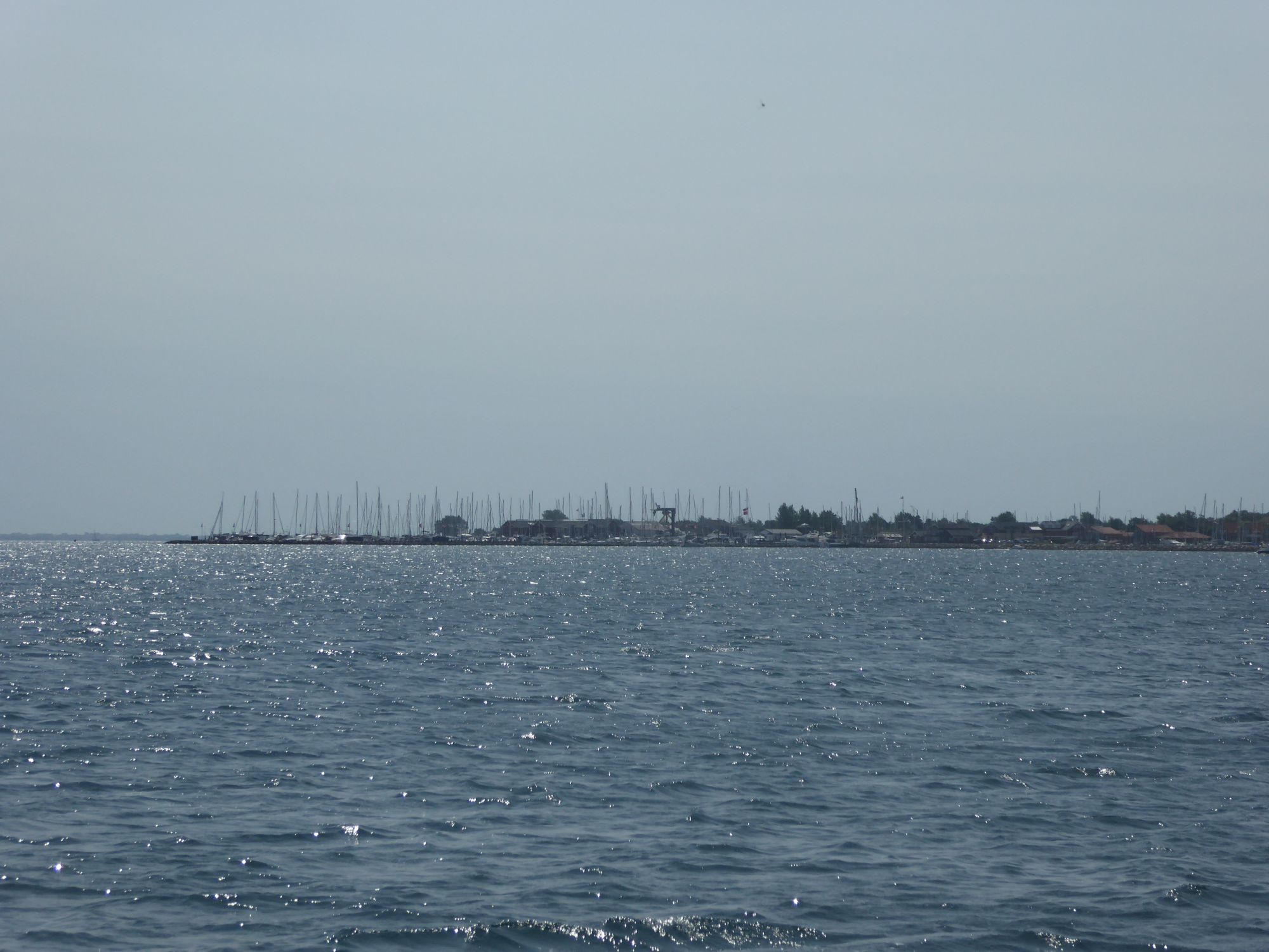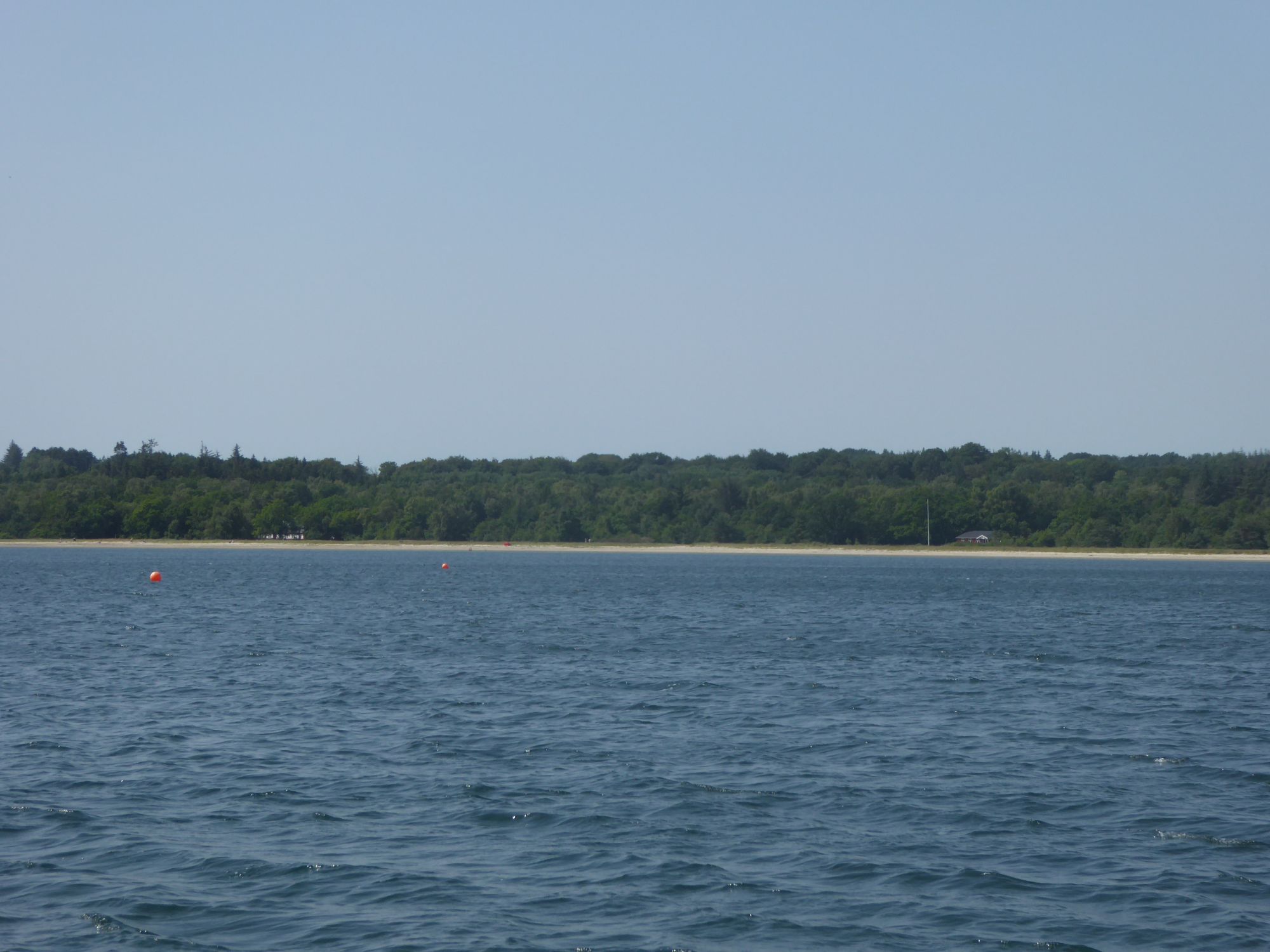 Kurz vor halb neun geht der Anker hoch und nur mit der Genua düse ich in südwestlicher Richtung nach Juelsminde. Es ist eine Rauschefahrt und mit einem Schnitt von über sechs Knoten sind die einundzwanzig Seemeilen schnell erledigt. Nach dreieinhalb Stunden fällt der Anker wieder im Nordwesten von Juelsmindes Bucht, gegenüber des Hafens bei Sandbjerg Vig.