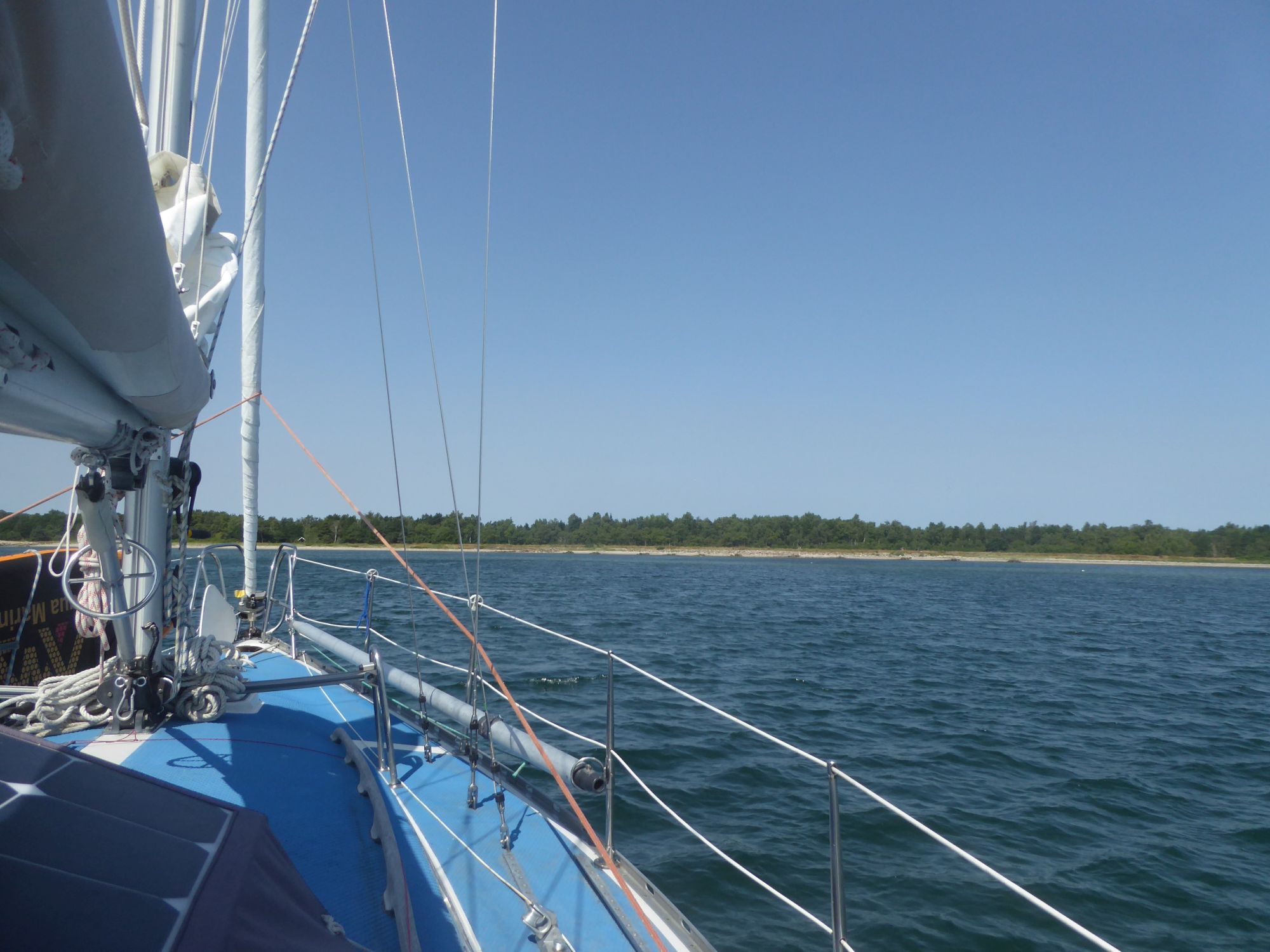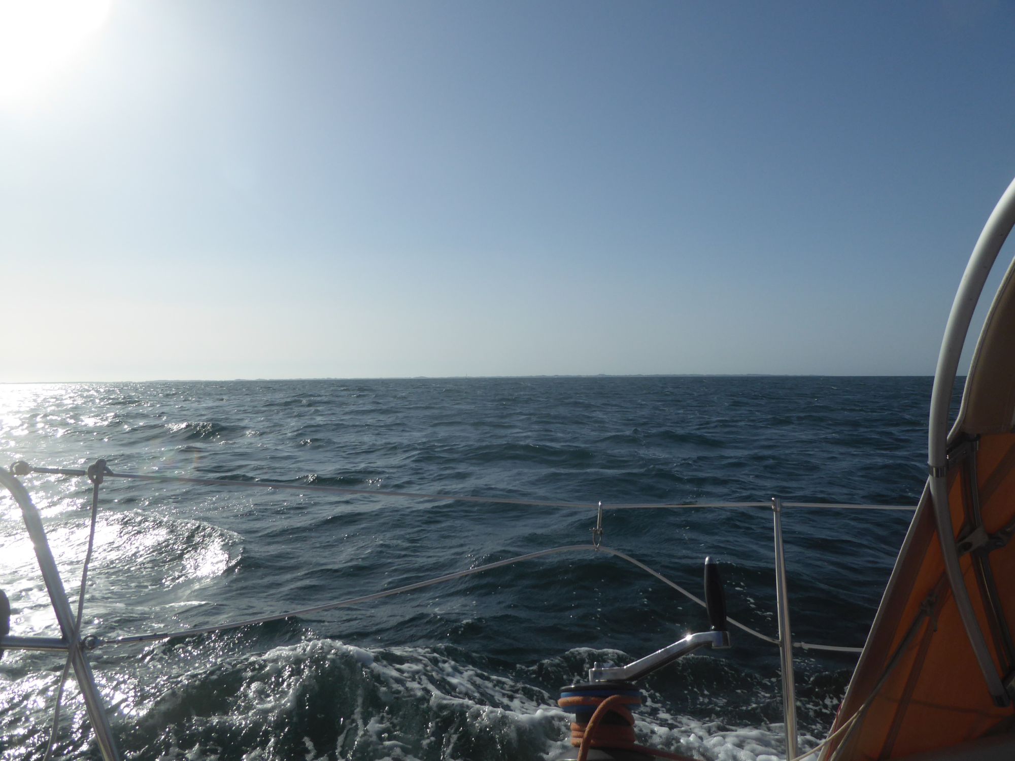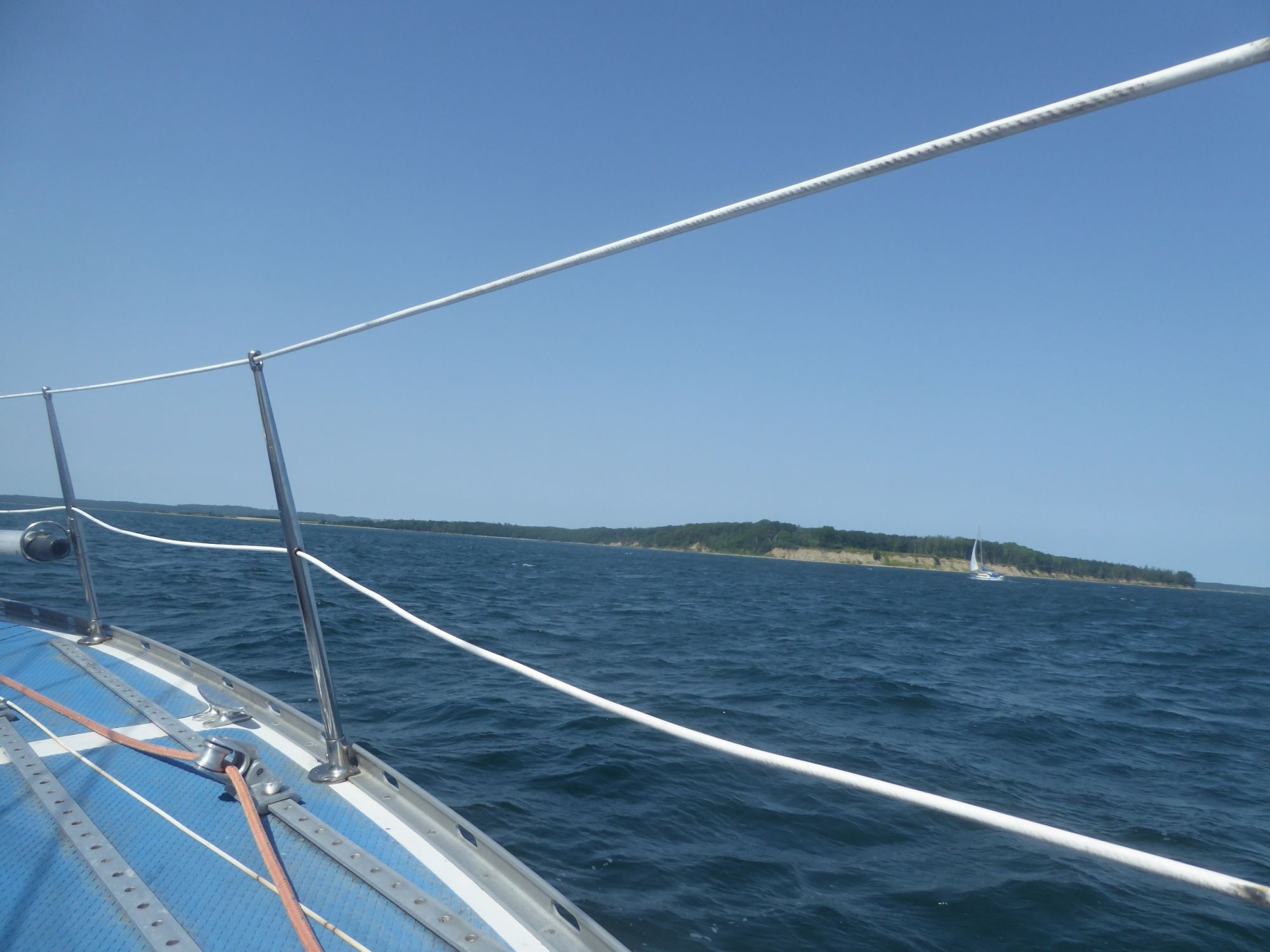 Kurz vor halb neun geht der Anker hoch und nur mit der Genua düse ich in südwestlicher Richtung nach Juelsminde. Es ist eine Rauschefahrt und mit einem Schnitt von über sechs Knoten sind die einundzwanzig Seemeilen schnell erledigt. Nach dreieinhalb Stunden fällt der Anker wieder im Nordwesten von Juelsmindes Bucht, gegenüber des Hafens bei Sandbjerg Vig.