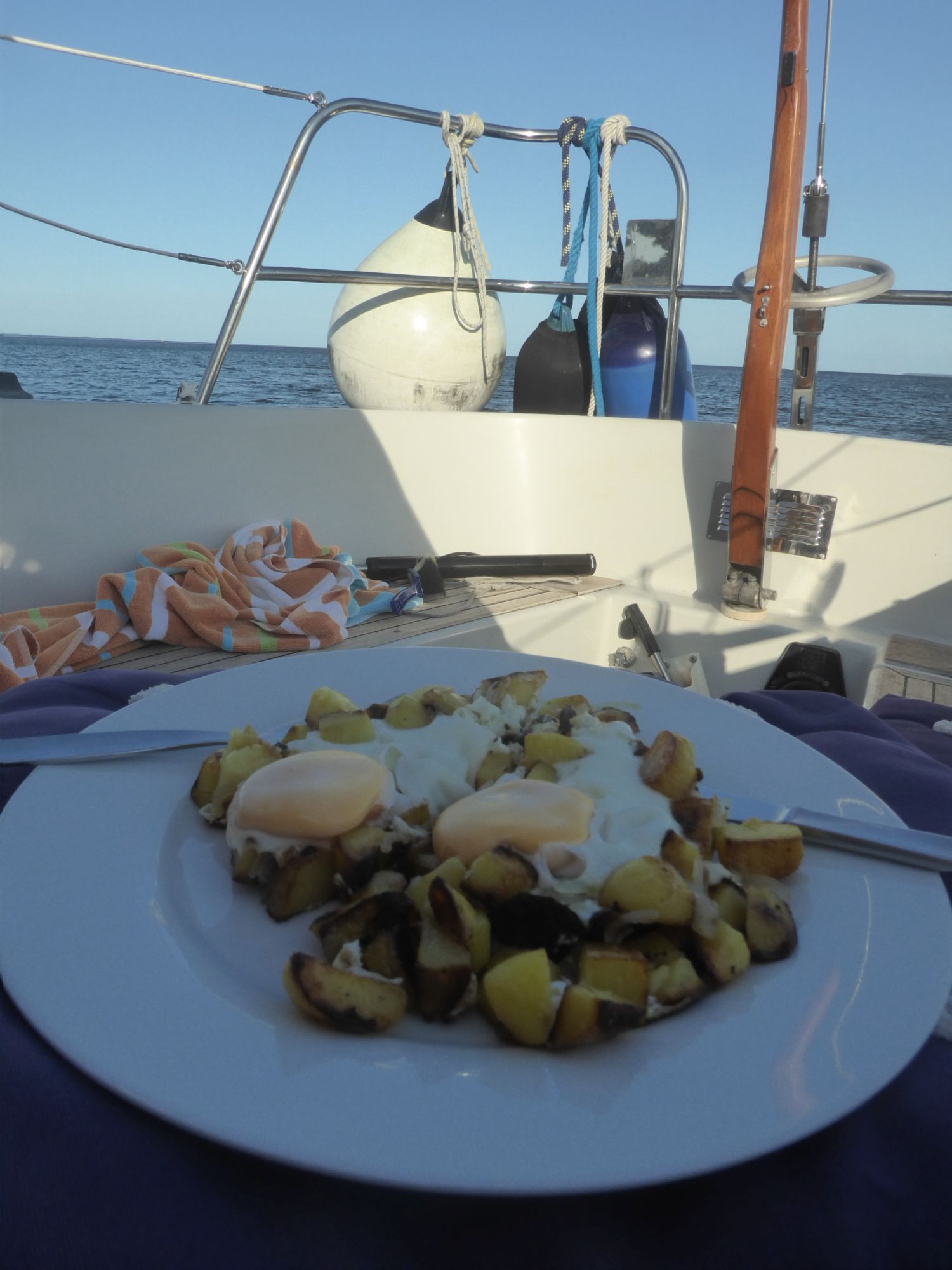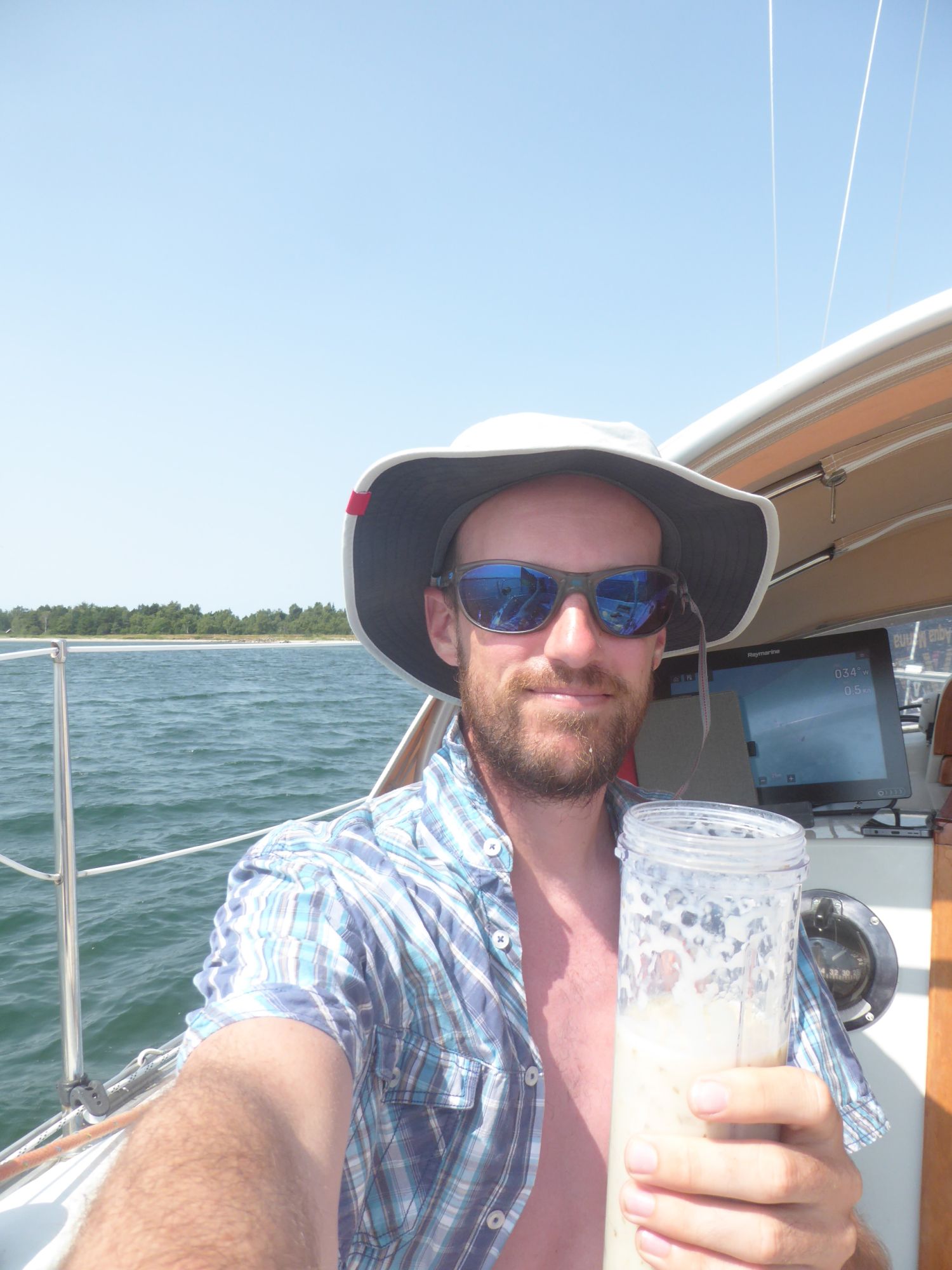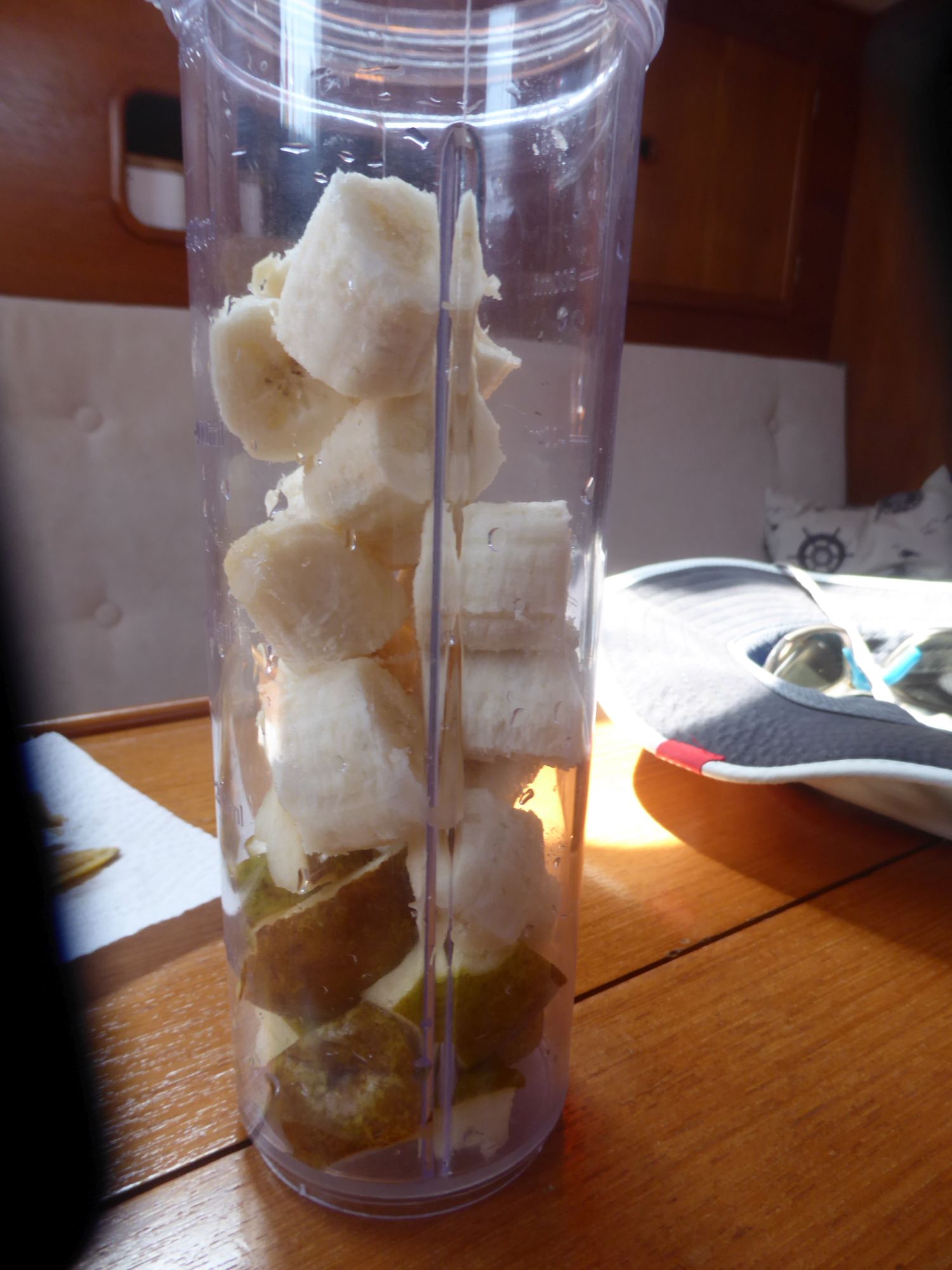 Nach einer kleinen Lesepause eine Nektarine und ein Banane-Birne-Smoothie. Dann ein paar Runden ums Boot schwimmen. Es schwoit bei dem Wind so sehr, dass ich mit weitem Abstand schwimme und jede Runde bestimmt doppelt so lang wie üblich wird.