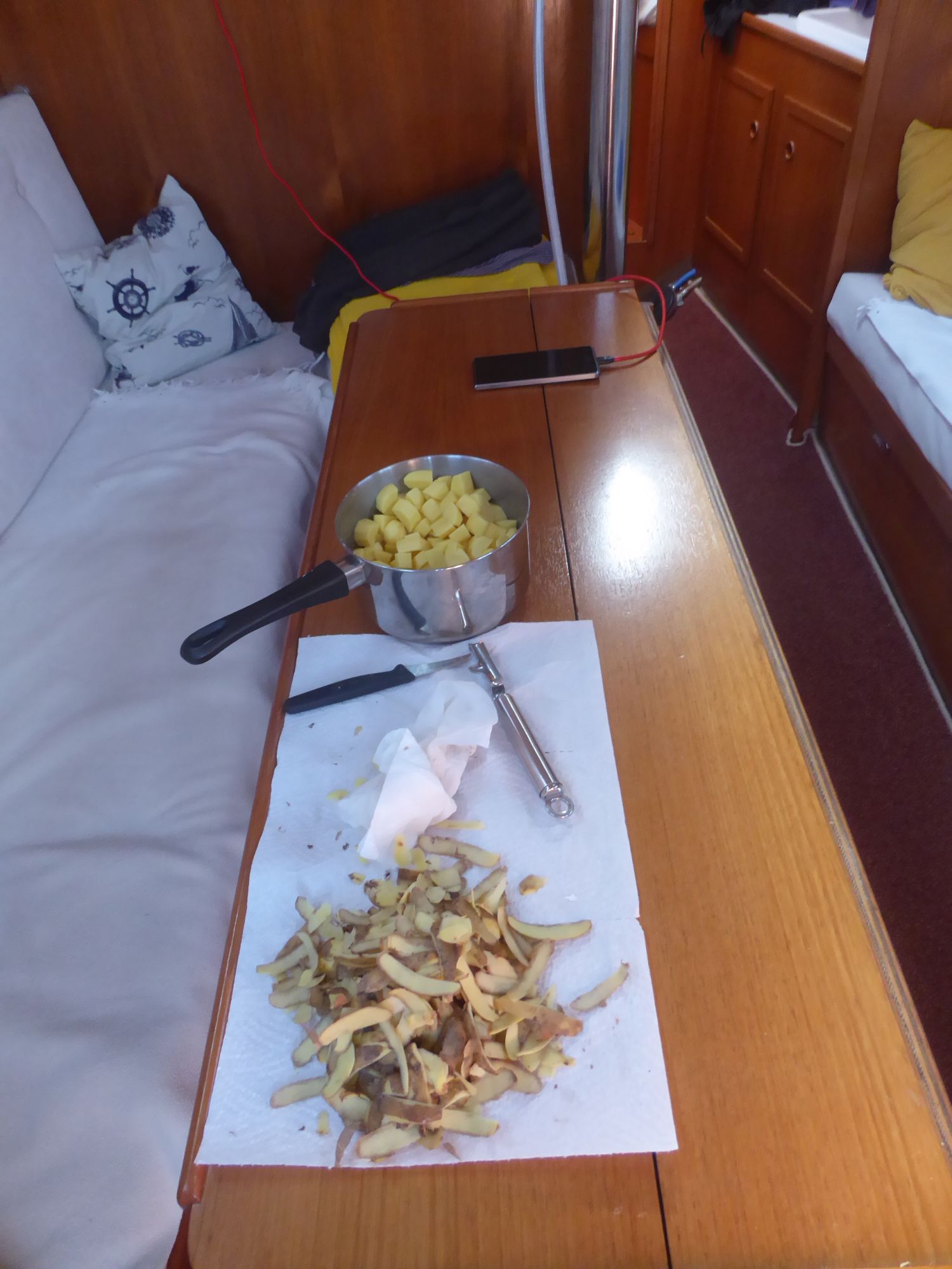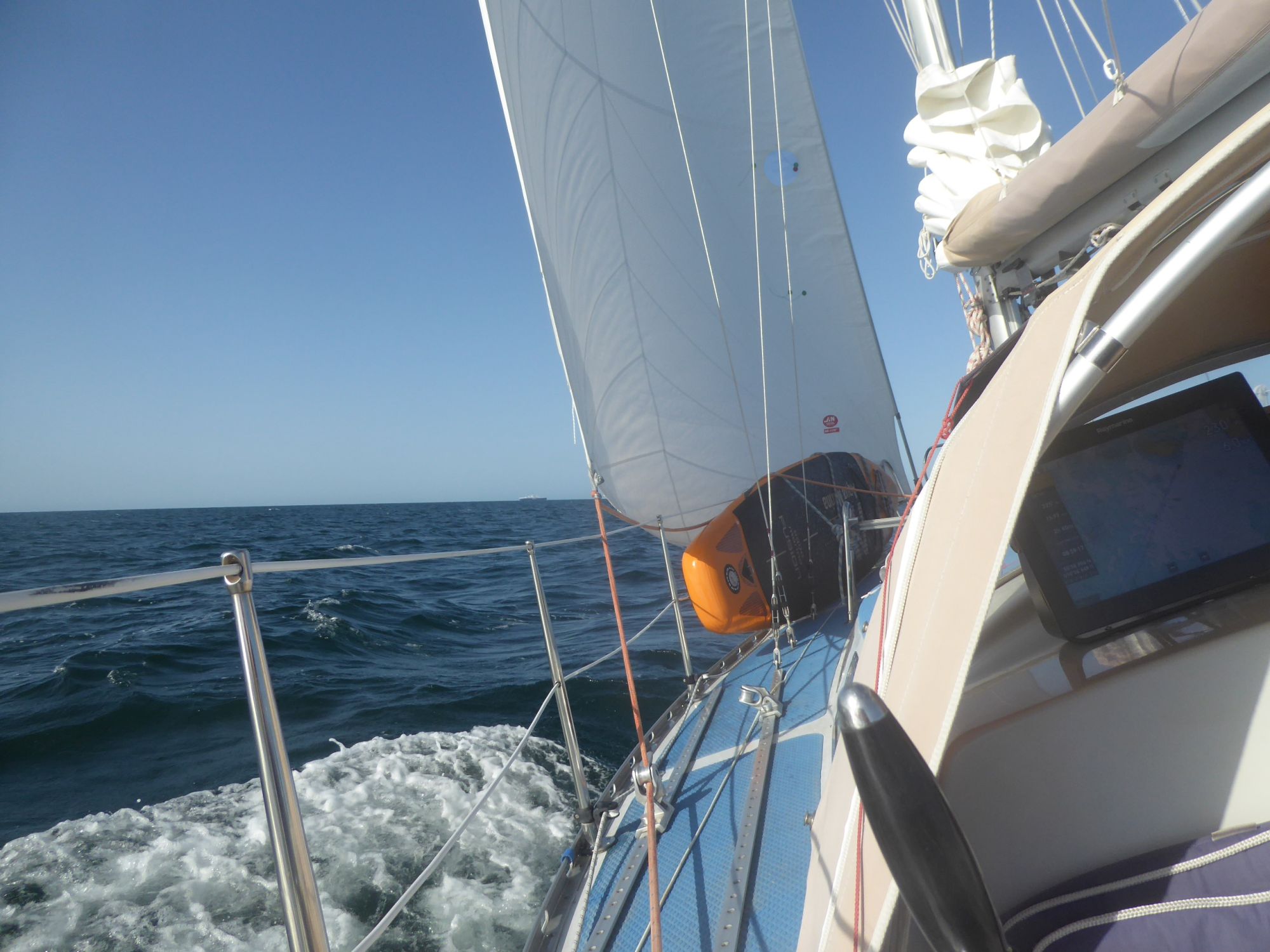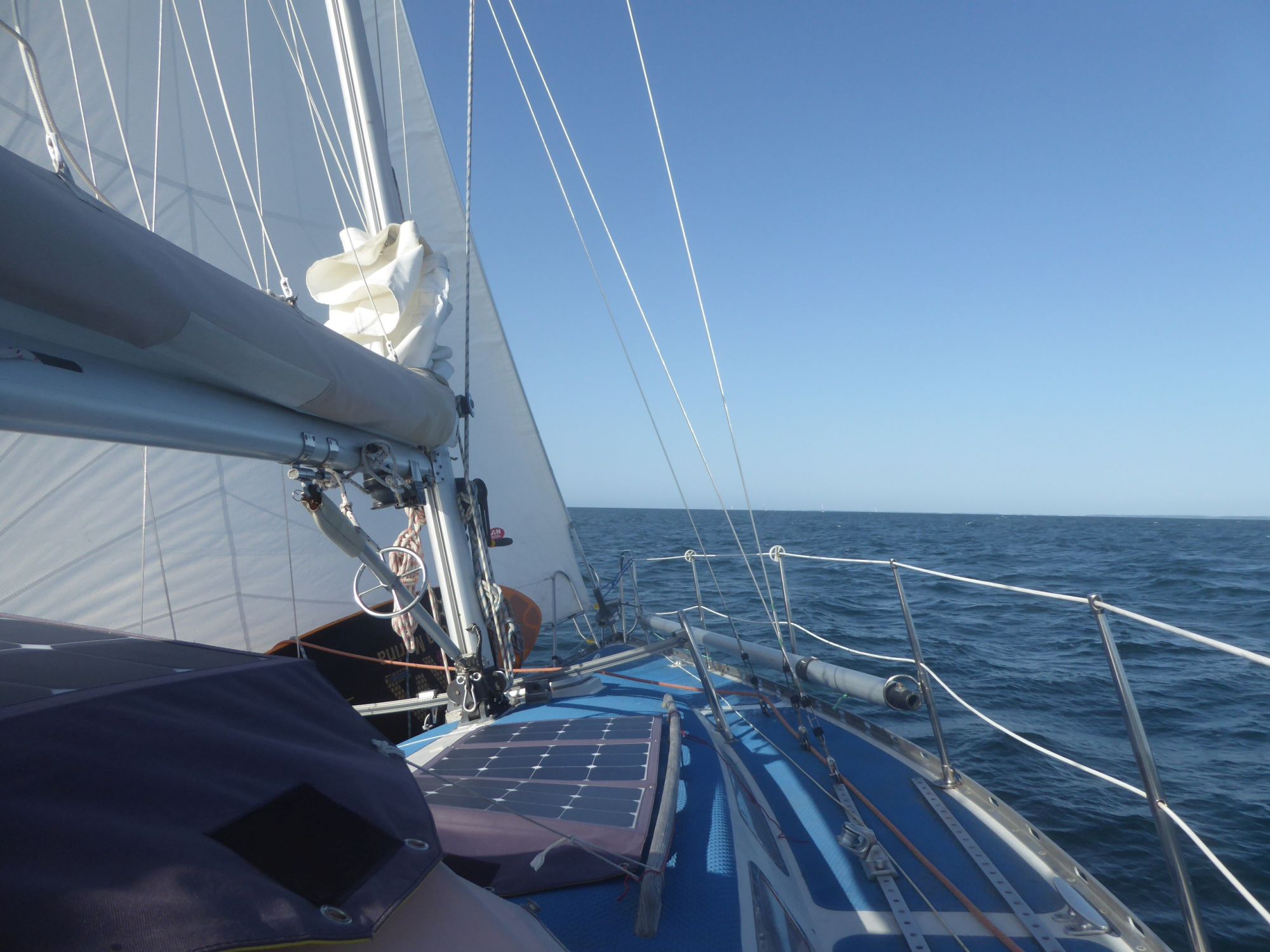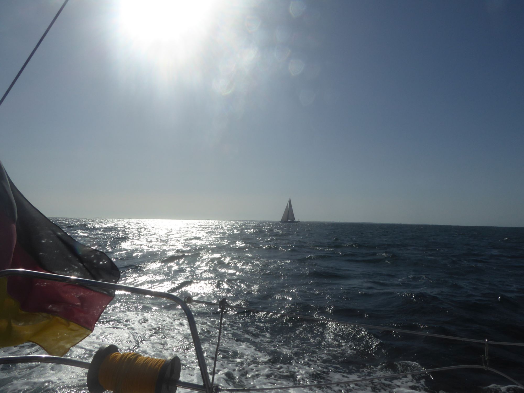 Nach einer kleinen Lesepause eine Nektarine und ein Banane-Birne-Smoothie. Dann ein paar Runden ums Boot schwimmen. Es schwoit bei dem Wind so sehr, dass ich mit weitem Abstand schwimme und jede Runde bestimmt doppelt so lang wie üblich wird.