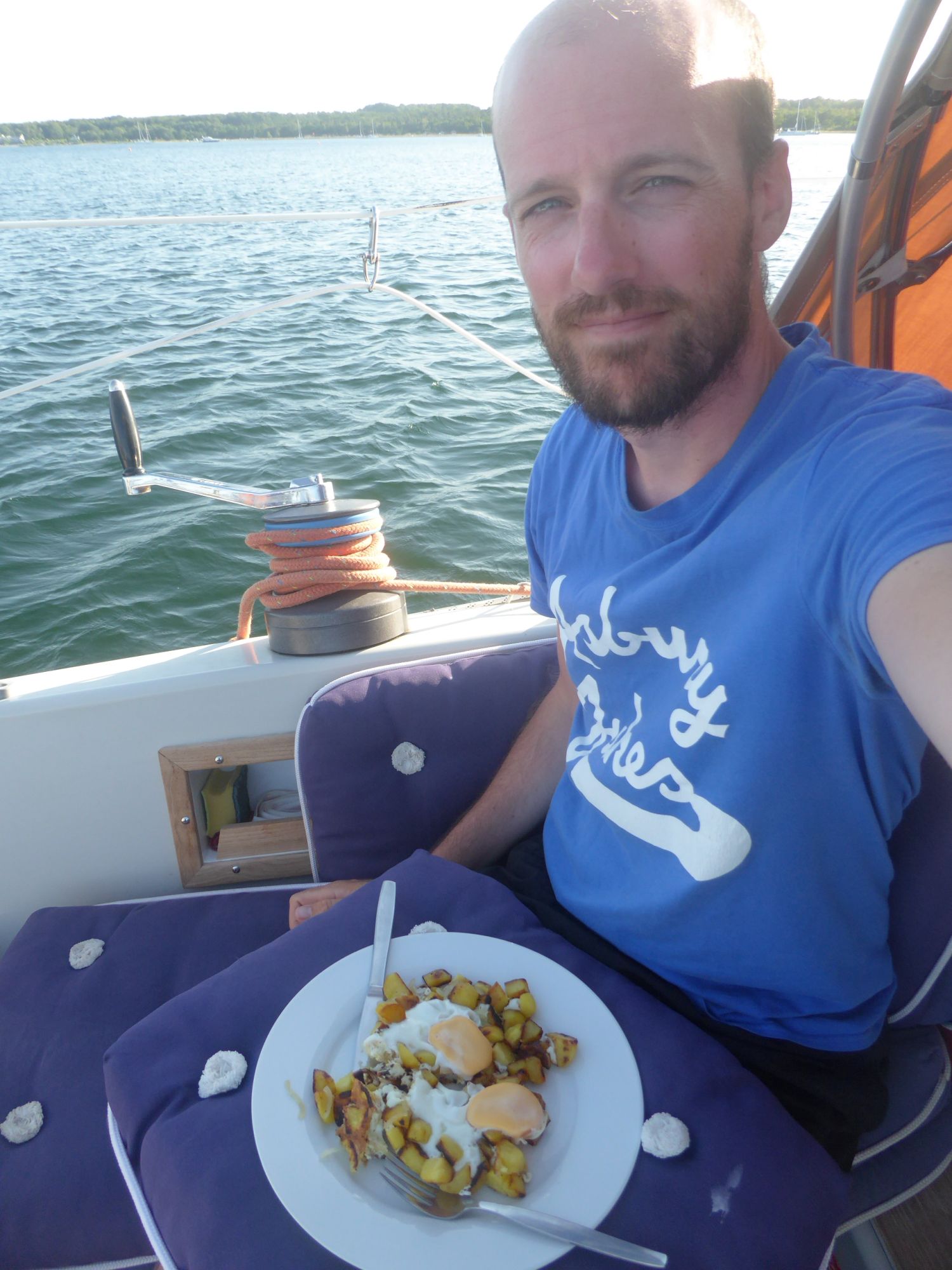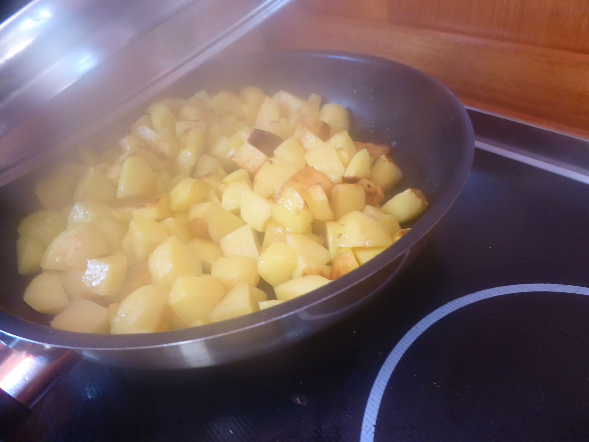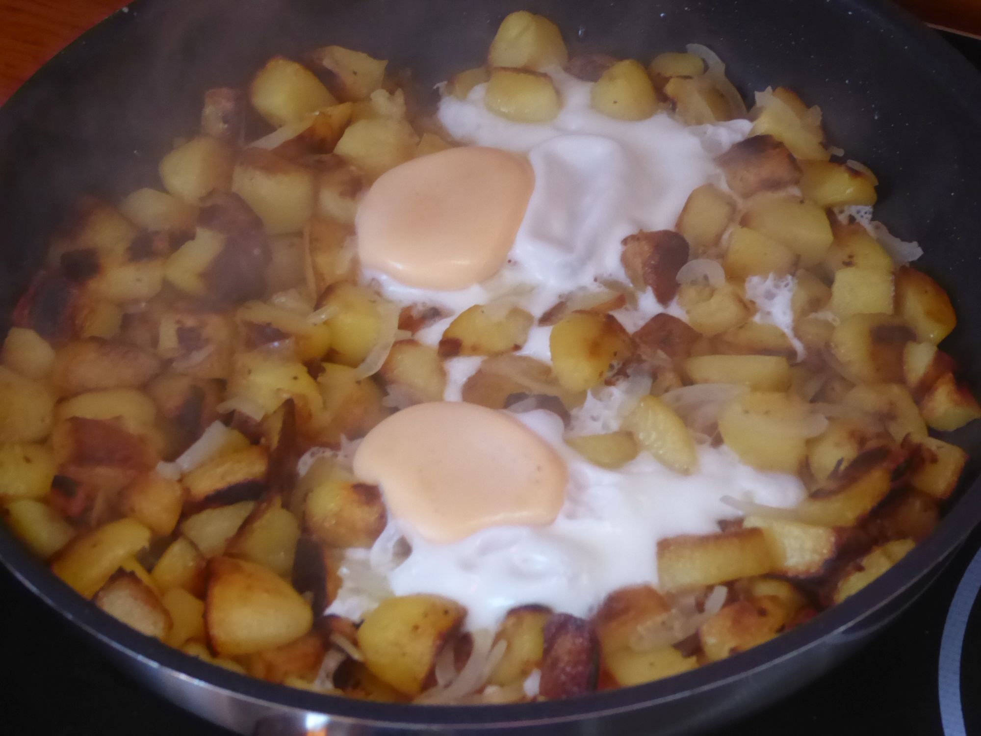 Abends gibt es Bratkartoffeln aus Fehmarnkartofeln, dazu Spiegeleier.