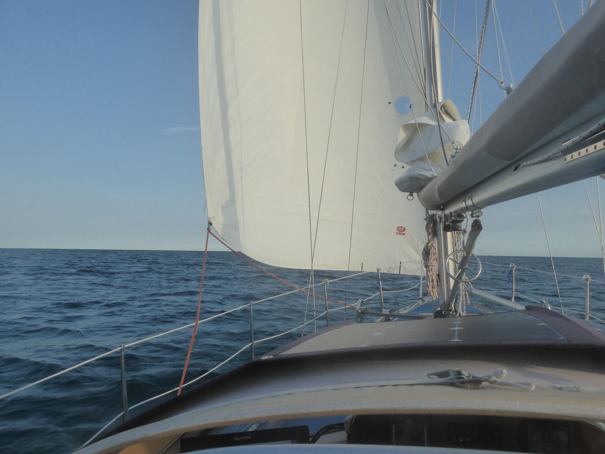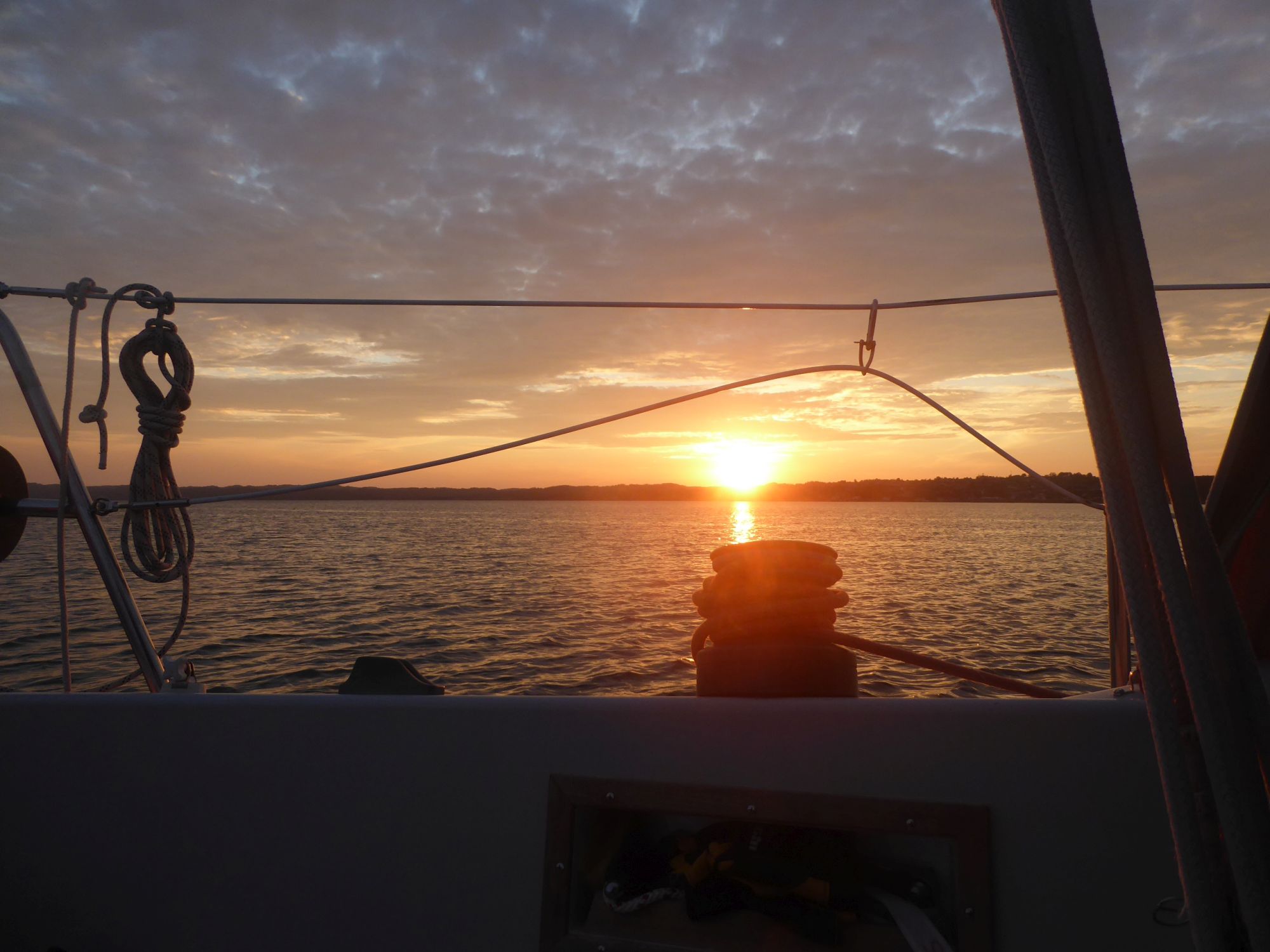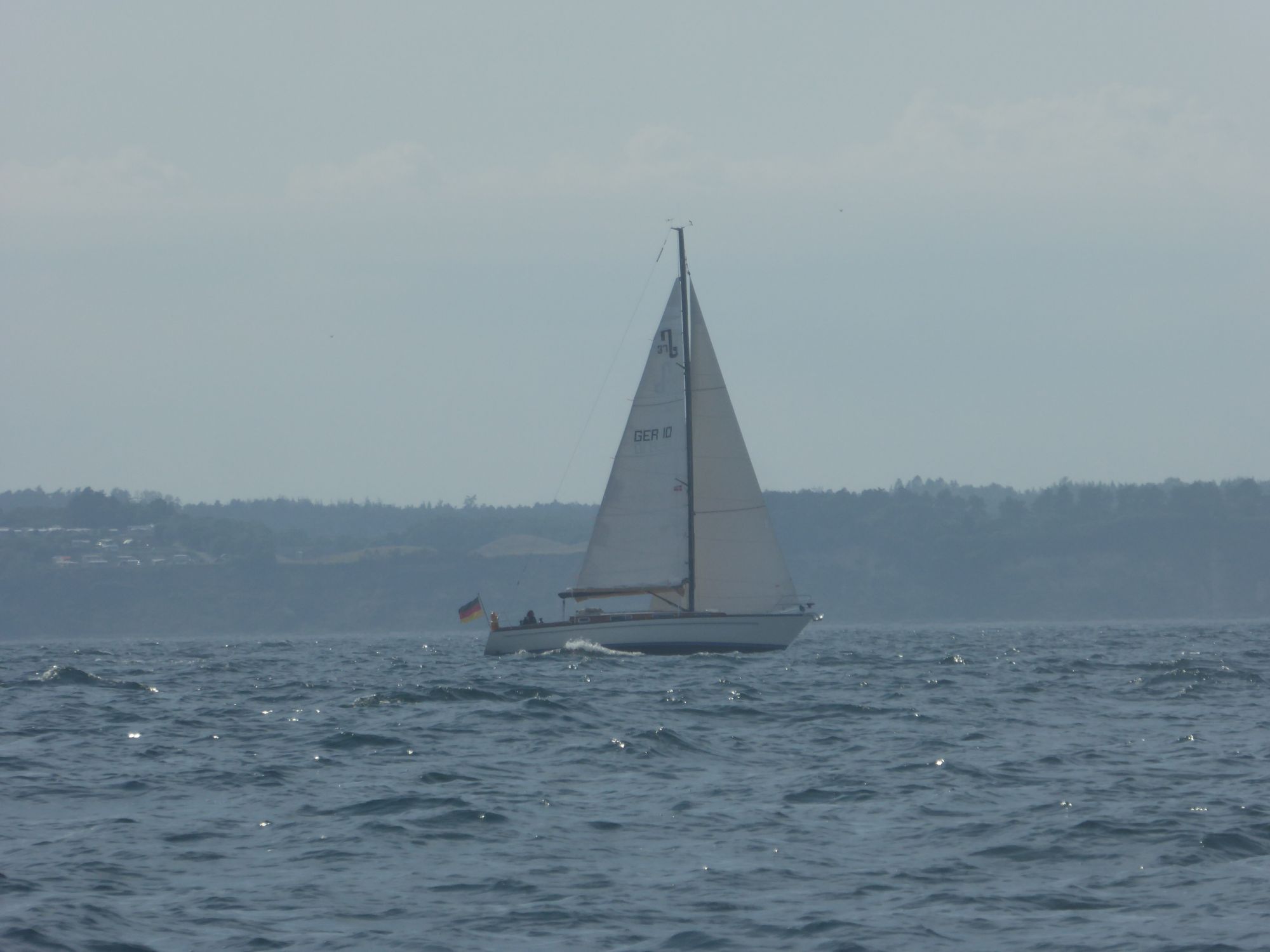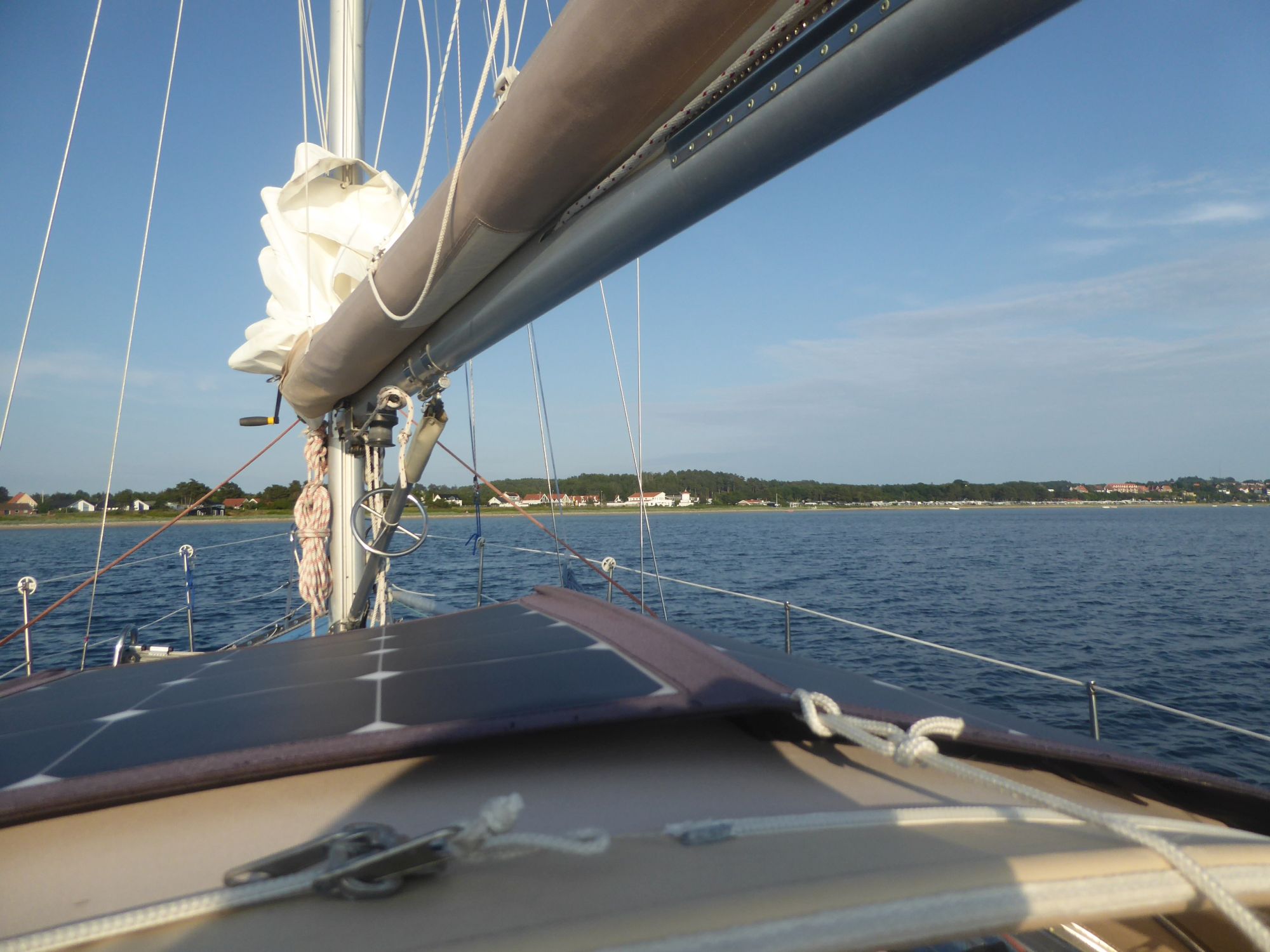 Ab halb fünf wird Schmetterling gesegelt. Der Wind lässt leider immer weiter nach. Nur die Wellen bleiben übrig und so muss ich häufig in das schlagende Groß greifen. Erst in der Ebeltoftbucht läuft es am Wind wieder richtig gut.