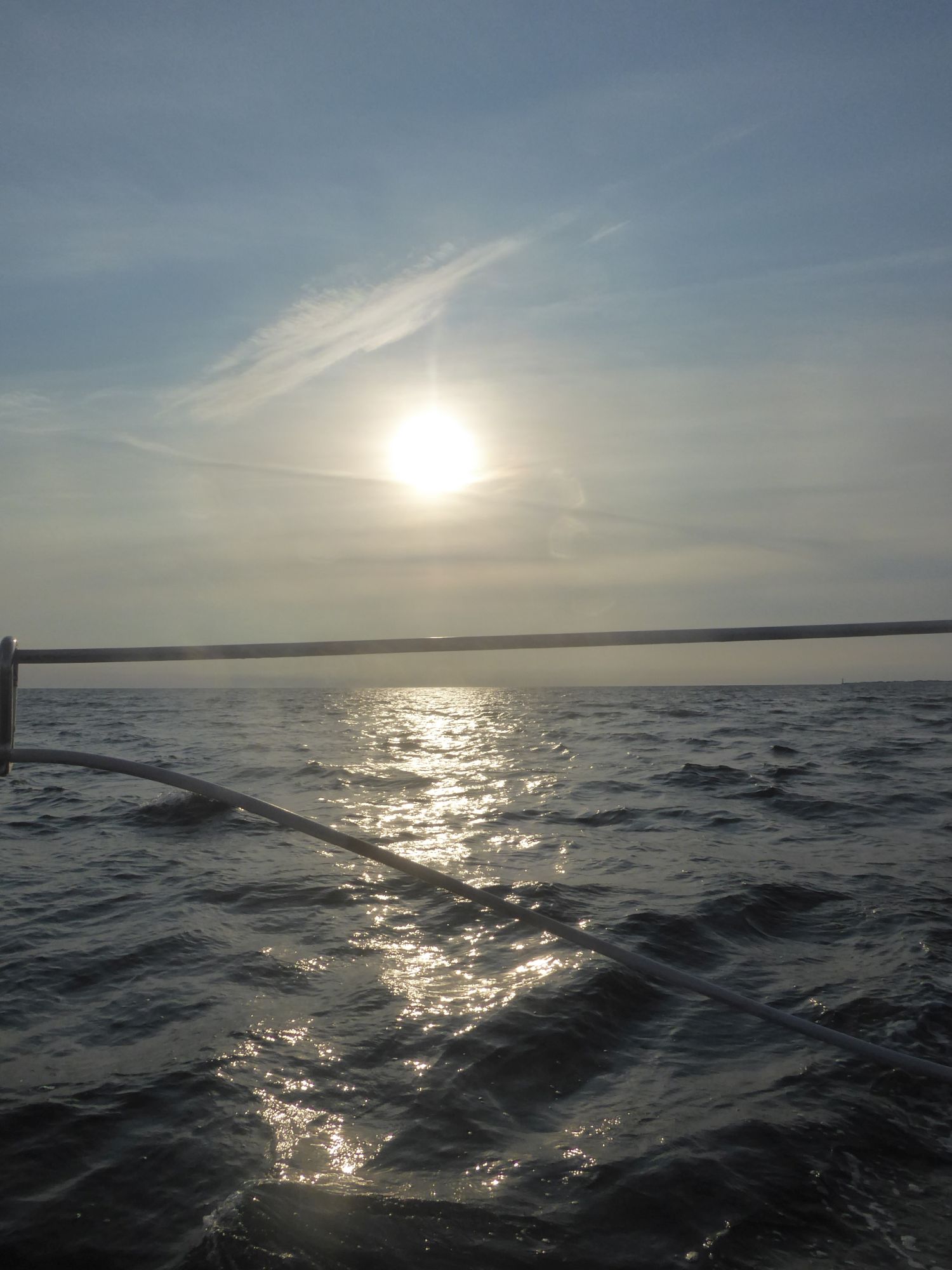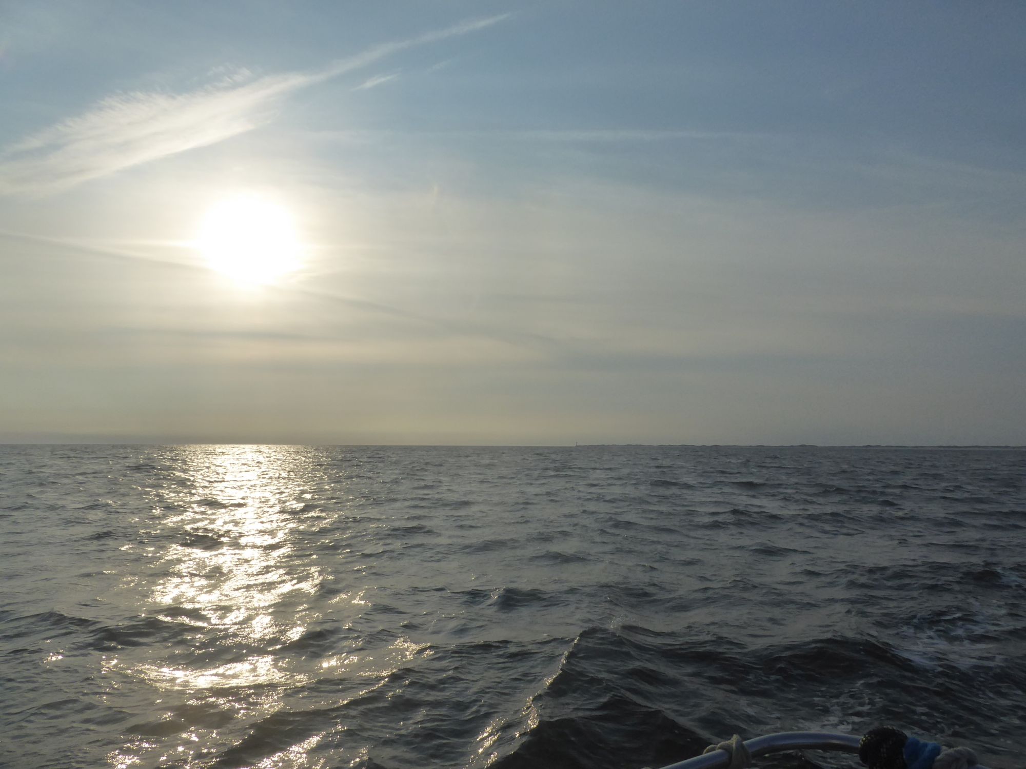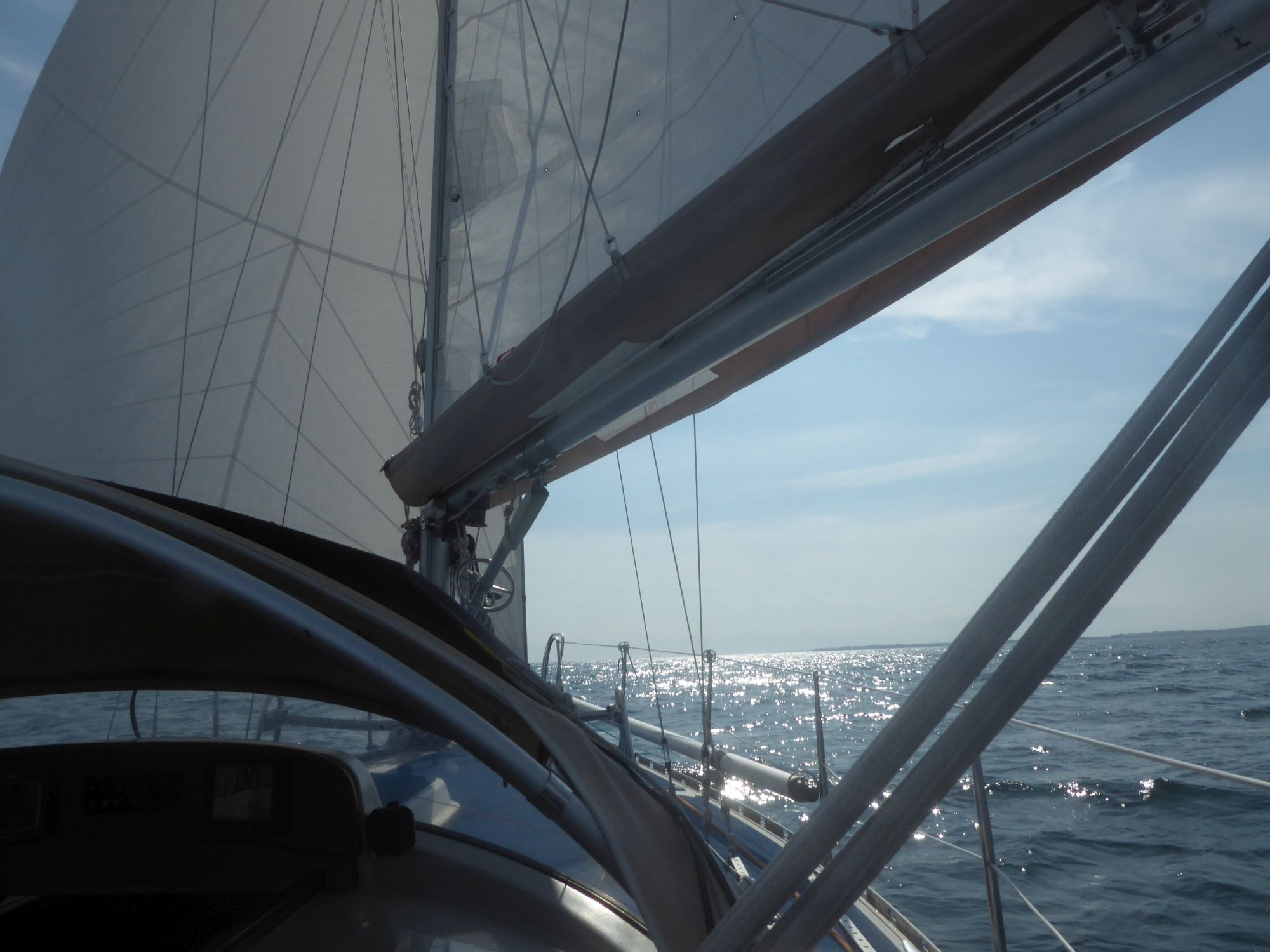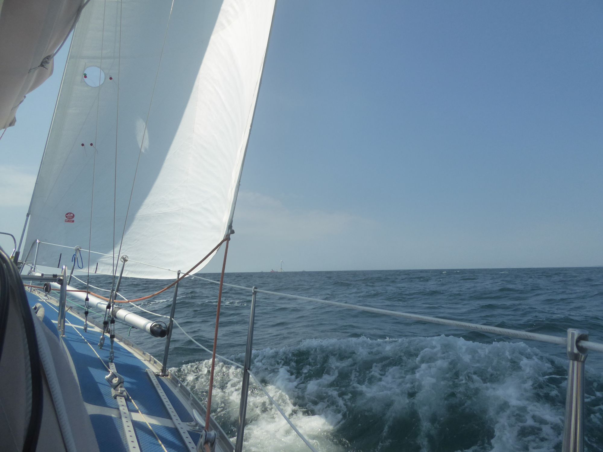 Ab halb fünf wird Schmetterling gesegelt. Der Wind lässt leider immer weiter nach. Nur die Wellen bleiben übrig und so muss ich häufig in das schlagende Groß greifen. Erst in der Ebeltoftbucht läuft es am Wind wieder richtig gut.