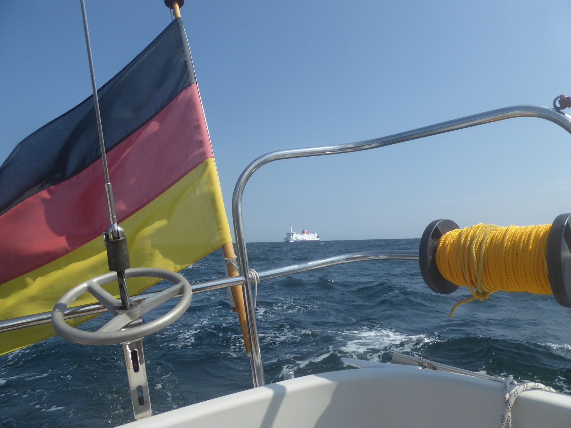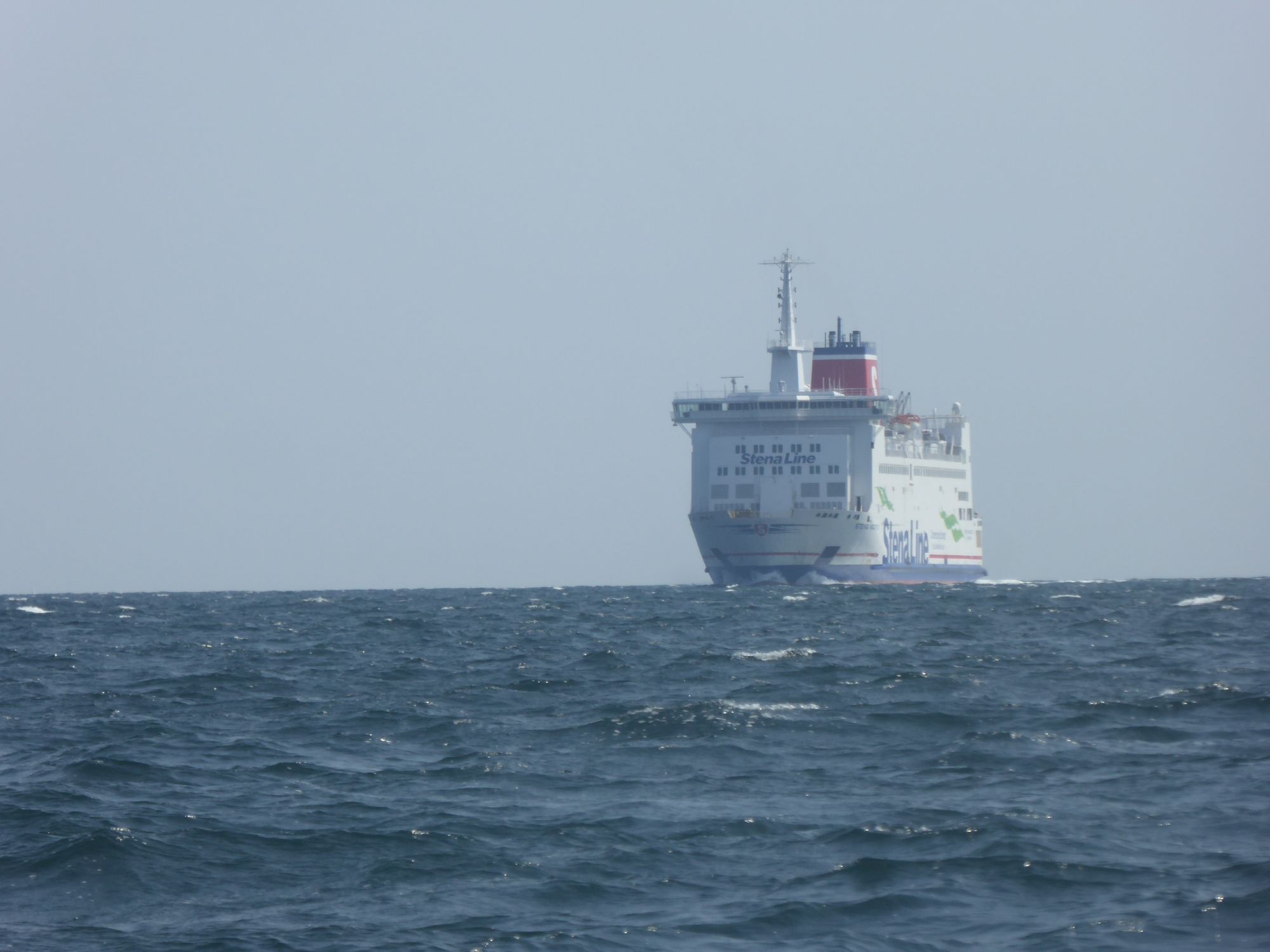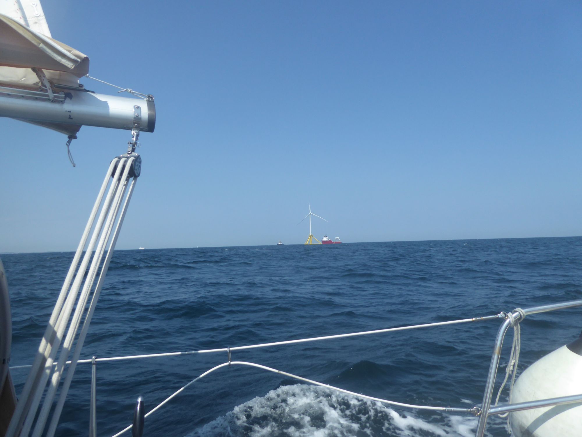 Zur Mittagszeit sehe ich eine seltsame einzelne Windkraftanlage auf dem Wasser. Zwei Kutter als Wachhunde und ein größeres Schiff treiben in der Nähe.