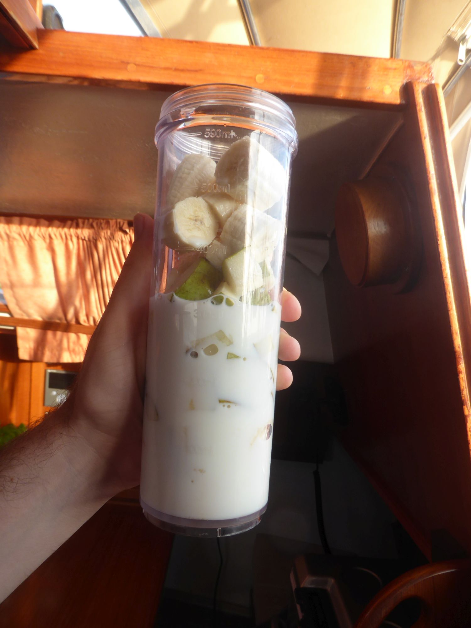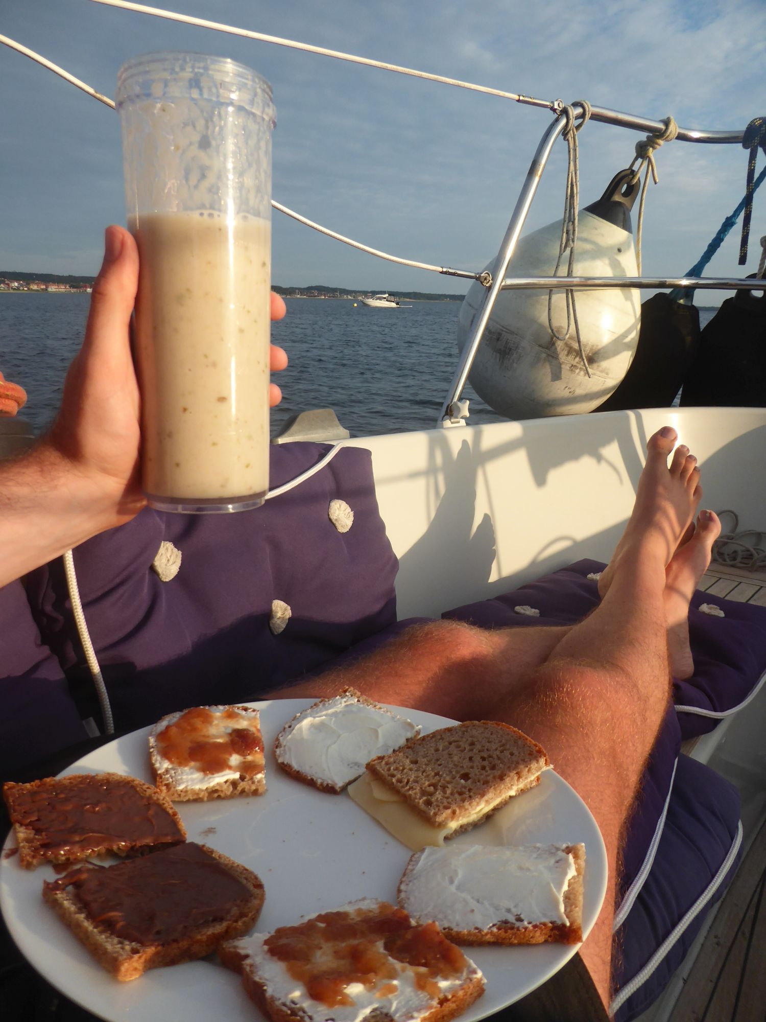 Zu Abend gibt es geschmierte Brote und einen Birne-Banane-Smoothie.