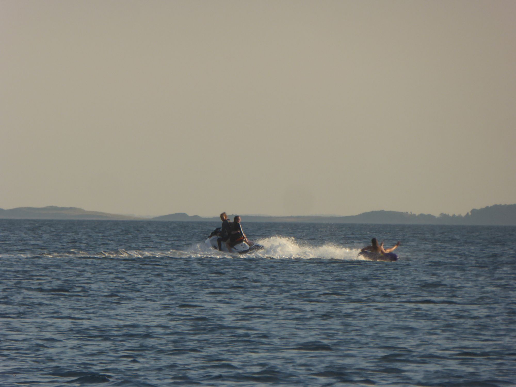 Nicht weit vom Hafen lege ich mich an eine Boje. Am Strand ist noch viel los. Es wird gebadet, gepaddelt, Jet-Skis gefahren und Wasserski gelaufen...
