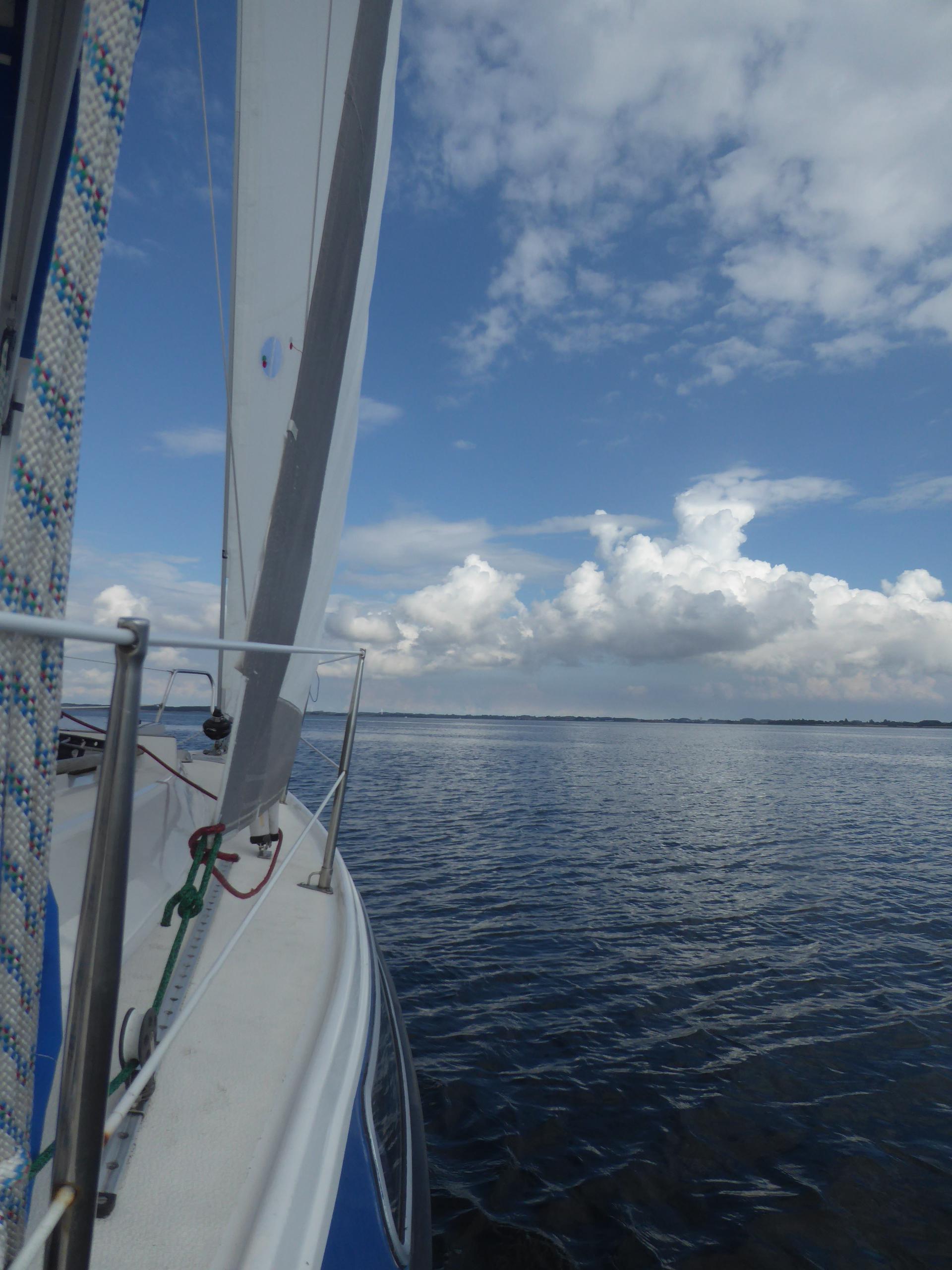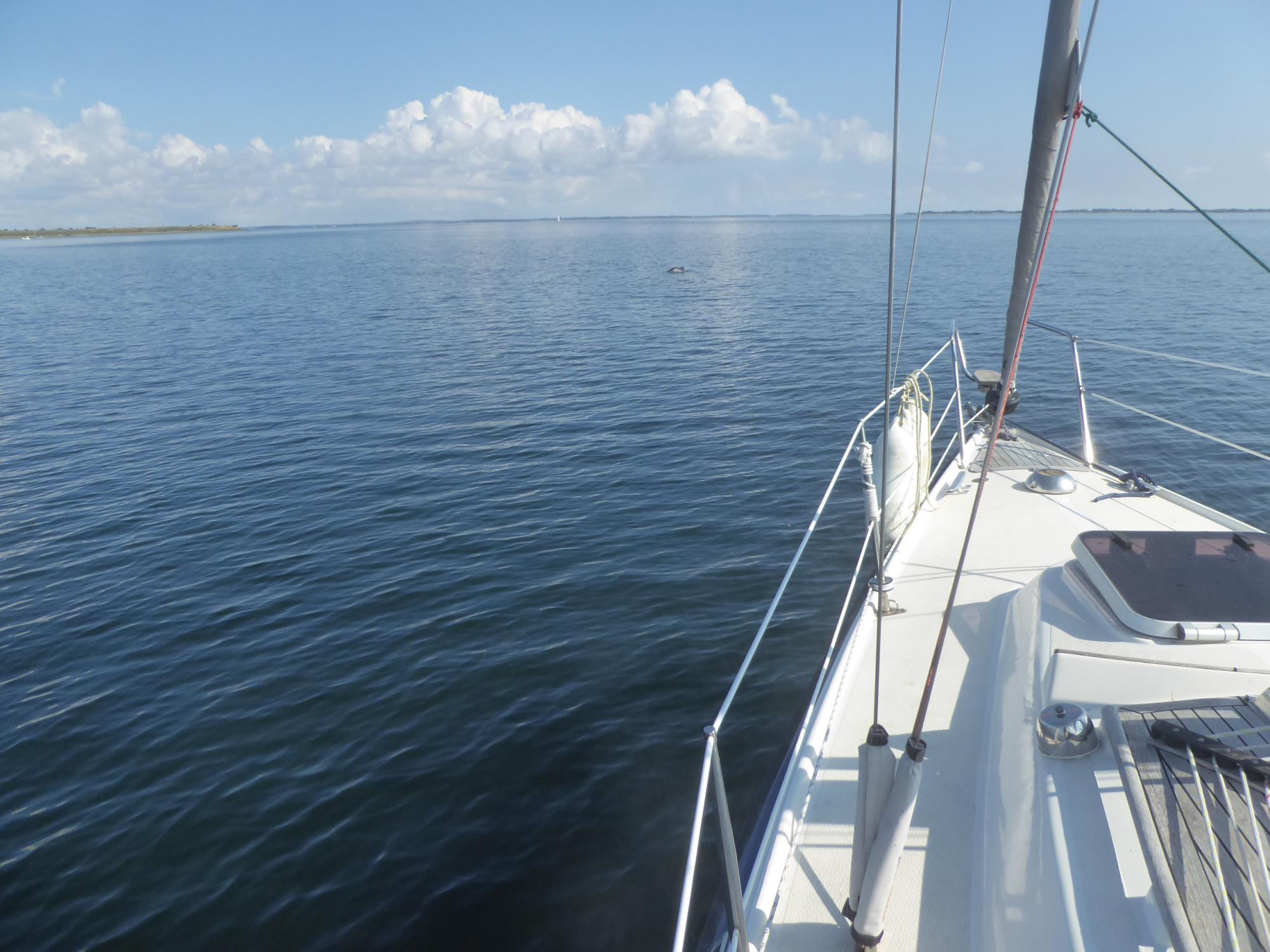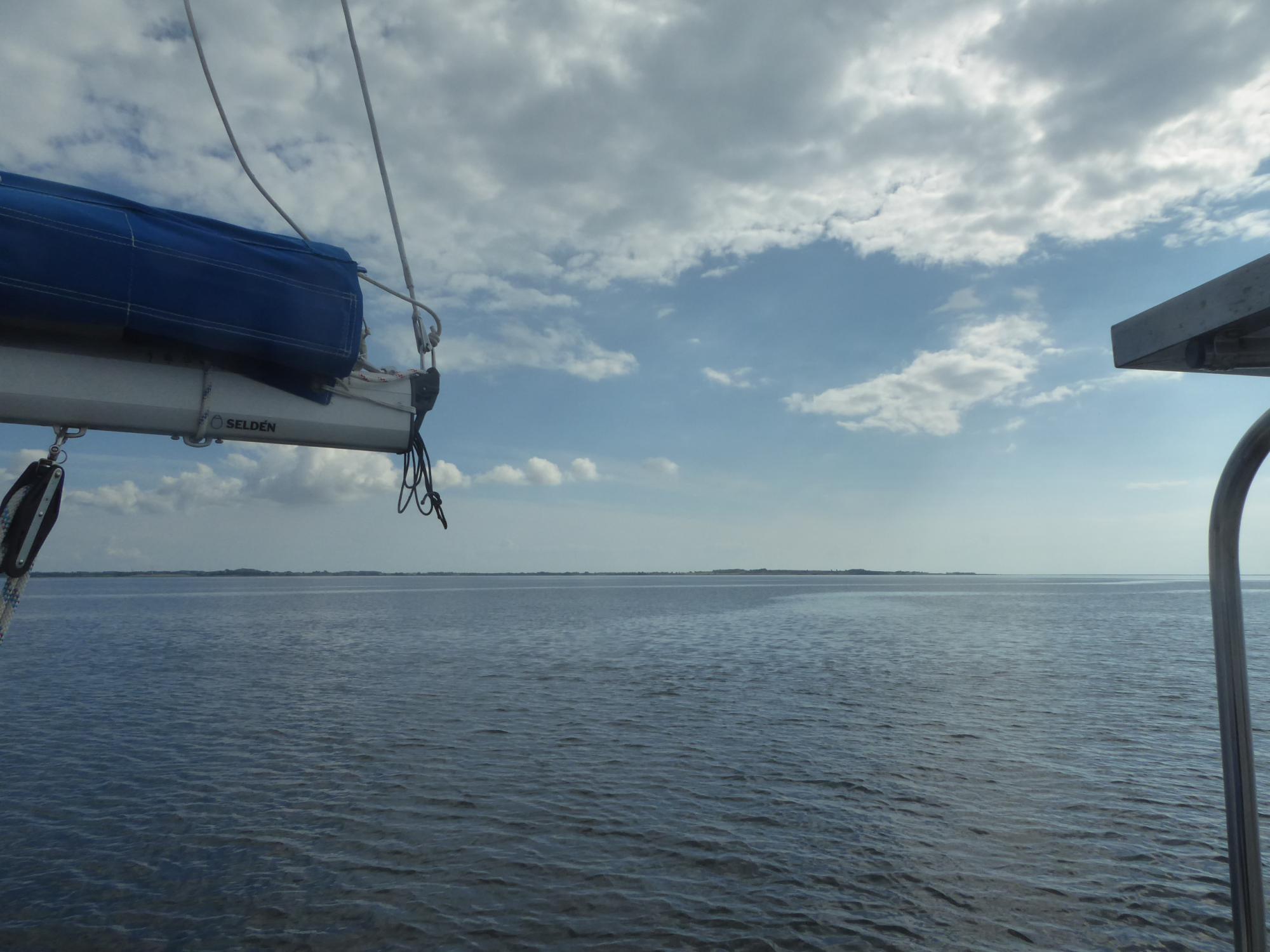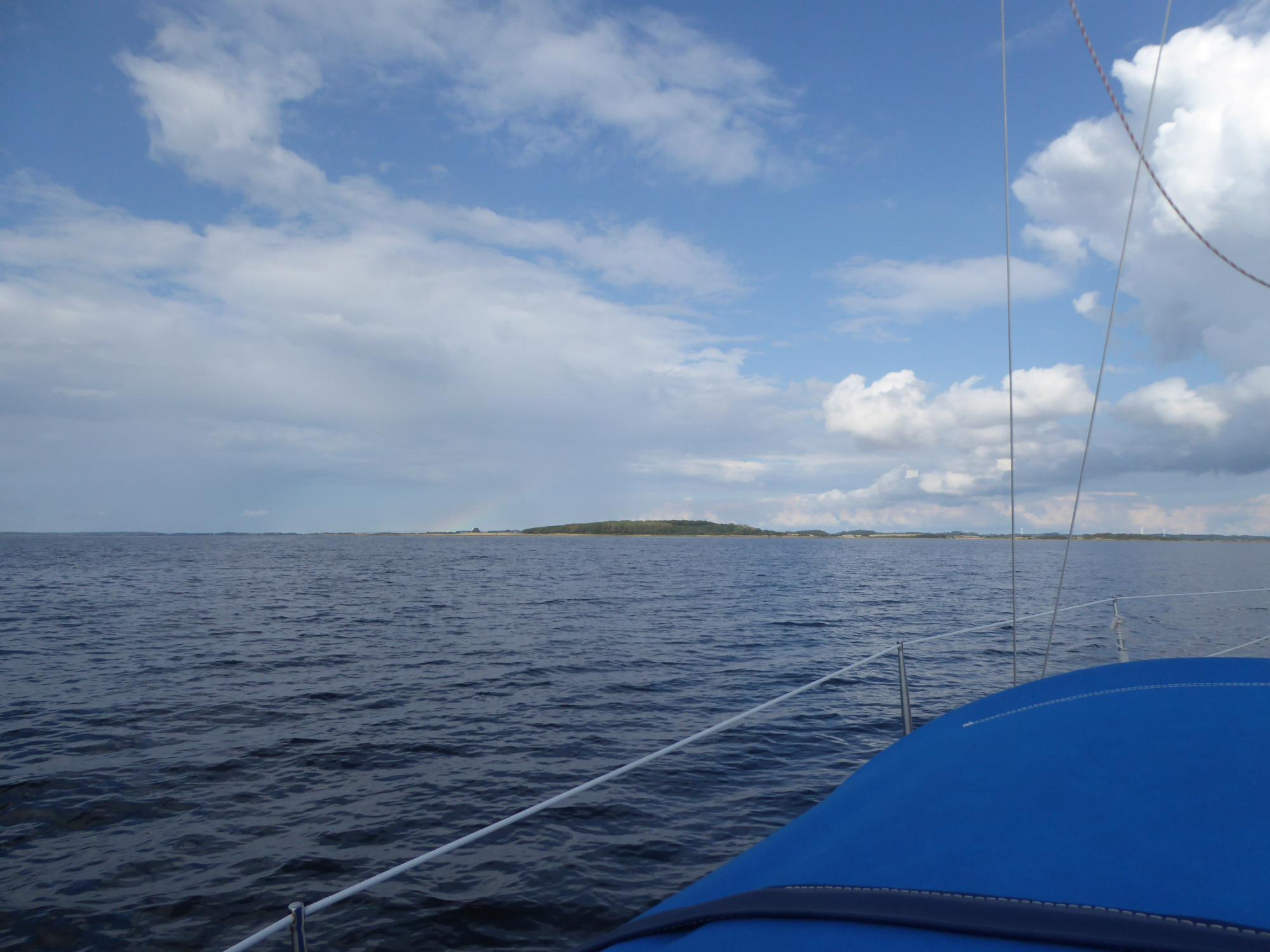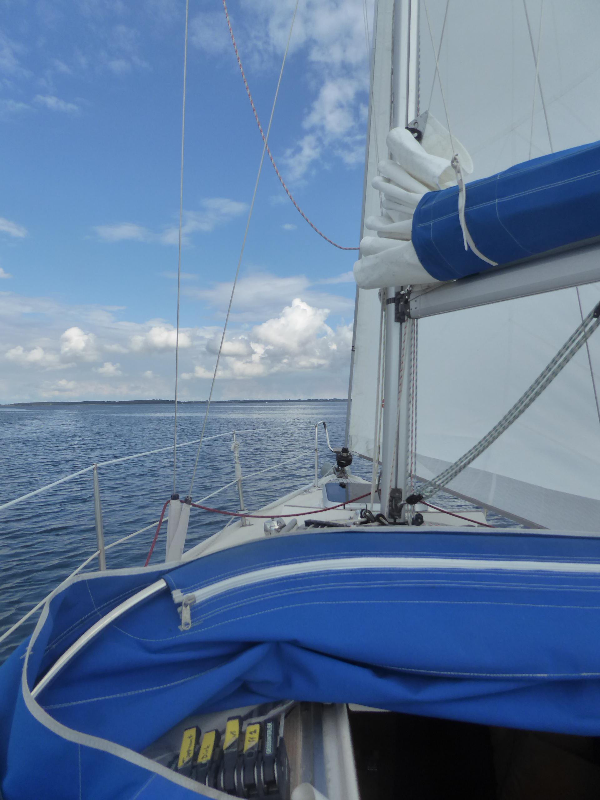 Mittags um eins kommt ein kleines bisschen Wind. Ich hole den Anker ein und bis ich loskomme ist der Wind wieder weg. Nach einer halben Stunde Motorfahrt geht wieder ein leichter Hauch aus Südwest. Genug um mit der Genua einen Knoten Fahrt zu machen. Später wird es noch ein wenig mehr und dreht auf Nord bis Nordost. Ich lese nur in Badehose auf dem Vorschiff und zische hoch am Wind über das glatte Wasser.