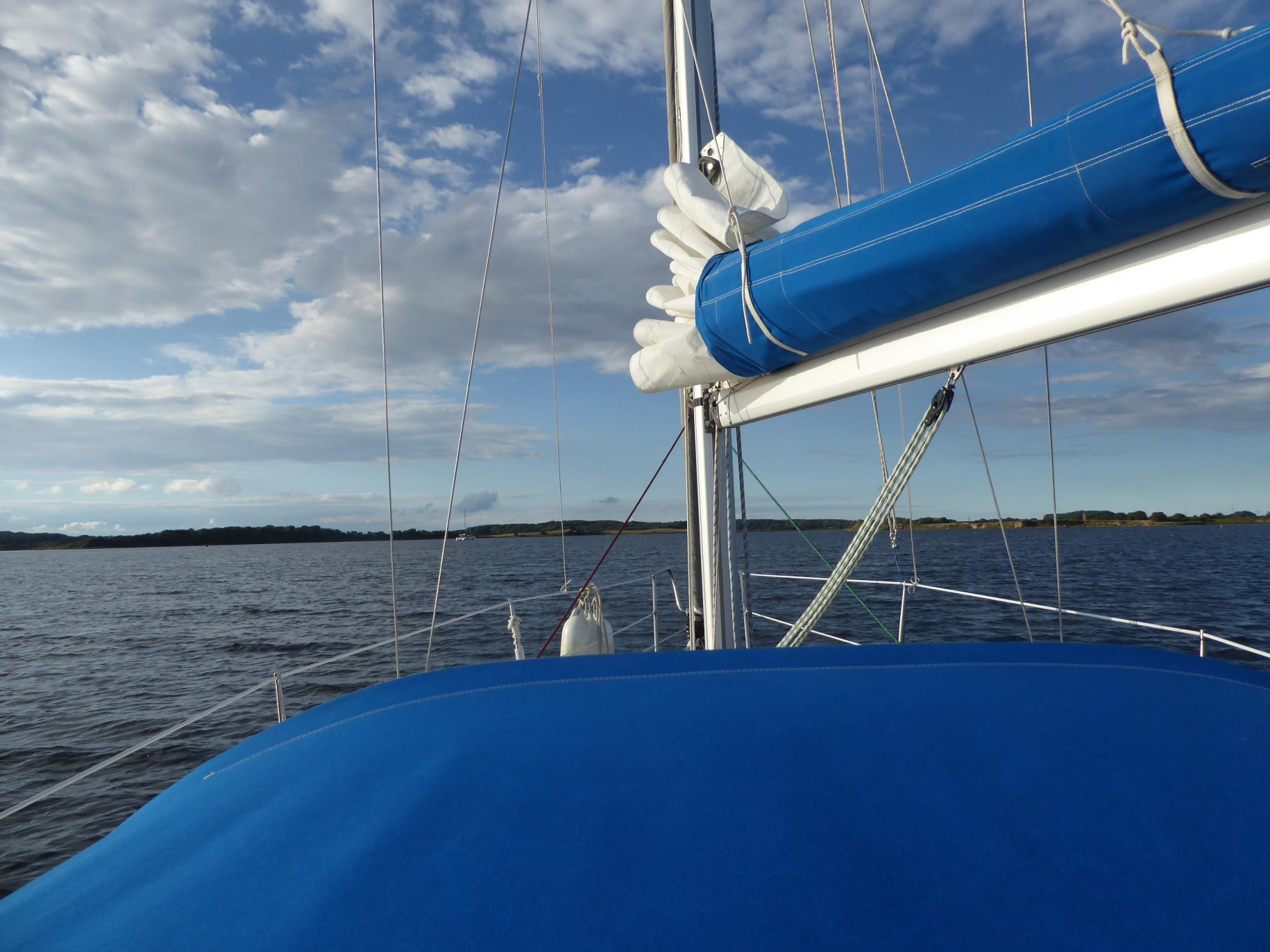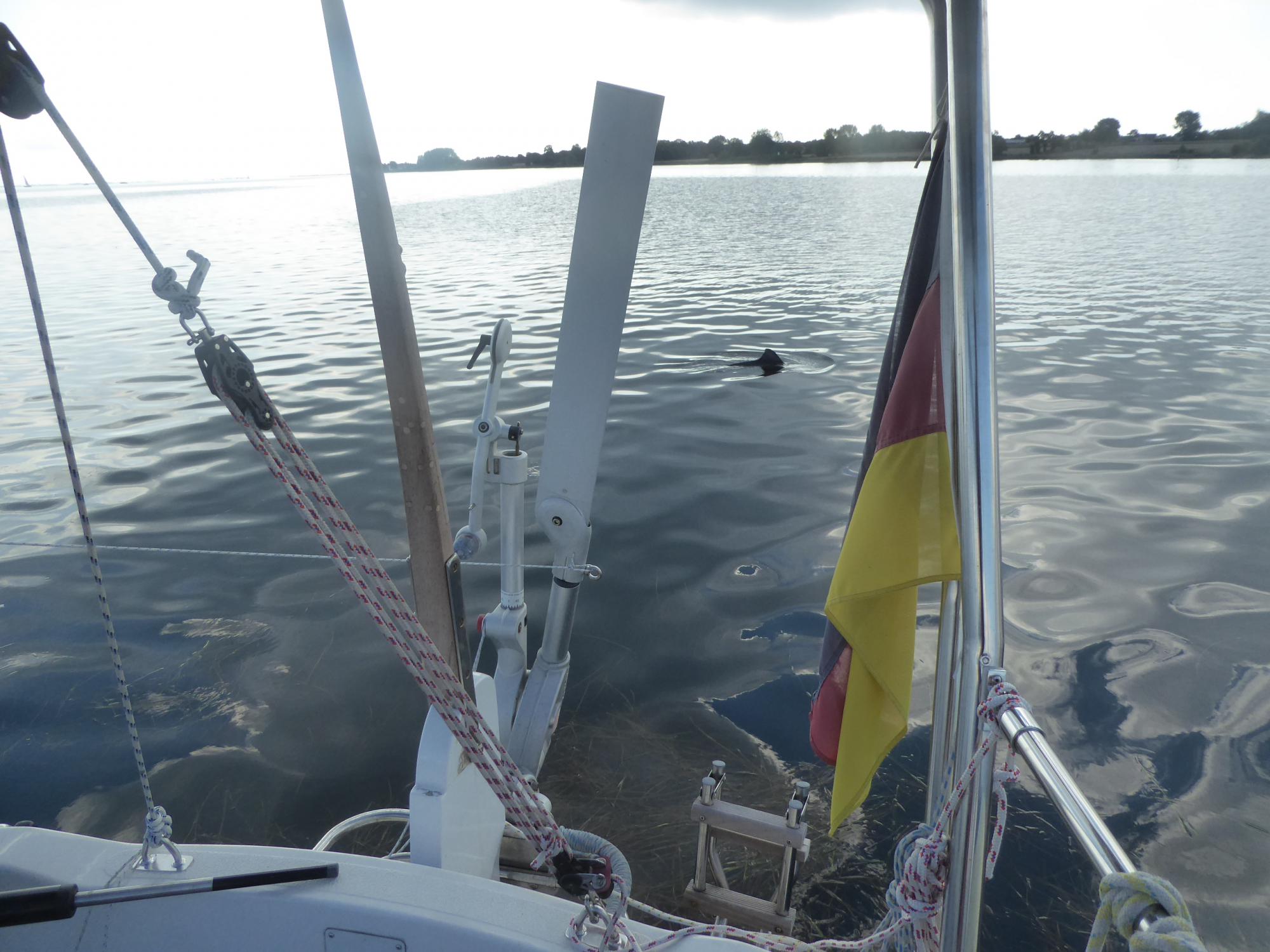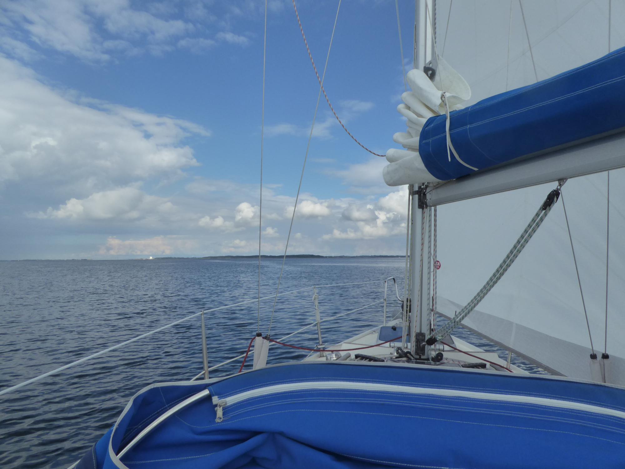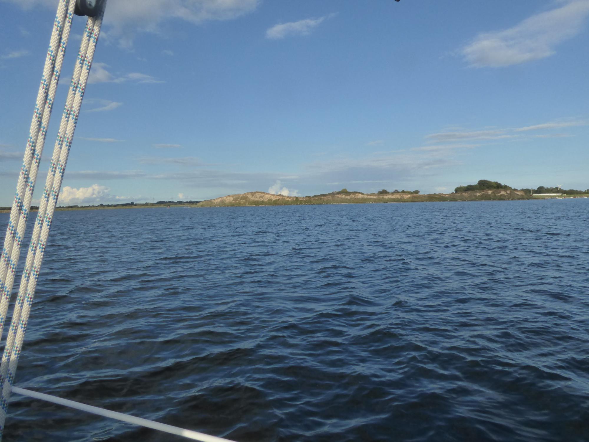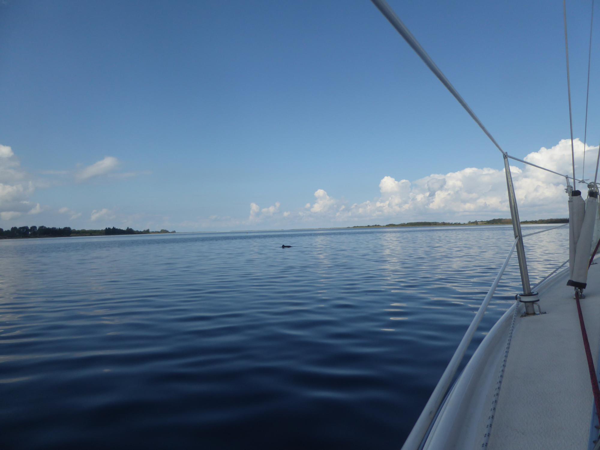 Mittags um eins kommt ein kleines bisschen Wind. Ich hole den Anker ein und bis ich loskomme ist der Wind wieder weg. Nach einer halben Stunde Motorfahrt geht wieder ein leichter Hauch aus Südwest. Genug um mit der Genua einen Knoten Fahrt zu machen. Später wird es noch ein wenig mehr und dreht auf Nord bis Nordost. Ich lese nur in Badehose auf dem Vorschiff und zische hoch am Wind über das glatte Wasser.