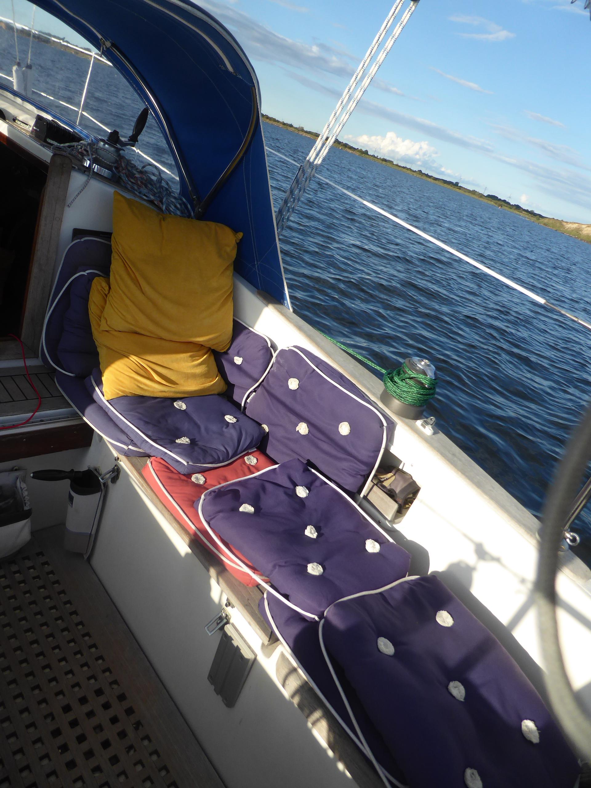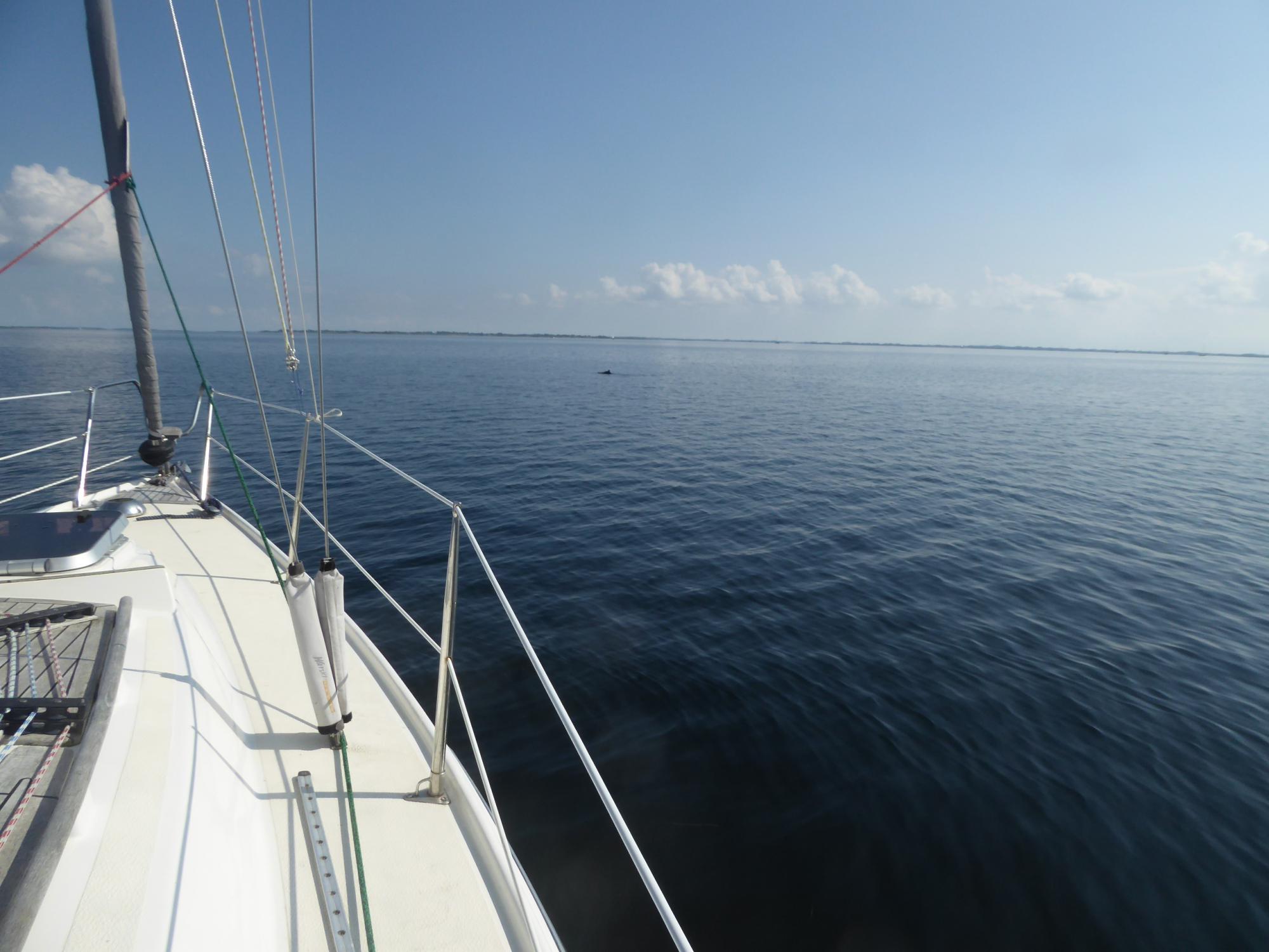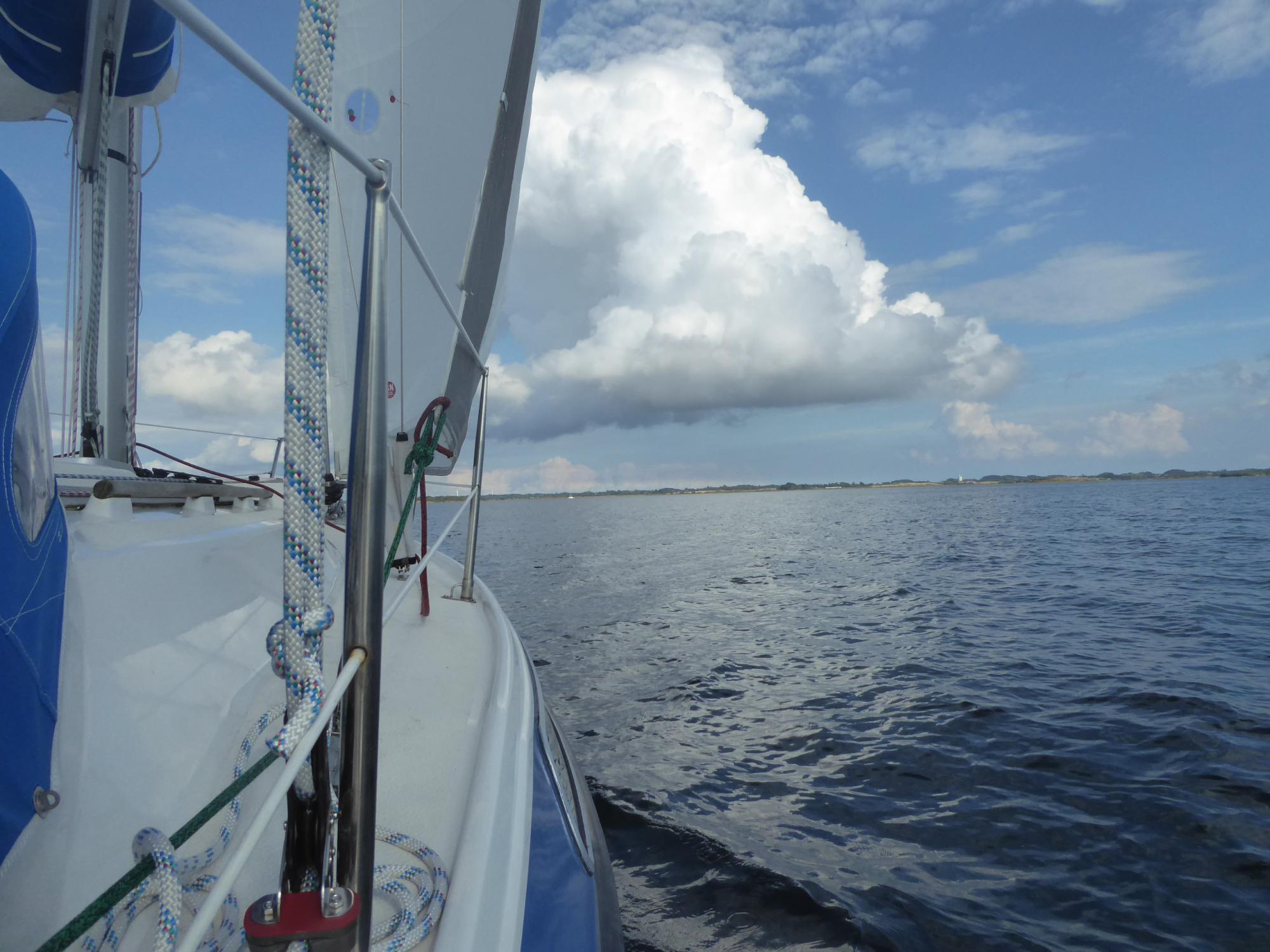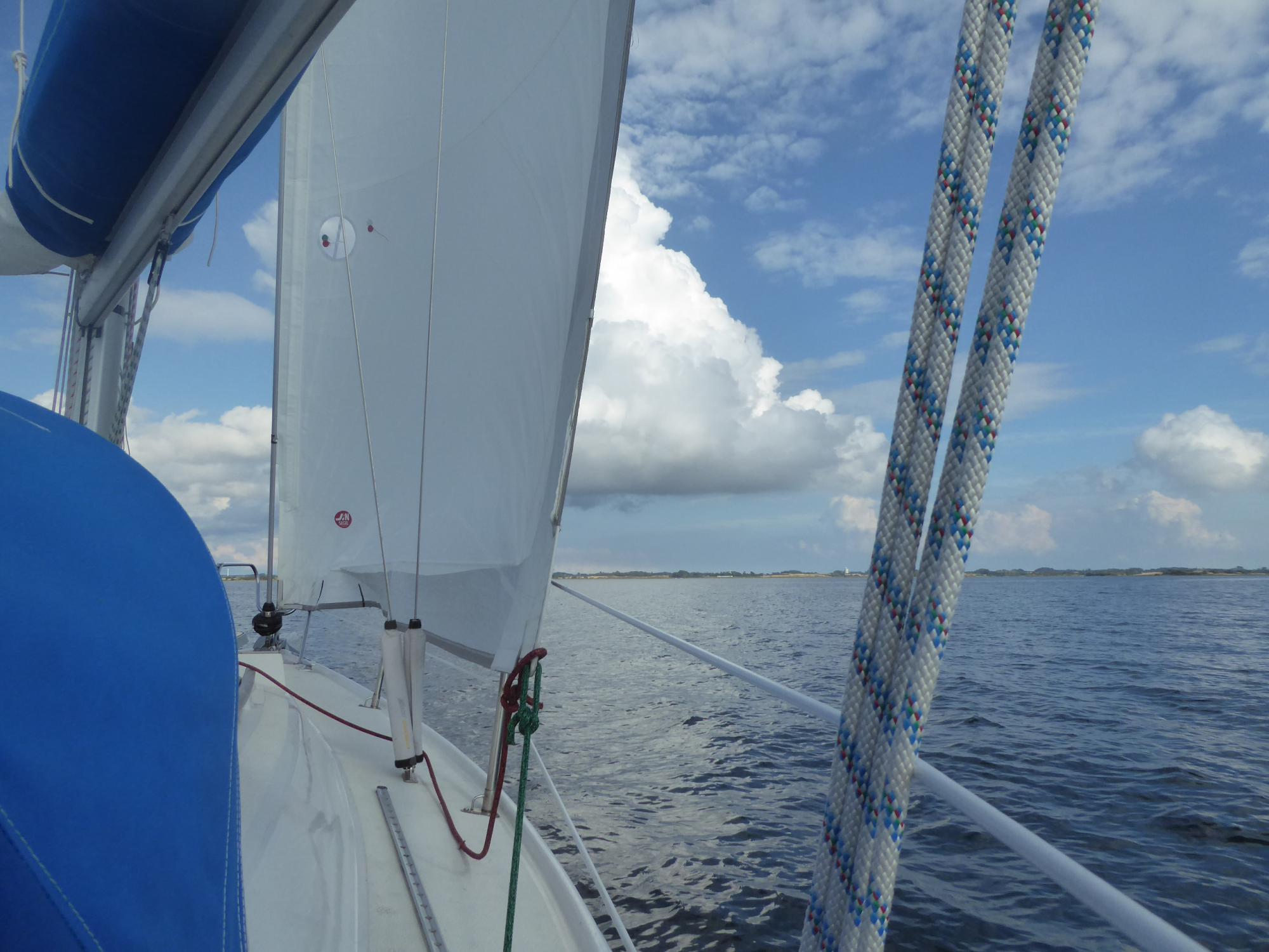 Mittags um eins kommt ein kleines bisschen Wind. Ich hole den Anker ein und bis ich loskomme ist der Wind wieder weg. Nach einer halben Stunde Motorfahrt geht wieder ein leichter Hauch aus Südwest. Genug um mit der Genua einen Knoten Fahrt zu machen. Später wird es noch ein wenig mehr und dreht auf Nord bis Nordost. Ich lese nur in Badehose auf dem Vorschiff und zische hoch am Wind über das glatte Wasser.