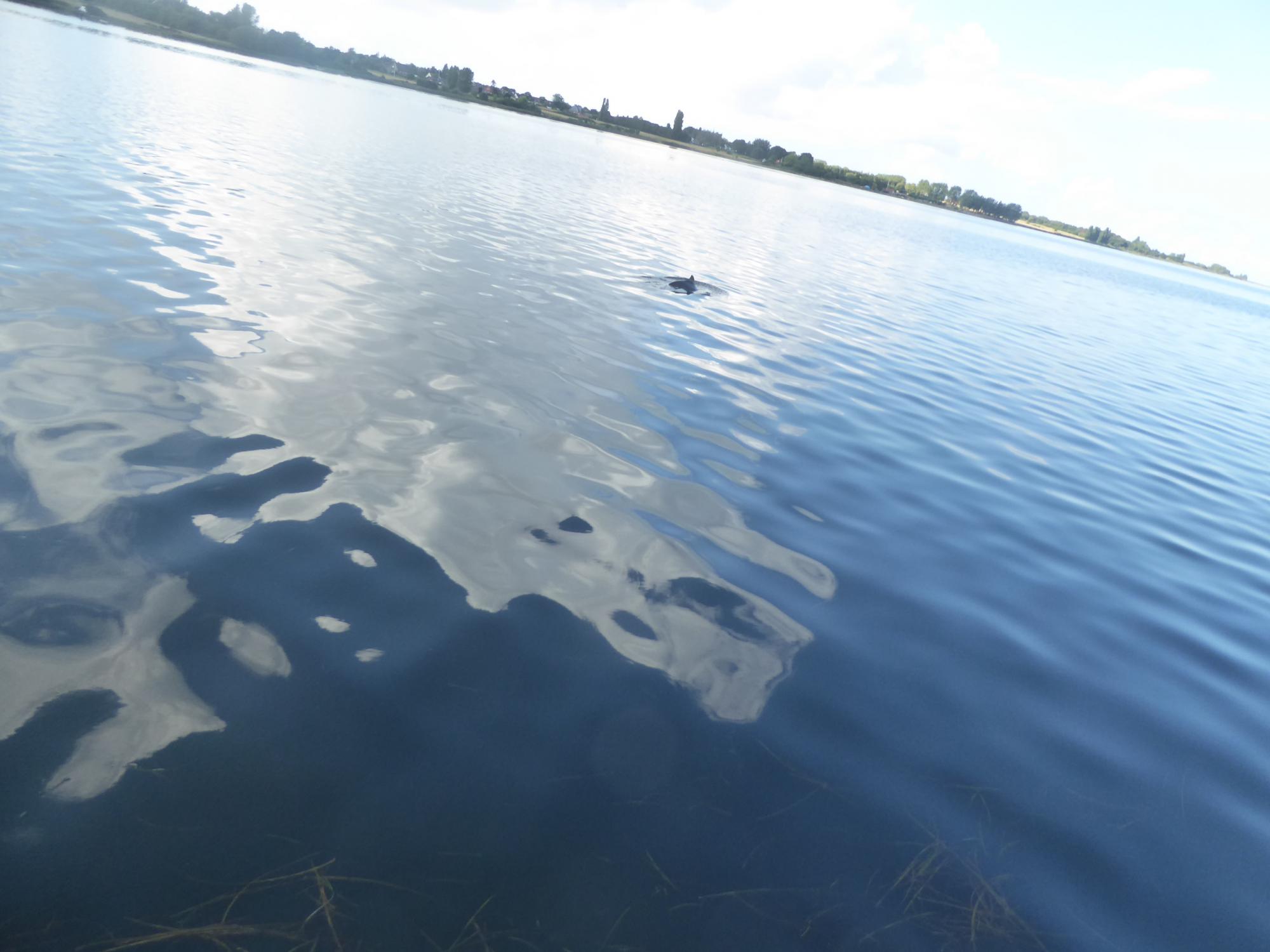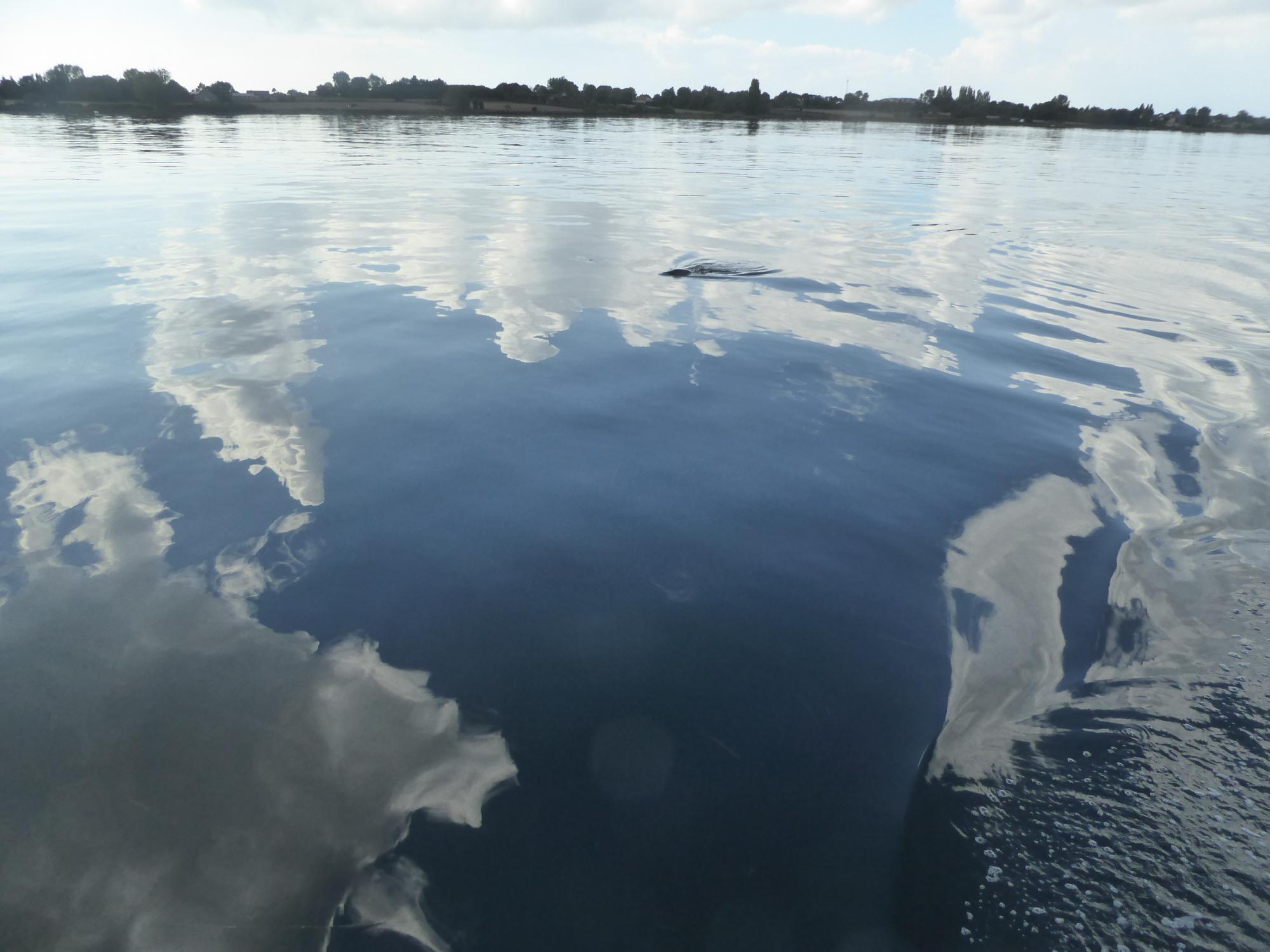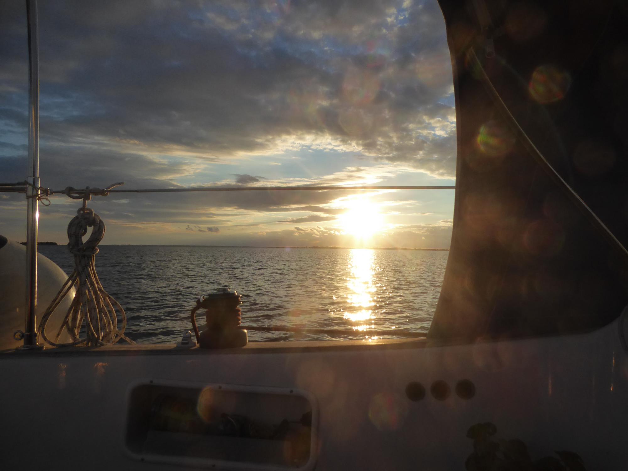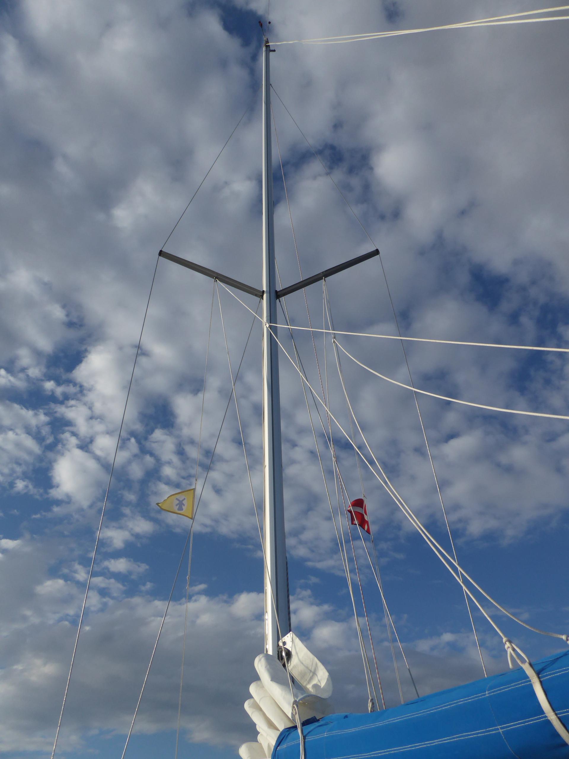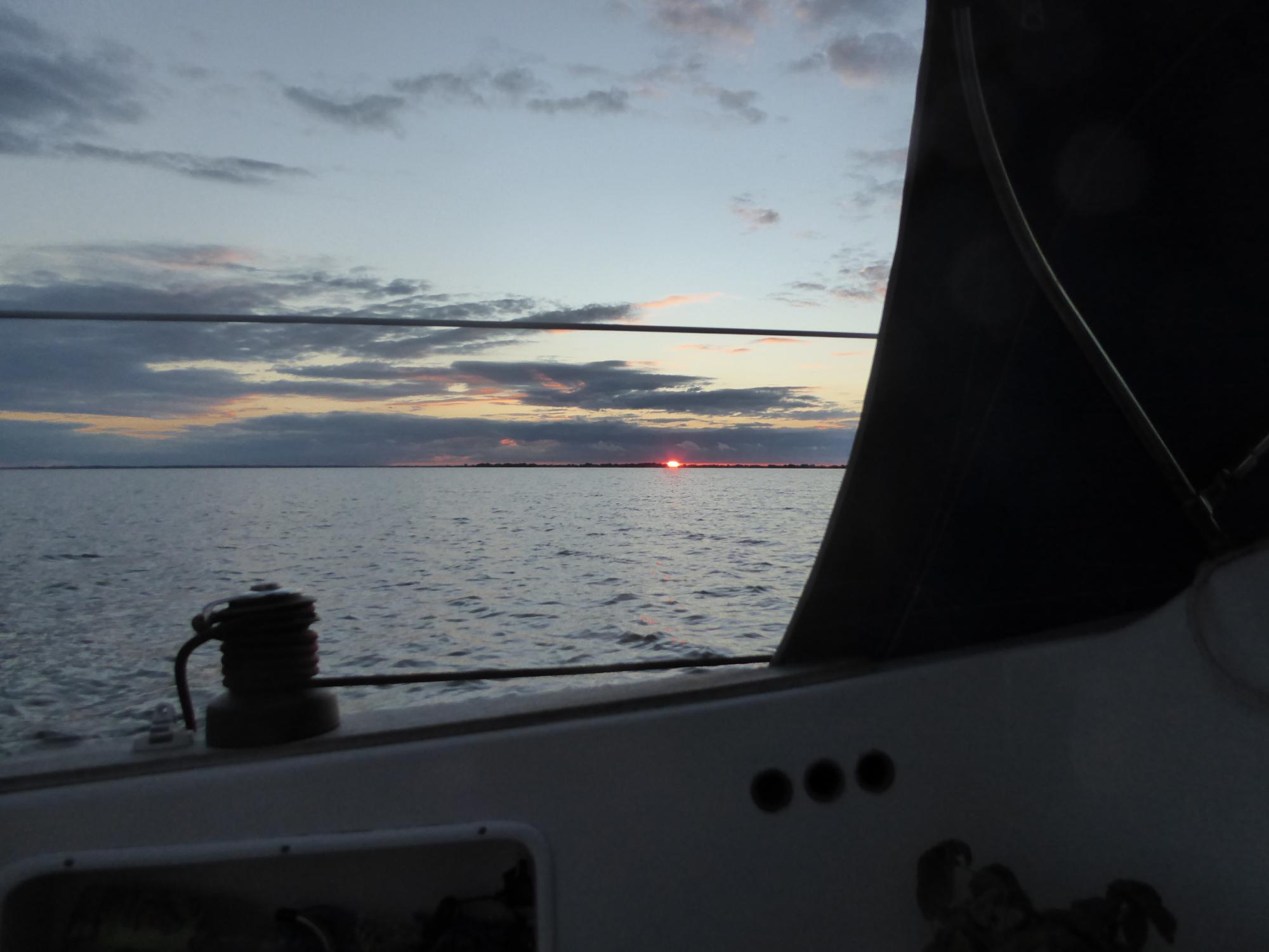 Mittags um eins kommt ein kleines bisschen Wind. Ich hole den Anker ein und bis ich loskomme ist der Wind wieder weg. Nach einer halben Stunde Motorfahrt geht wieder ein leichter Hauch aus Südwest. Genug um mit der Genua einen Knoten Fahrt zu machen. Später wird es noch ein wenig mehr und dreht auf Nord bis Nordost. Ich lese nur in Badehose auf dem Vorschiff und zische hoch am Wind über das glatte Wasser.