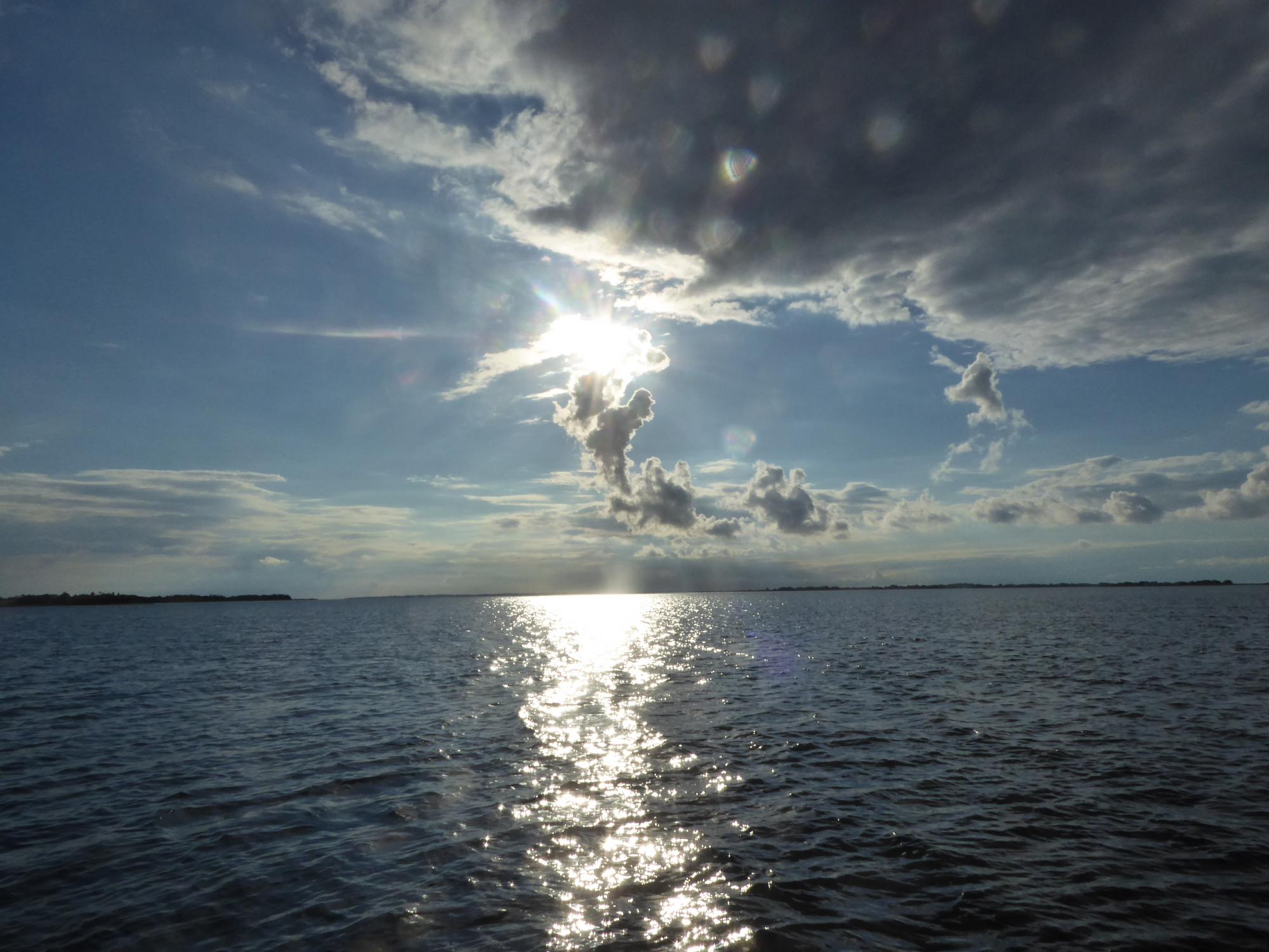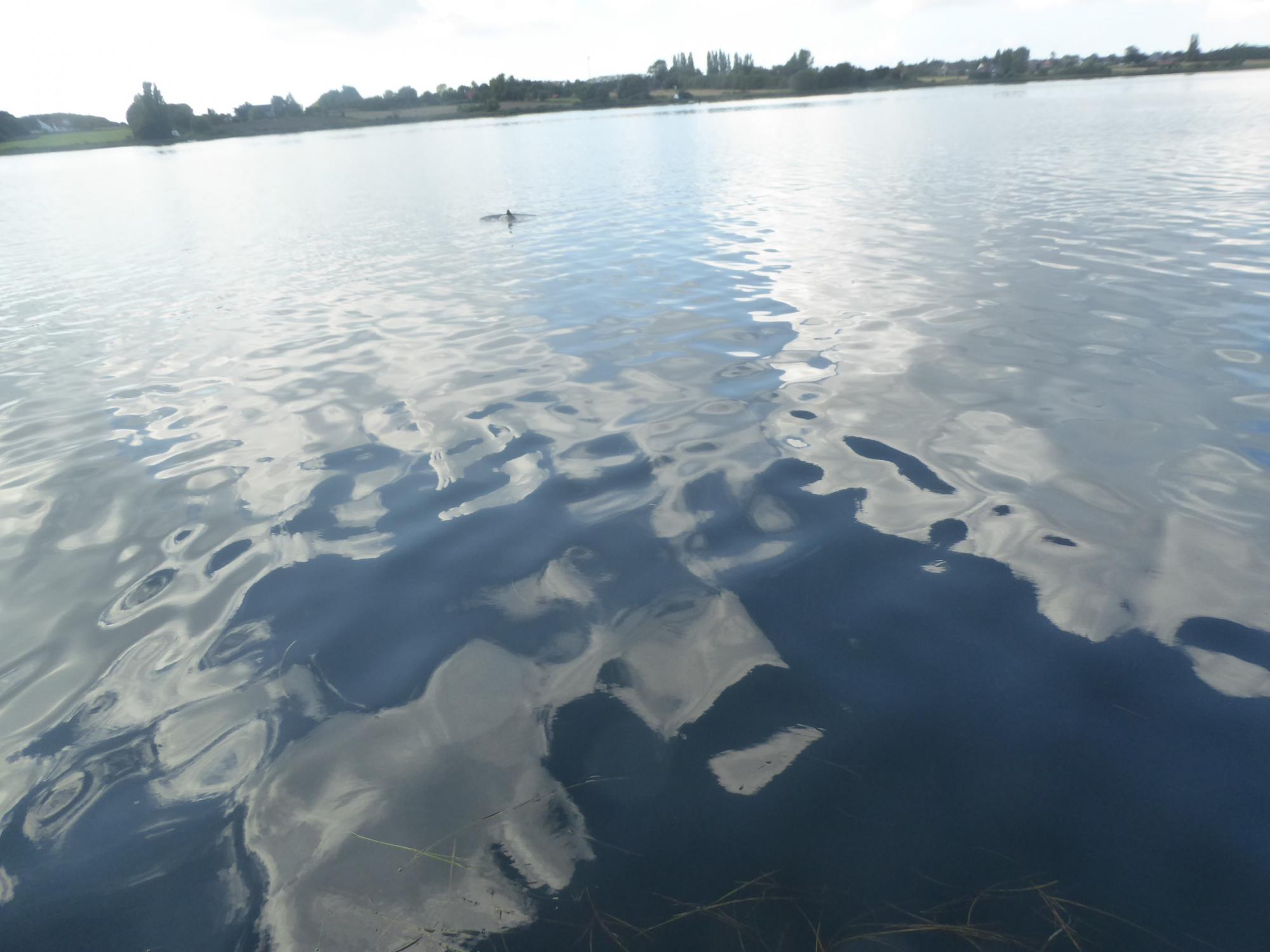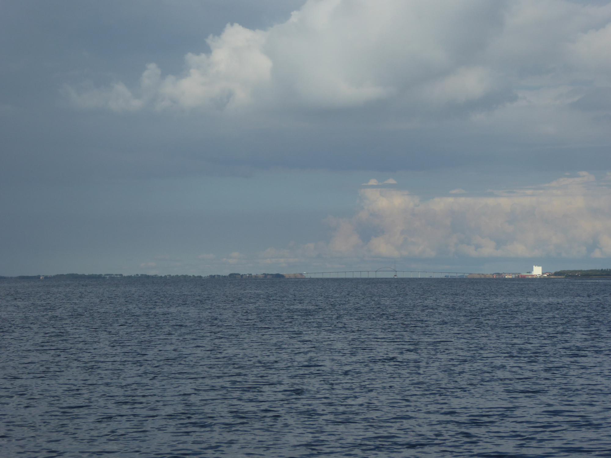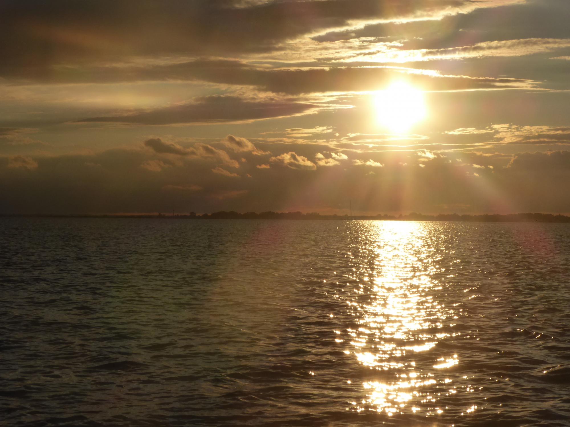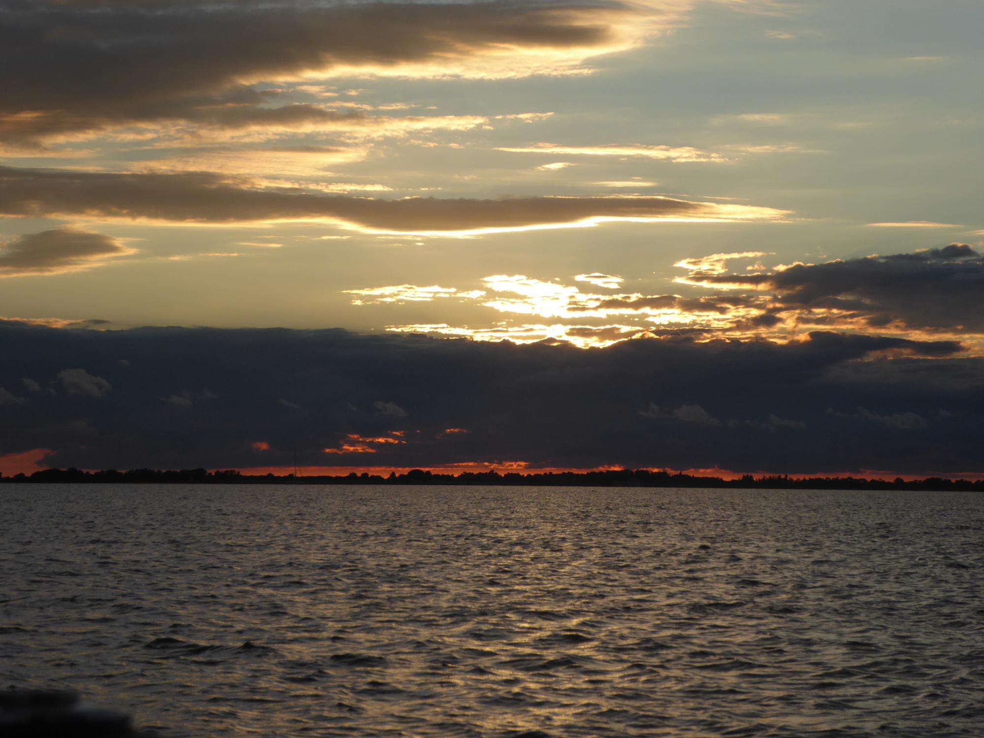 Mittags um eins kommt ein kleines bisschen Wind. Ich hole den Anker ein und bis ich loskomme ist der Wind wieder weg. Nach einer halben Stunde Motorfahrt geht wieder ein leichter Hauch aus Südwest. Genug um mit der Genua einen Knoten Fahrt zu machen. Später wird es noch ein wenig mehr und dreht auf Nord bis Nordost. Ich lese nur in Badehose auf dem Vorschiff und zische hoch am Wind über das glatte Wasser.