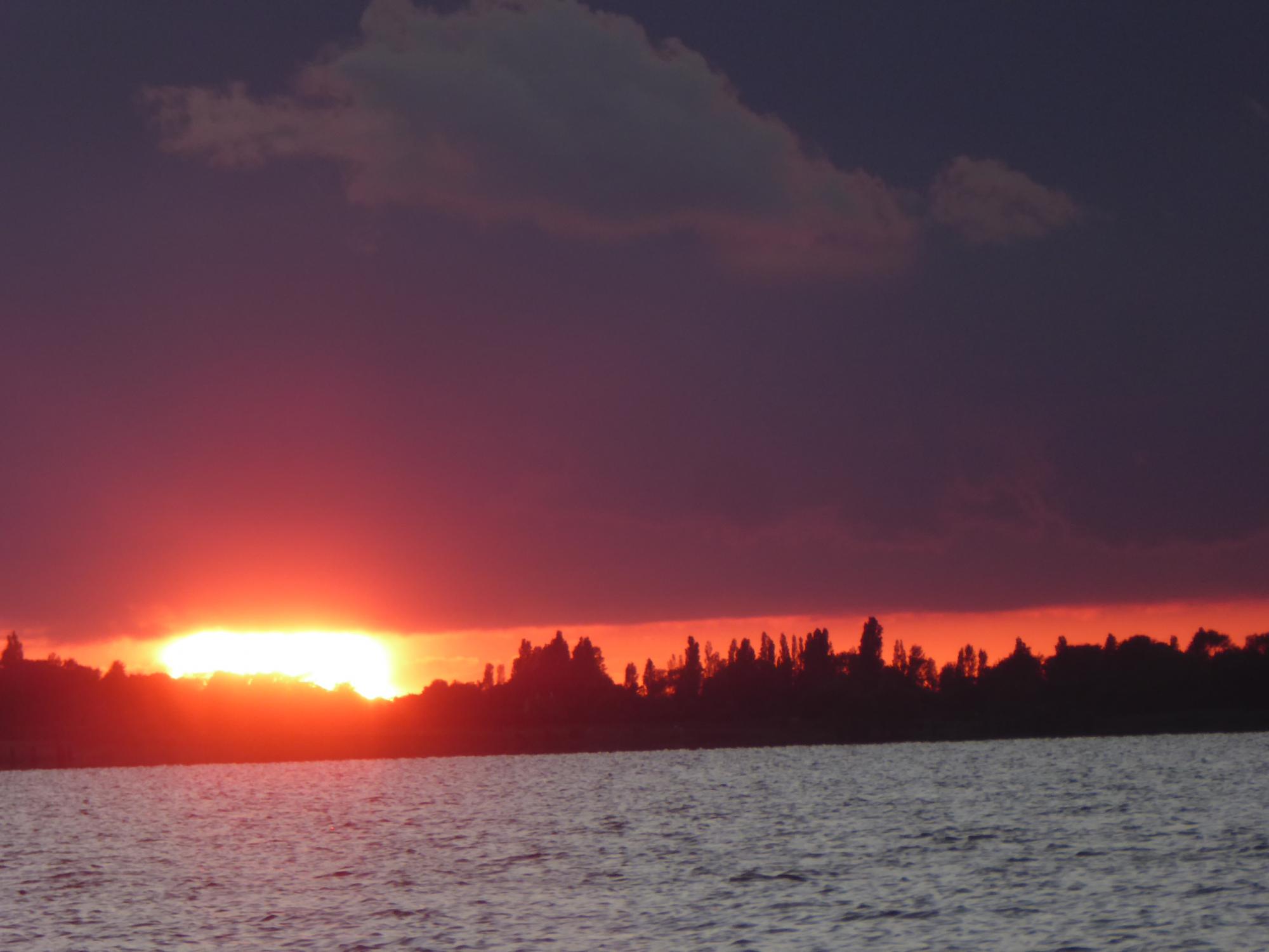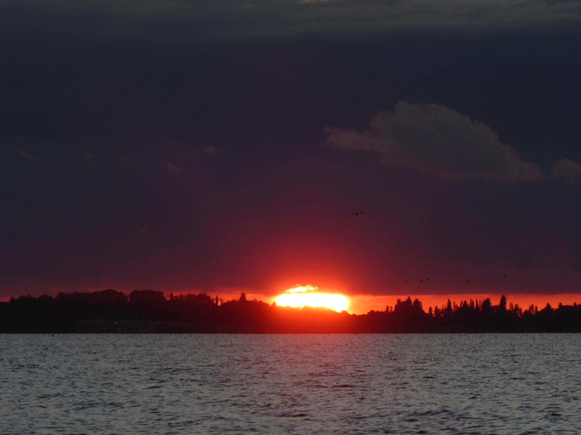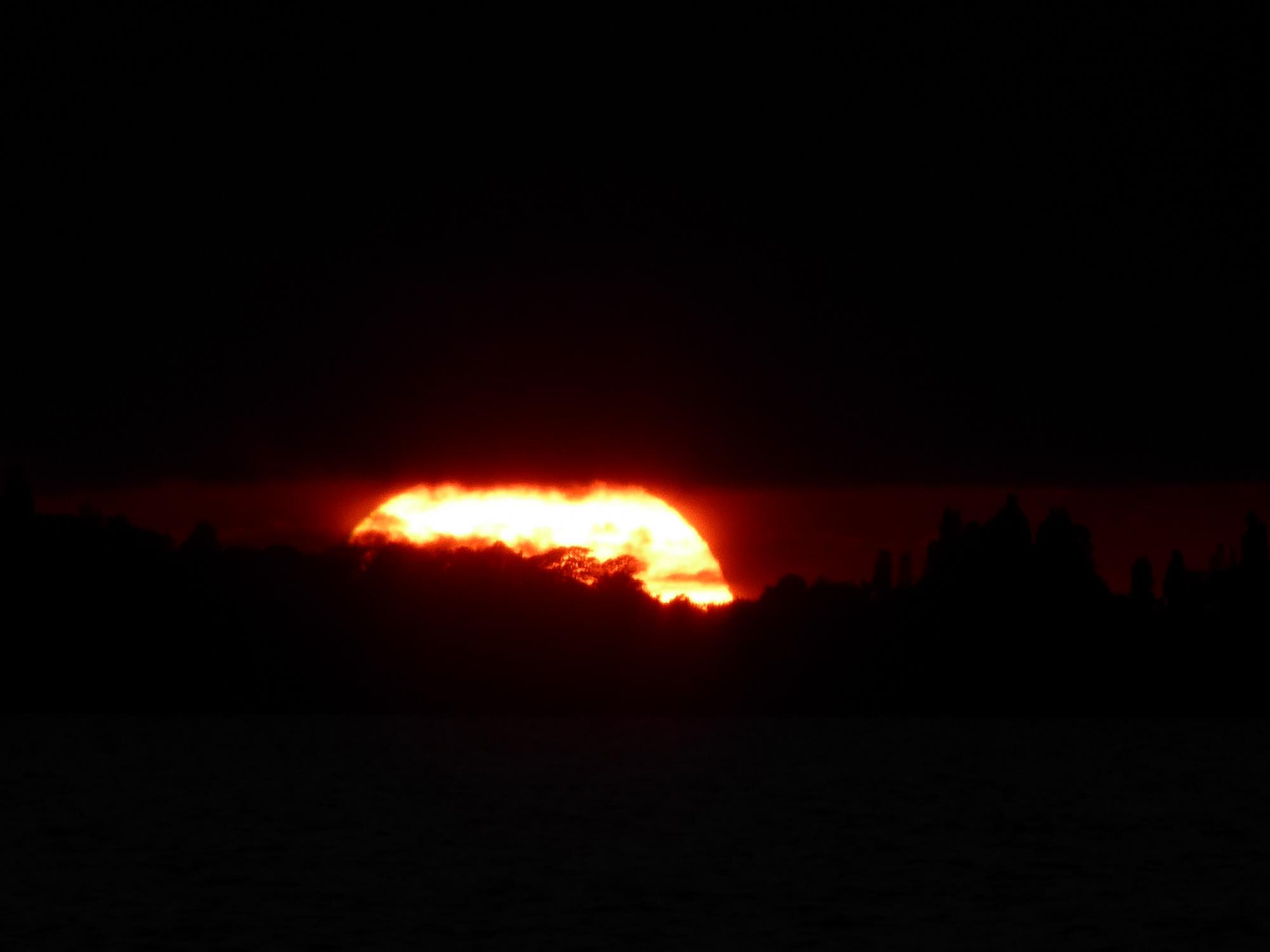 Der Sonnenuntergang ist heute nur ein schmaler, glutroter Streifen zwischen Strynøs Küste und einer schweren, schwarzen Wolkenbank.