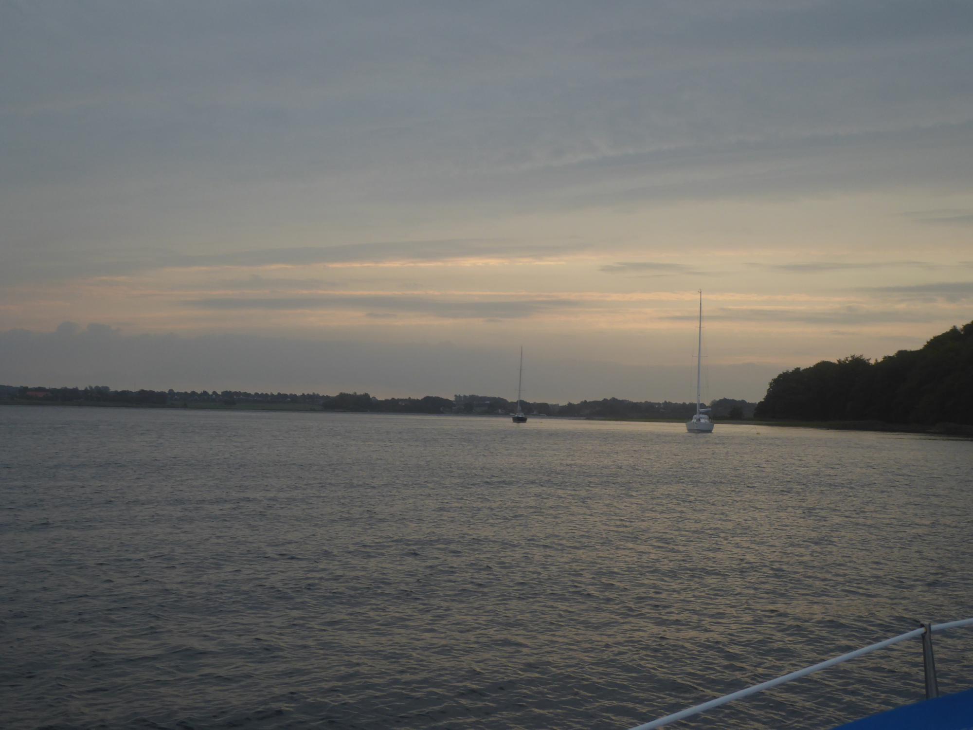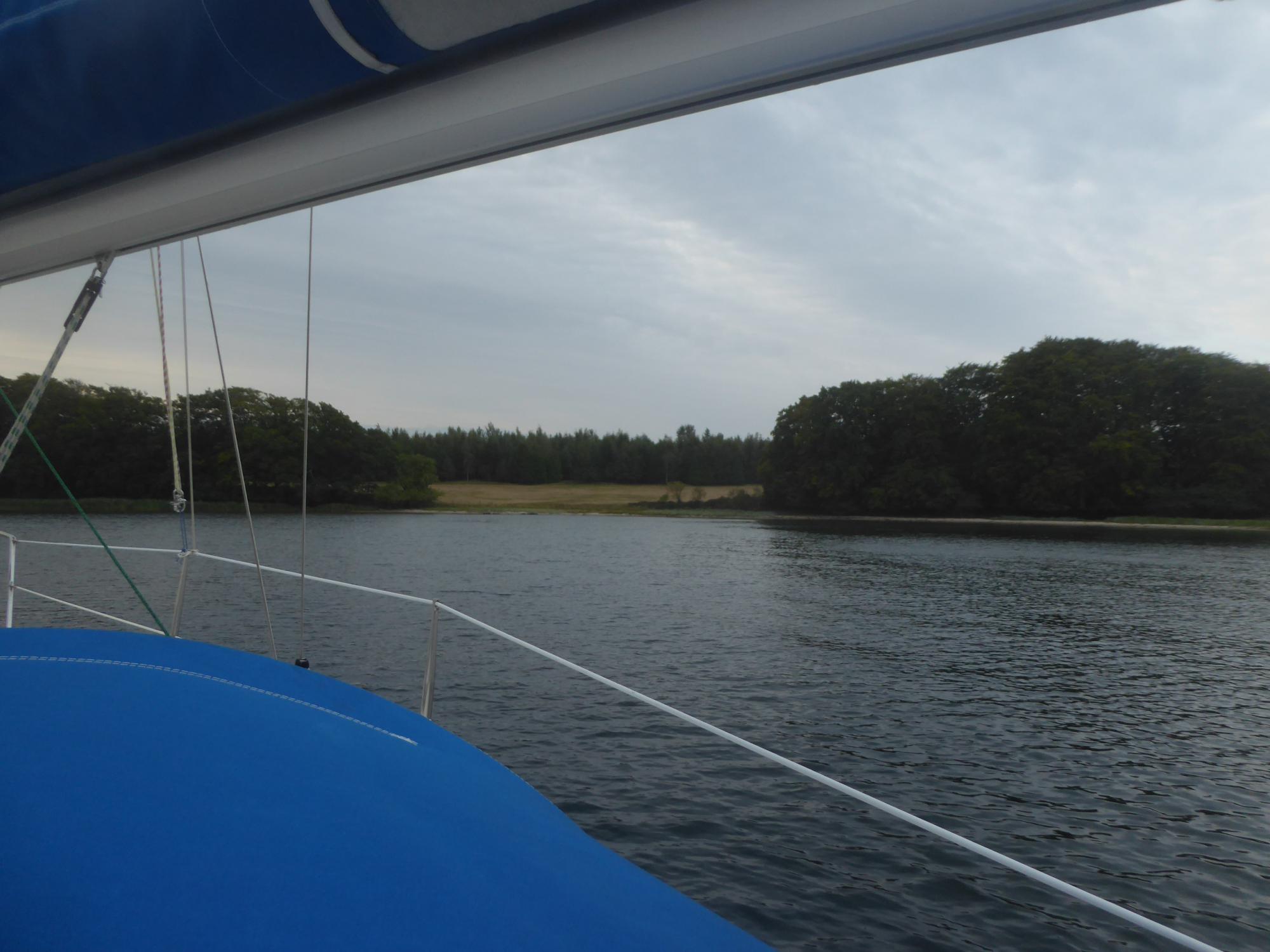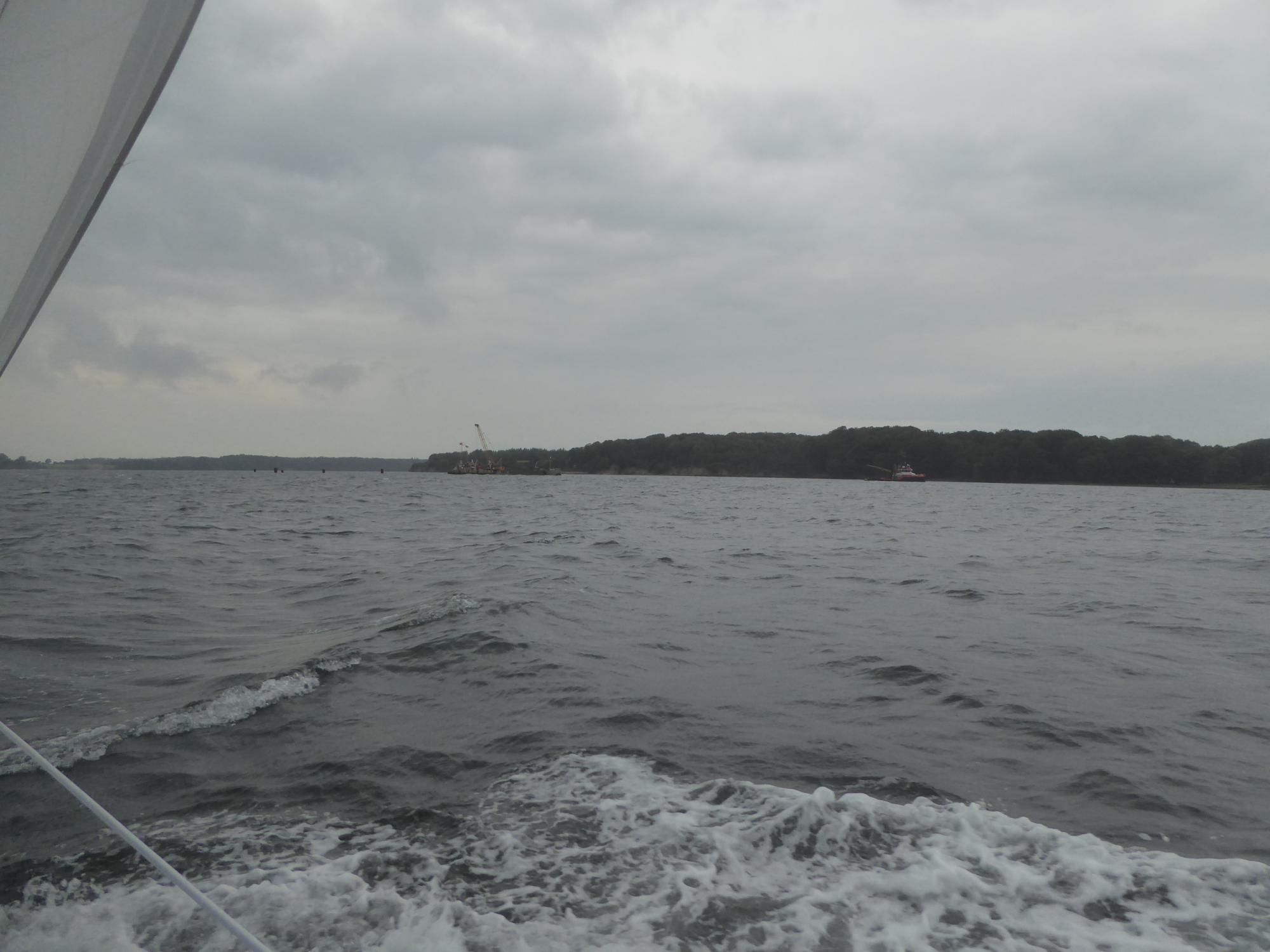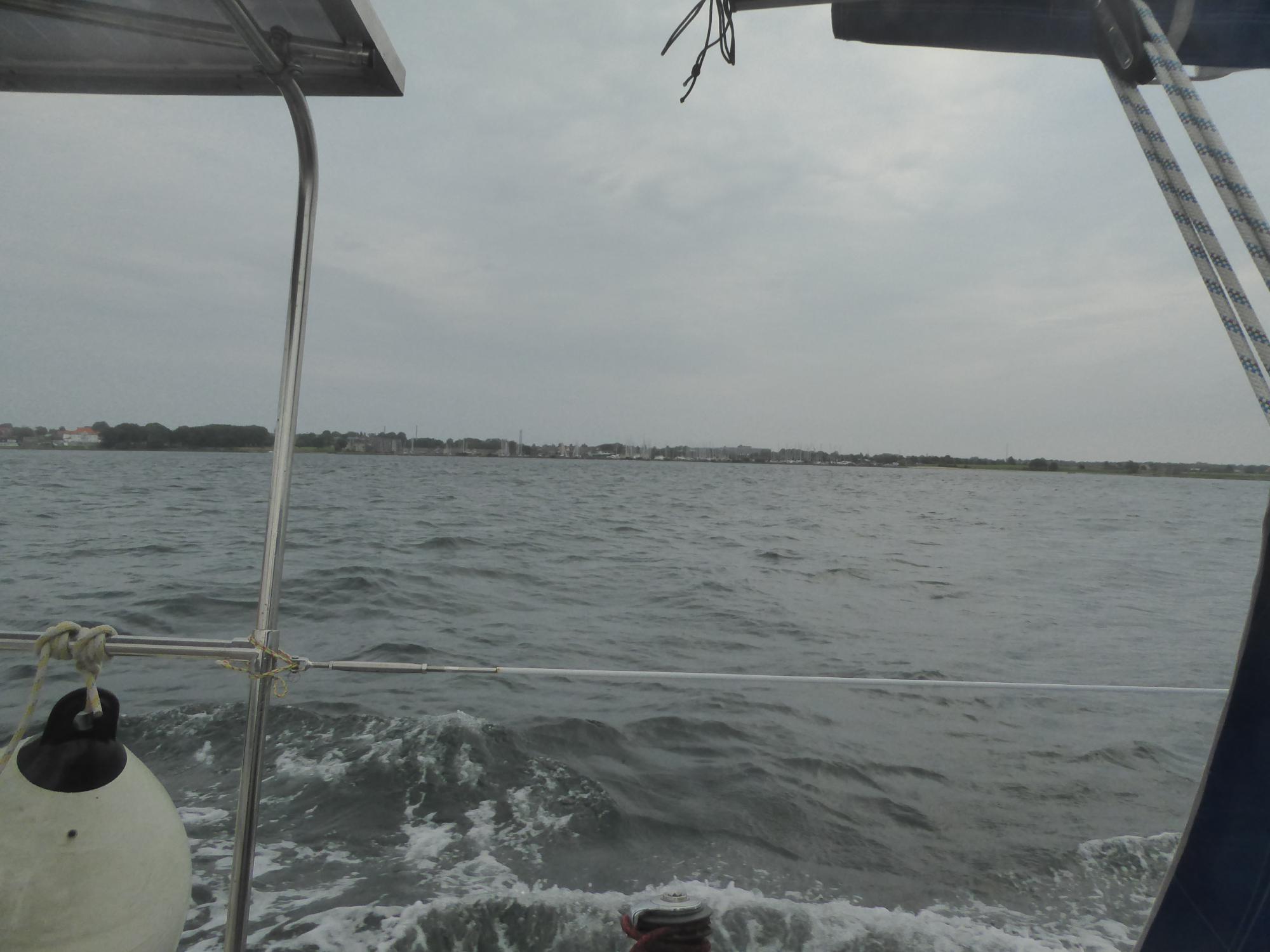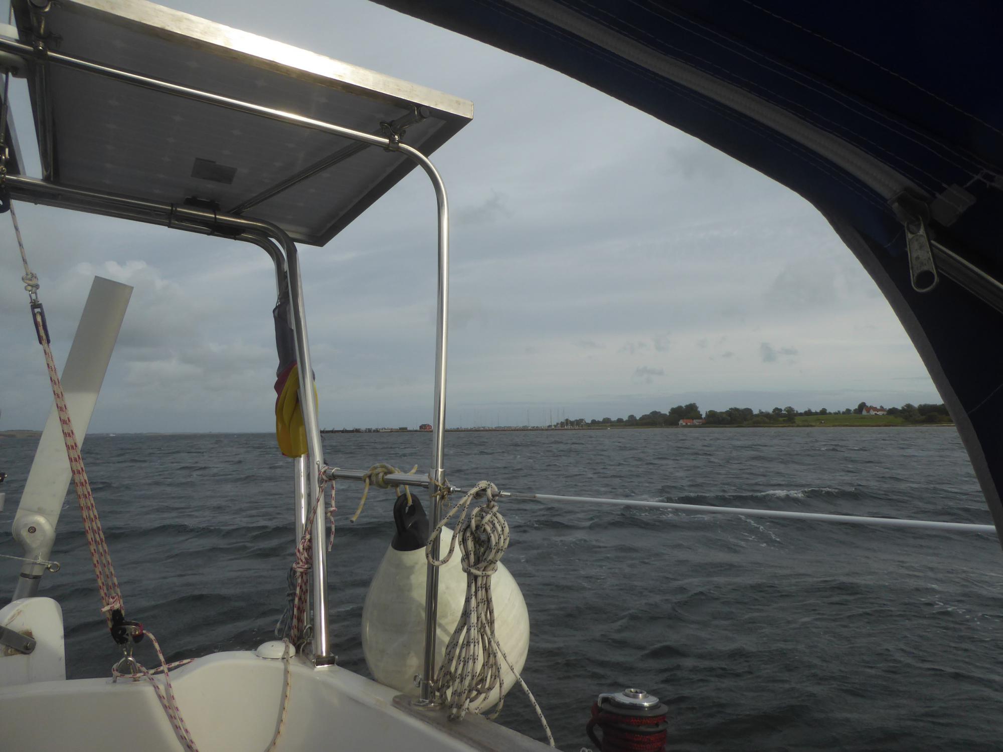 Kurz vor neun setze ich das Groß, gleich mit zweitem Reff, und lichte den Anker. Im Fænøsund geht kaum ein Lüftchen, dass es weht ist allerdings ein paar hundert Meter weiter schon zu sehen. Bei Windstärke sechs aus Südwest setze ich noch die Genua, eingerollt zum zweiten Reffstreifen.