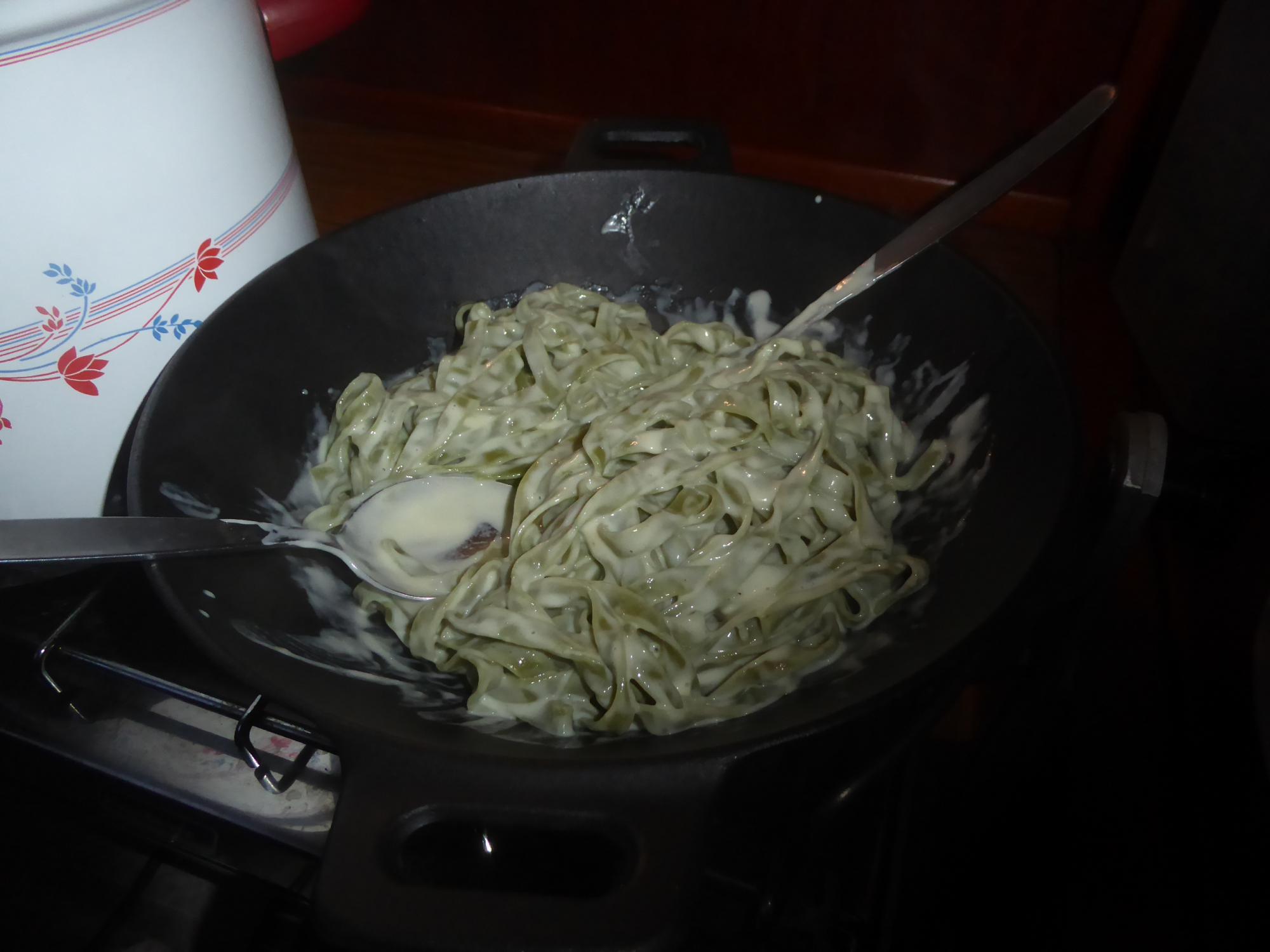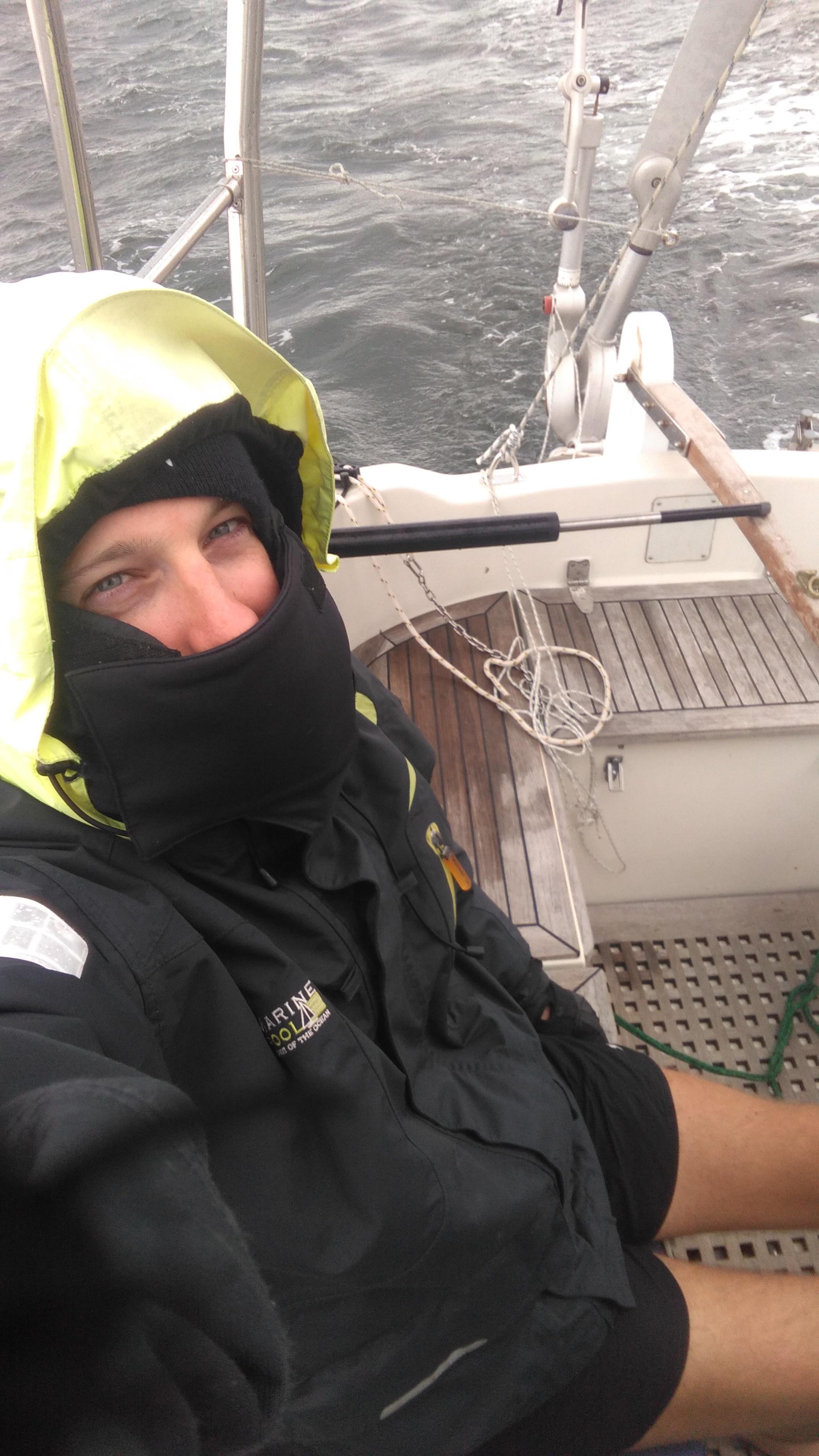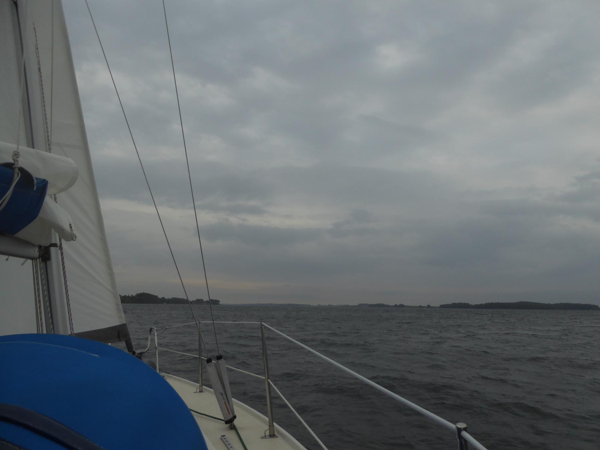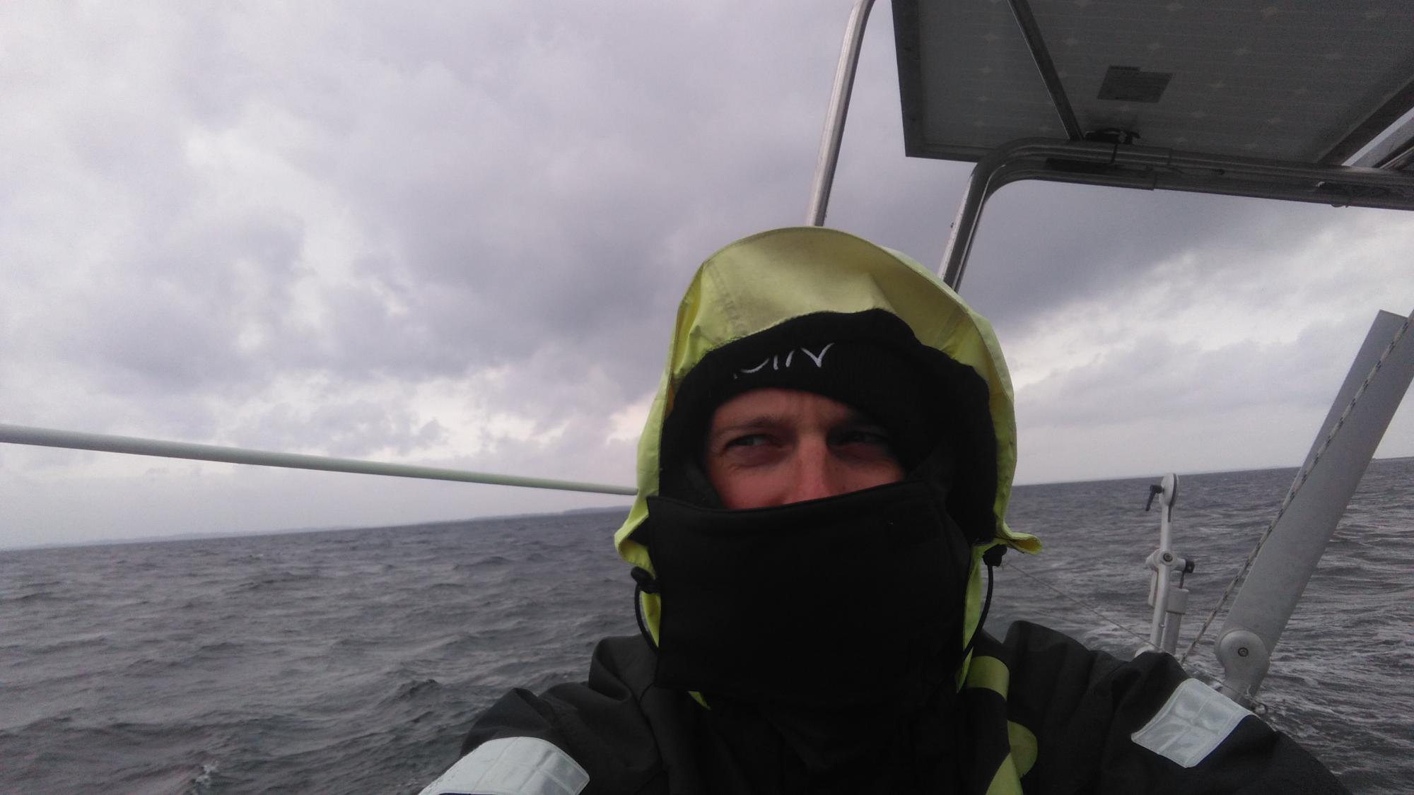 Zur Mittagszeit dreht der Wind tatsächlich auf Westsüdwest. Legt aber auch kräftig zu und bleibt von jetzt an bei Windstärke sieben. Vier Stunden lang geben sich tiefschwarze Wolkenbänke die Hand. Jedesmal mit noch mehr Wind und einer Dosis Regen. Ab zwei Uhr nachmittags pendelt es sich dann bei 8 Beaufort ein. Um halb vier versuche ich das Vorsegel noch weiter zu reffen. Ohne Winsch keine Chance mehr. Die Schot muss also los und verknotet sich dann mit der anderen Genuaschot zu einem dicken Knäuel. Ich nehme das Segel komplett weg und verbringe die nächste Viertelstunde eingehakt zwischen Wanten und Reling damit die Vorschoten zu entknoten während ich von Wellen und Regen geduscht werde.
