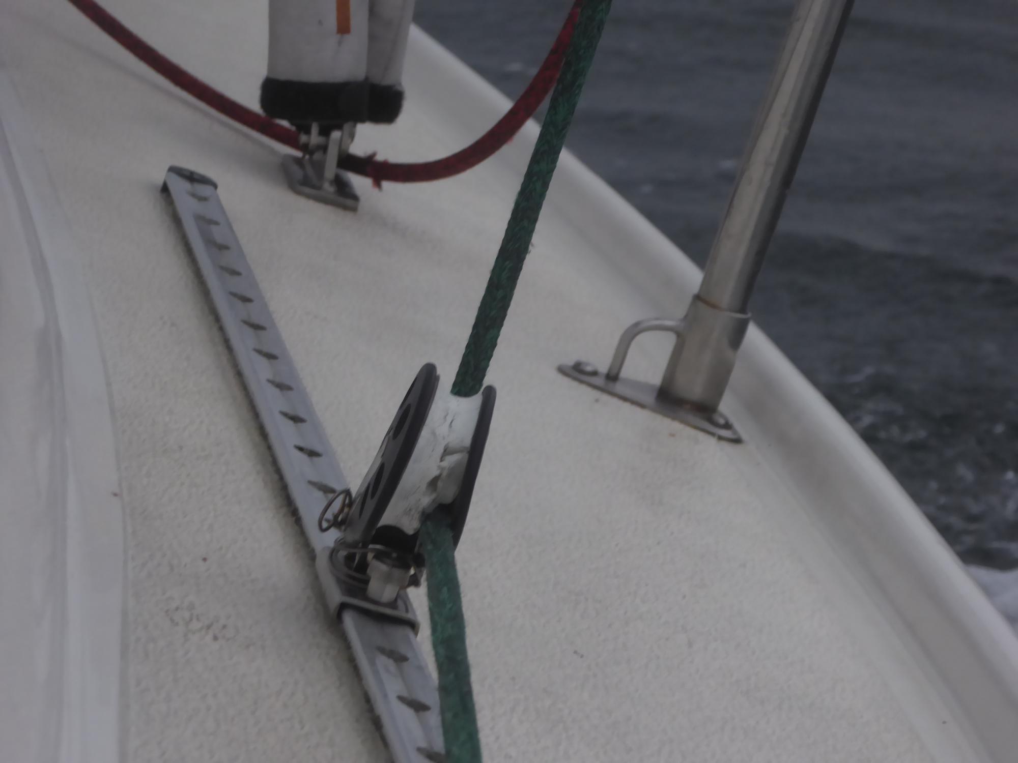 Nach ein paar Wenden merke ich, dass der Genuablock an Steuerbord kaputt ist. Die Scheibe ist zum Teil weggebrochen und beim Dichtholen unter Last schiebt sich die Schot zwischen die kaputte Scheibe und die Backen des Blocks. Gut, dass ich heute hauptsächlich auf Backbordbug segeln werde. Daumen drücken, dass der Wind wie angekündigt weiter westlich dreht, denn auf Steuerbordbug kann ich das Segel so nicht mehr ganz dichtholen.