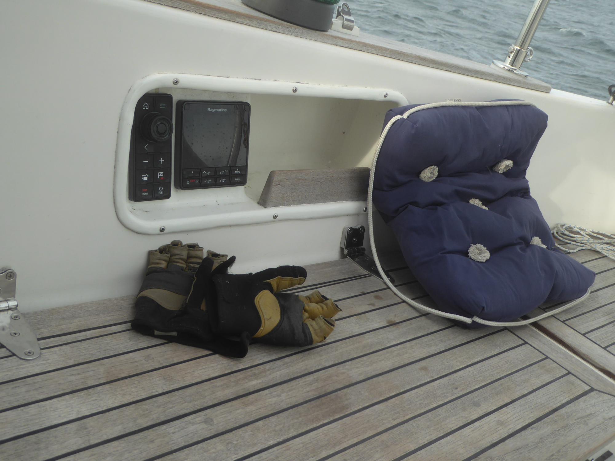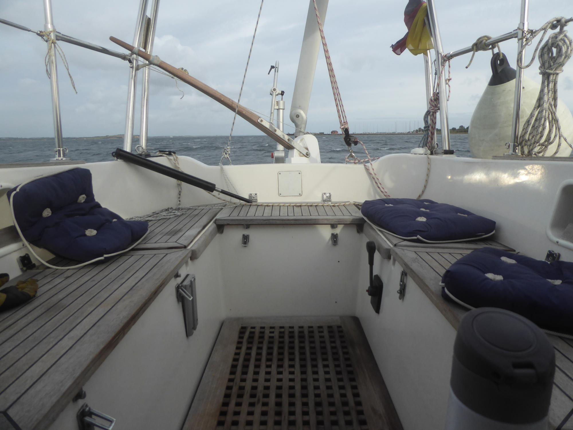 Mit pitschenasser Badehose, aber trocken unter der Öljacke kehre ich ins Cockpit zurück. Der Wind hat inzwischen auf West gedreht, kommt direkt von achtern und bläst den Regen waagerecht hinein bis ans Vorschiffschott. Schnell den Niedergang ganz verschließen. Die Kissen im Cockpit sind vollständig durchnässt, sowohl von Regen- als auch von Salzwasser.