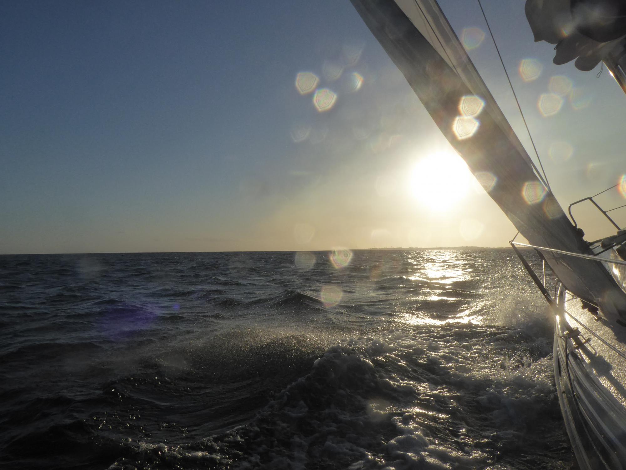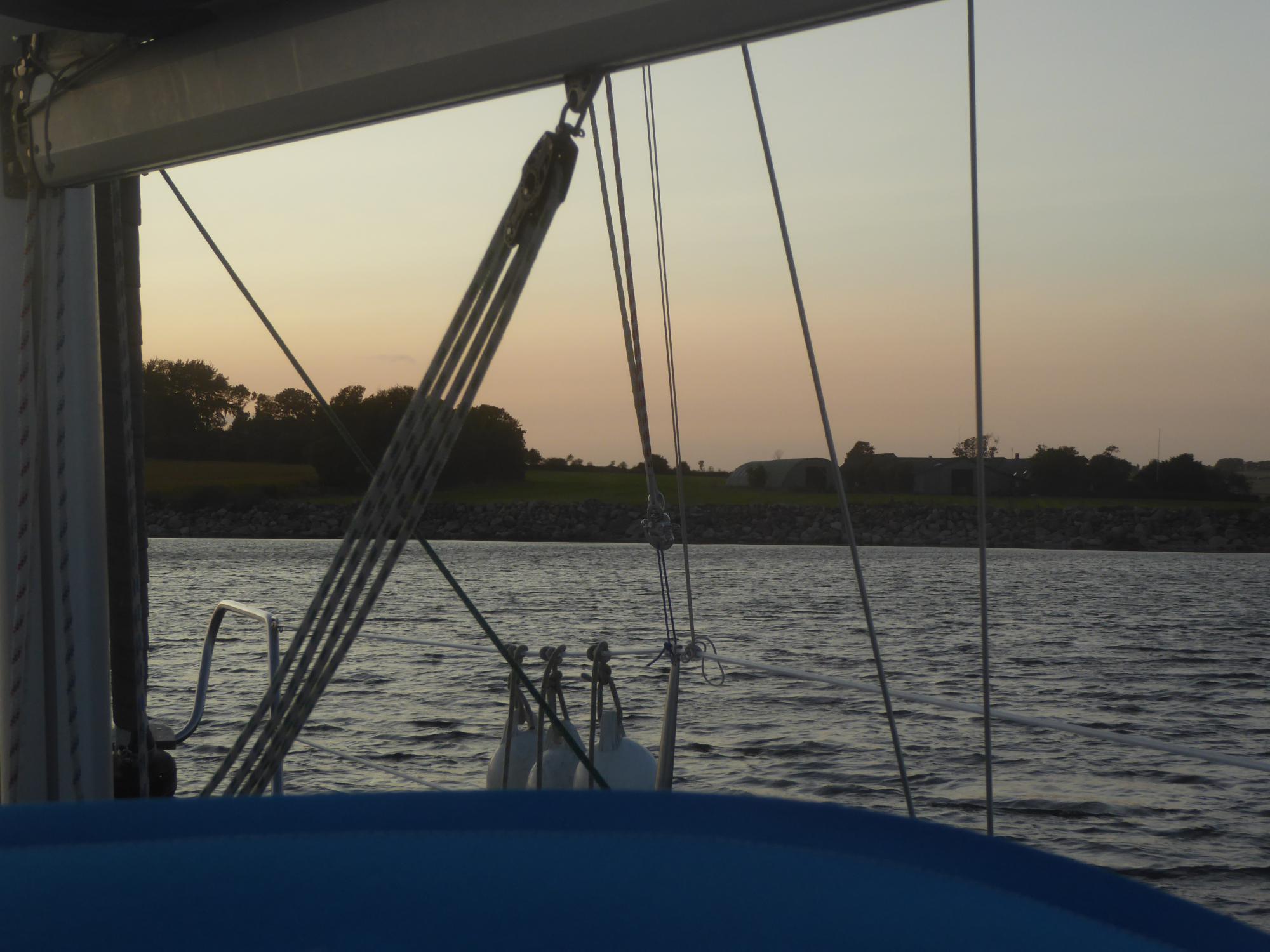 Hinter der Rinne geht es weiter hoch am Wind nach Westen in den Sonnenuntergang hinein. Vor der Nordsteilküste in der Marstal Bugt ankert ein weiterer Großsegler.