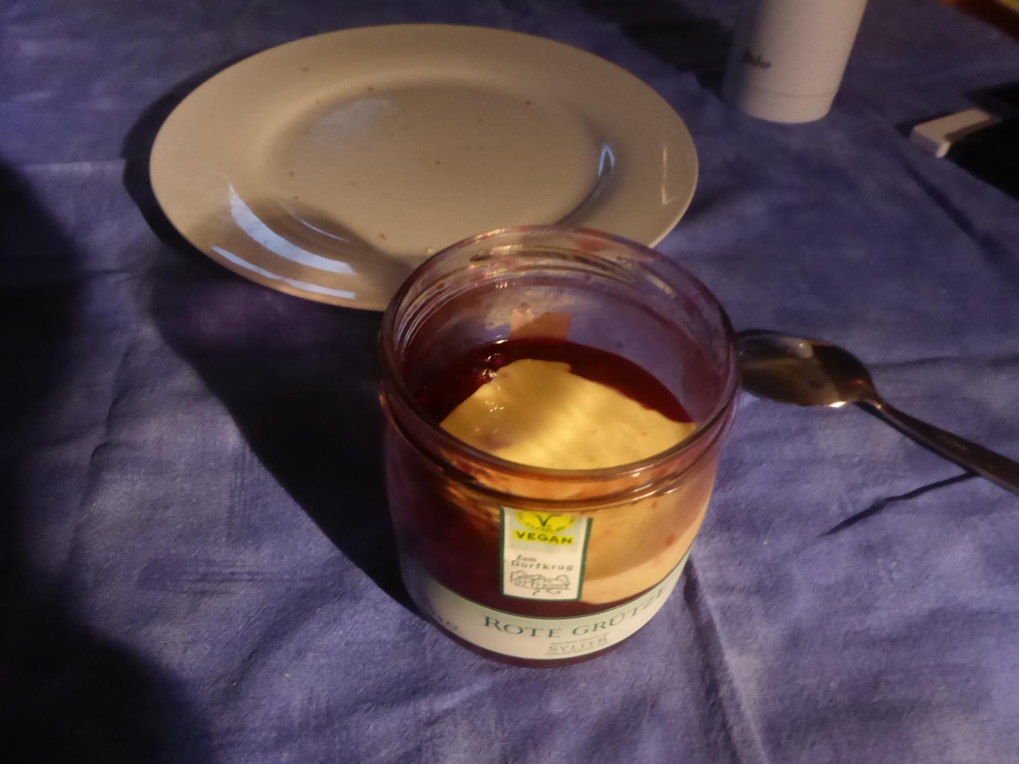 Kurz nach sieben liege ich dicht vor der Küste vor Anker und schmiere mein Abendbrot. Zum Nachtisch gibt es rote Grütze mit Vanillesoße.