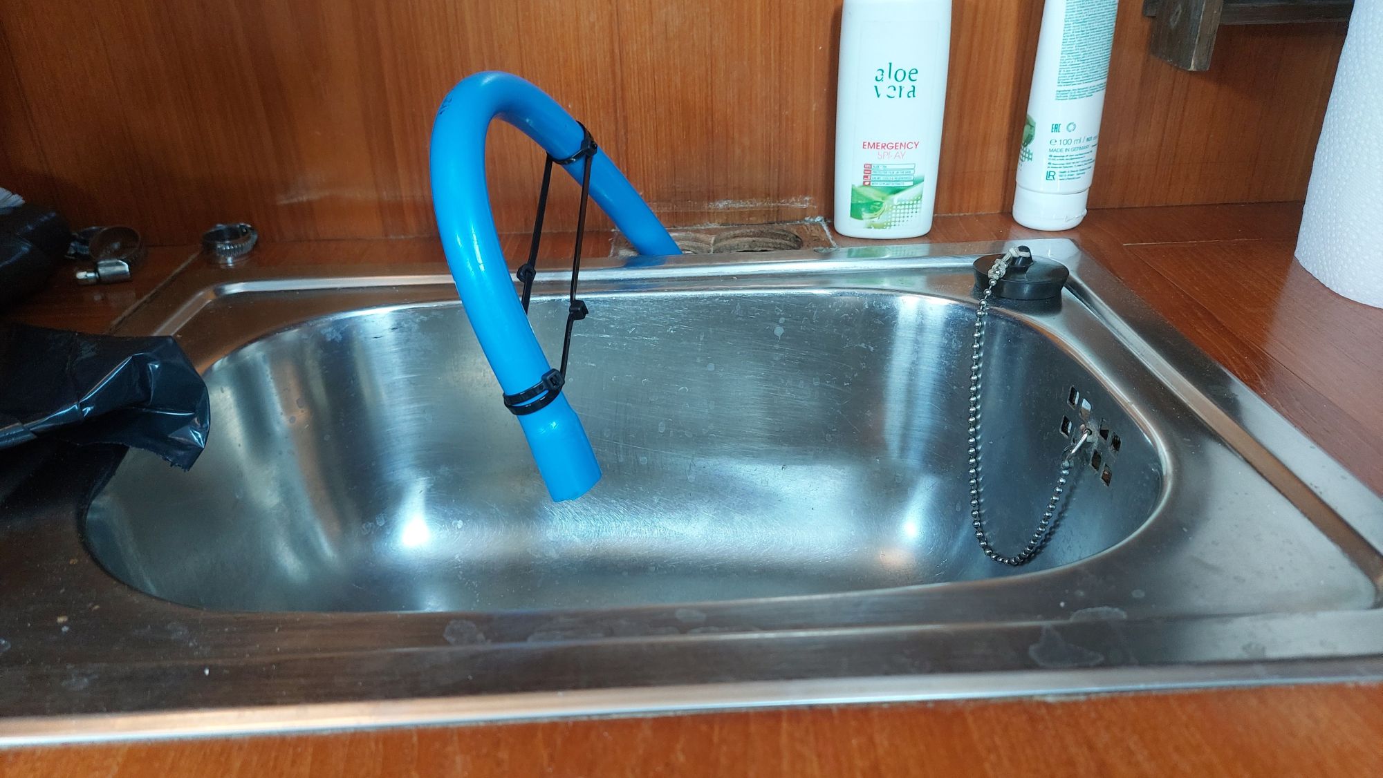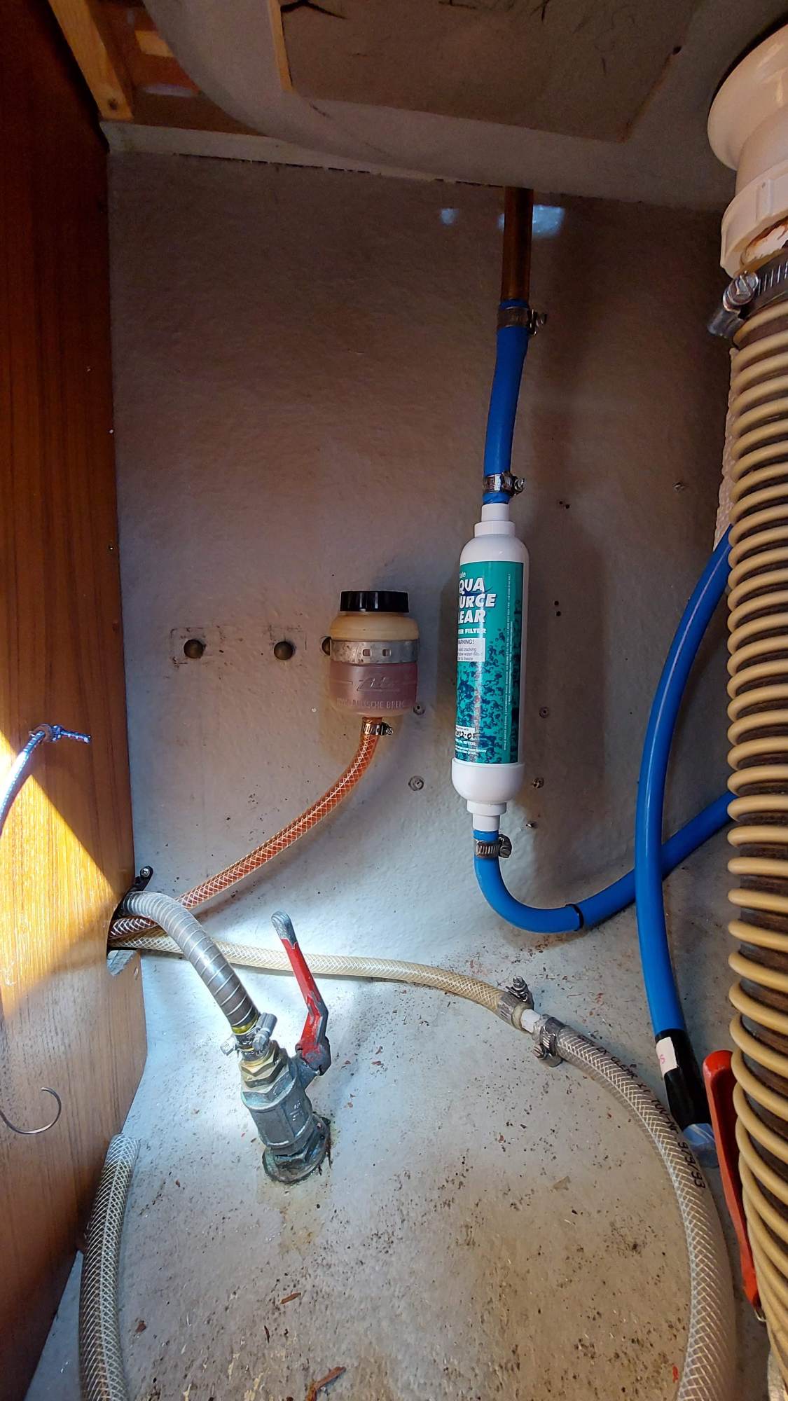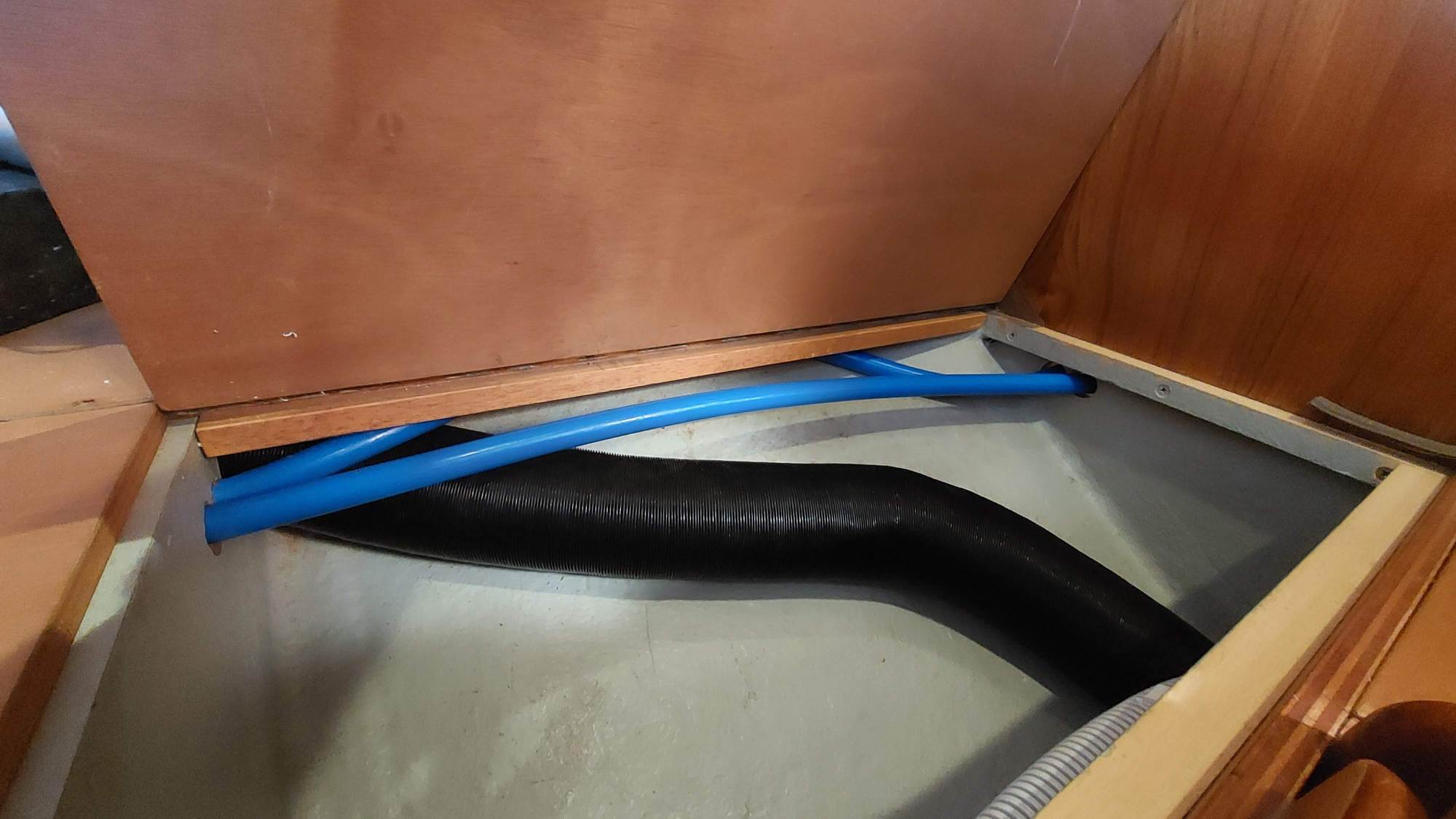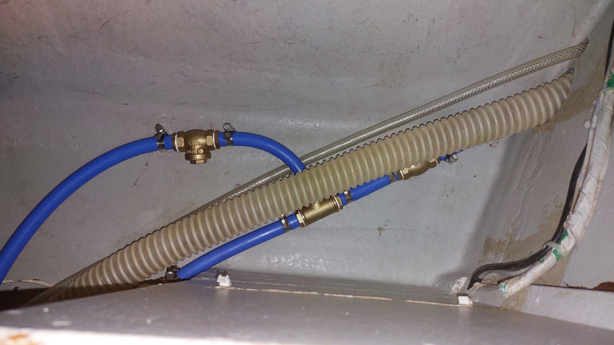 Der Wassertank in der Bilge ist nicht fertiggeworden. Der Tank im Vorschiff ist nutzbar, also wird eine Leitung durchs Boot gezogen. Am Ende sollen an der Pantry sowieso beide Tanks genutzt werden können.