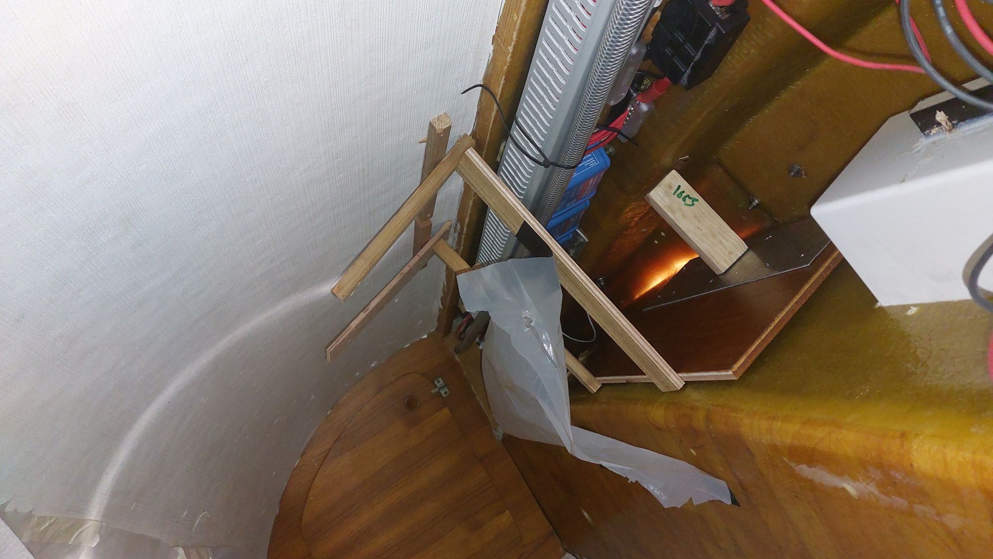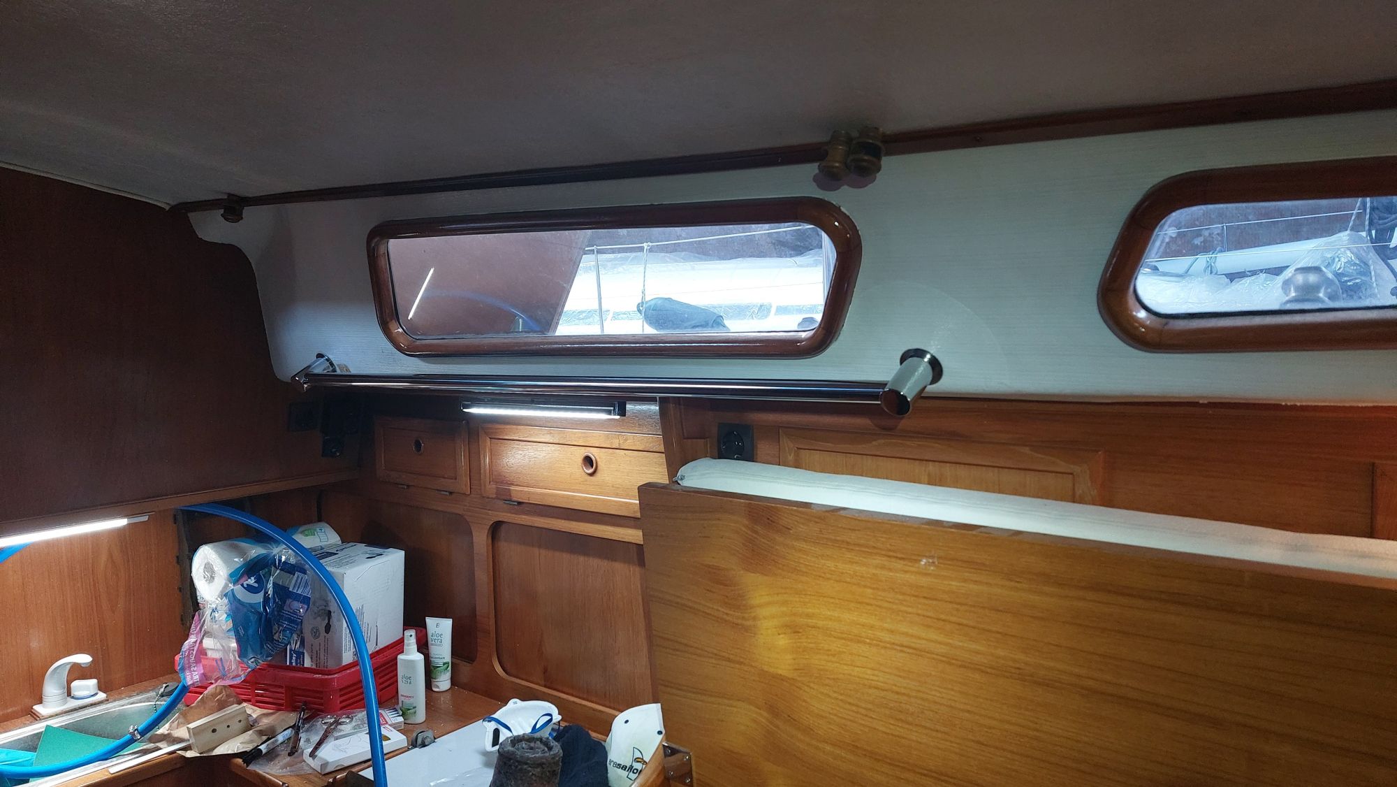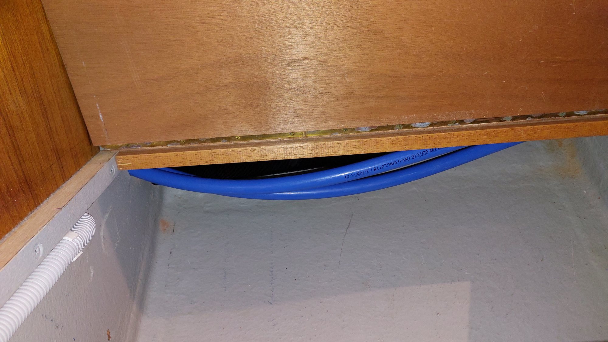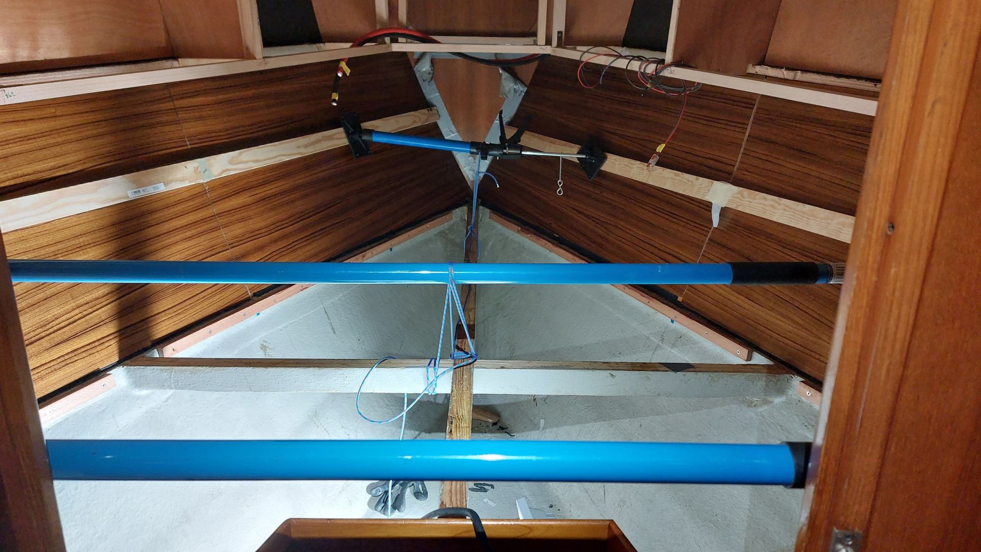 Der Wassertank in der Bilge ist nicht fertiggeworden. Der Tank im Vorschiff ist nutzbar, also wird eine Leitung durchs Boot gezogen. Am Ende sollen an der Pantry sowieso beide Tanks genutzt werden können.