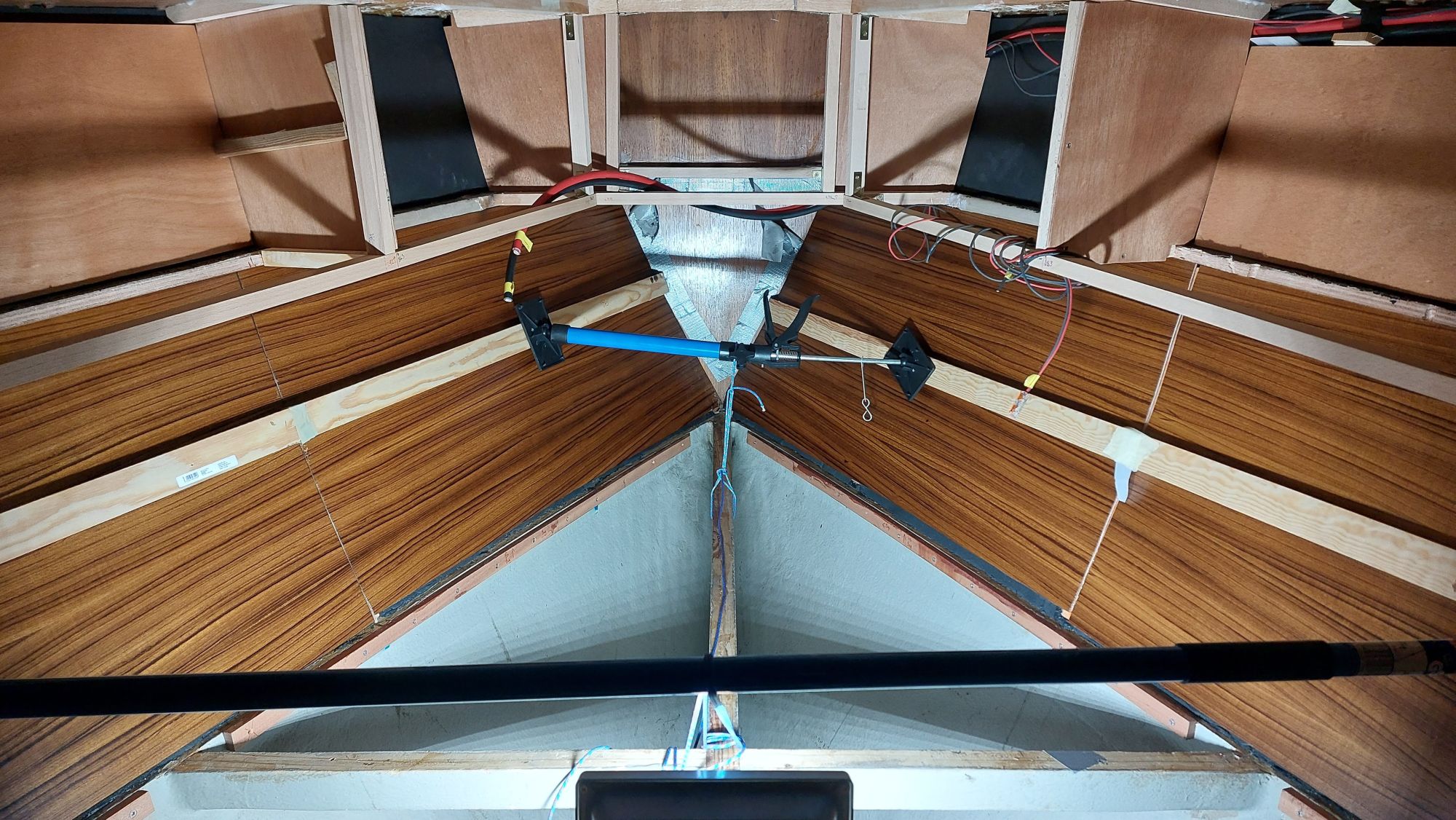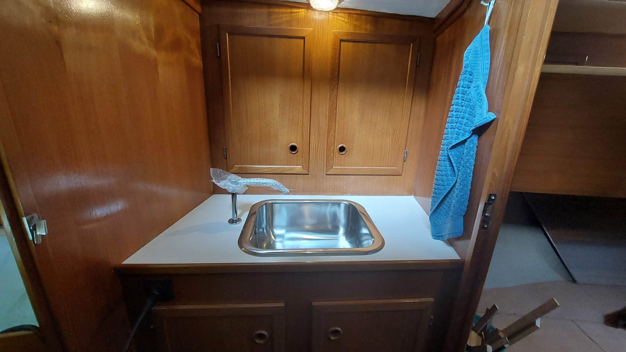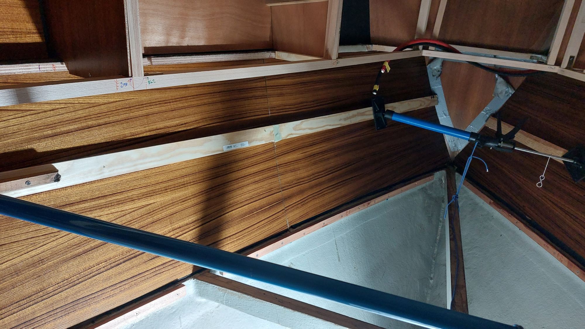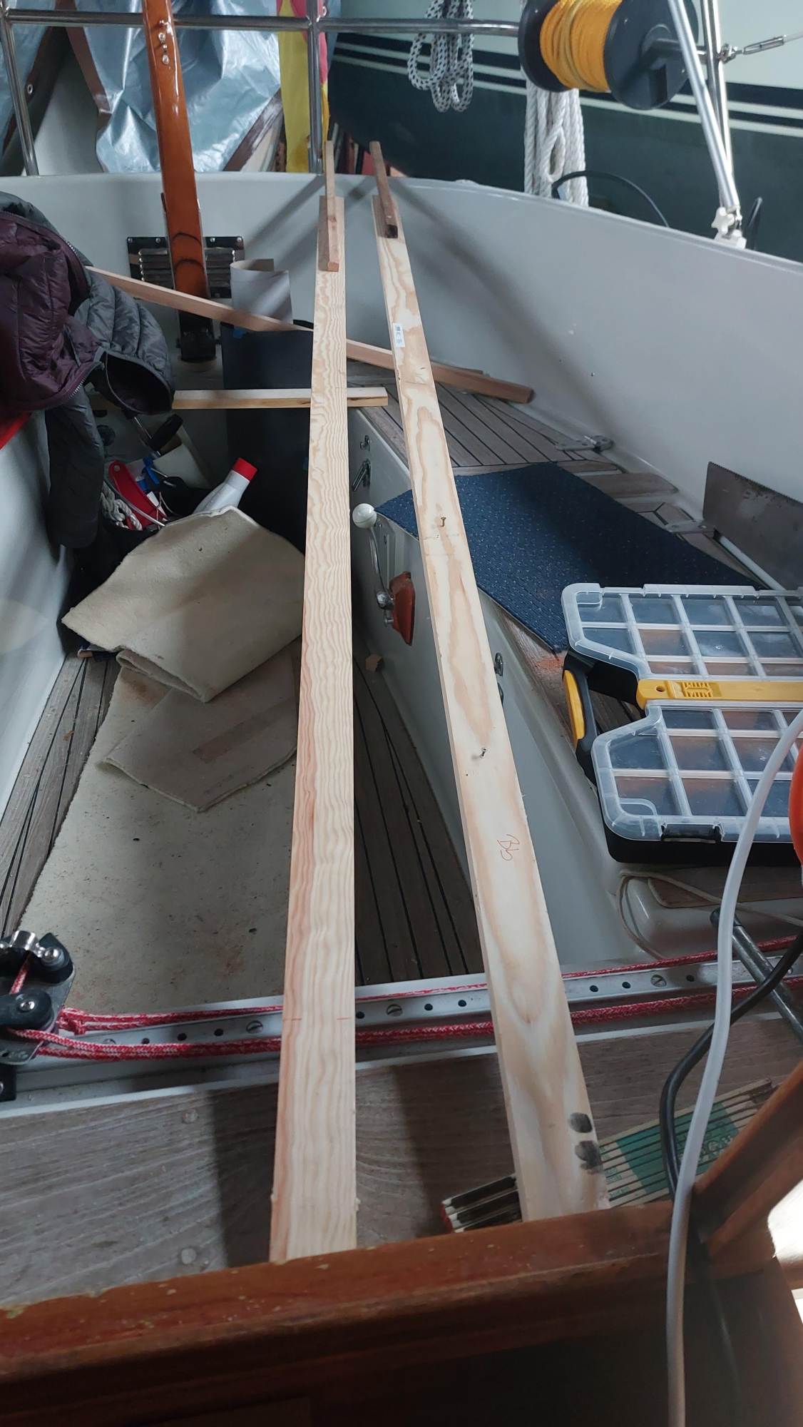 Der Wassertank in der Bilge ist nicht fertiggeworden. Der Tank im Vorschiff ist nutzbar, also wird eine Leitung durchs Boot gezogen. Am Ende sollen an der Pantry sowieso beide Tanks genutzt werden können.