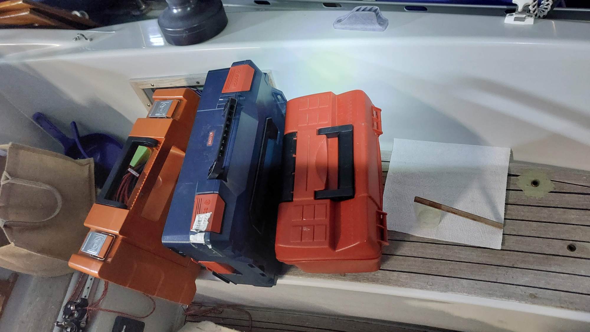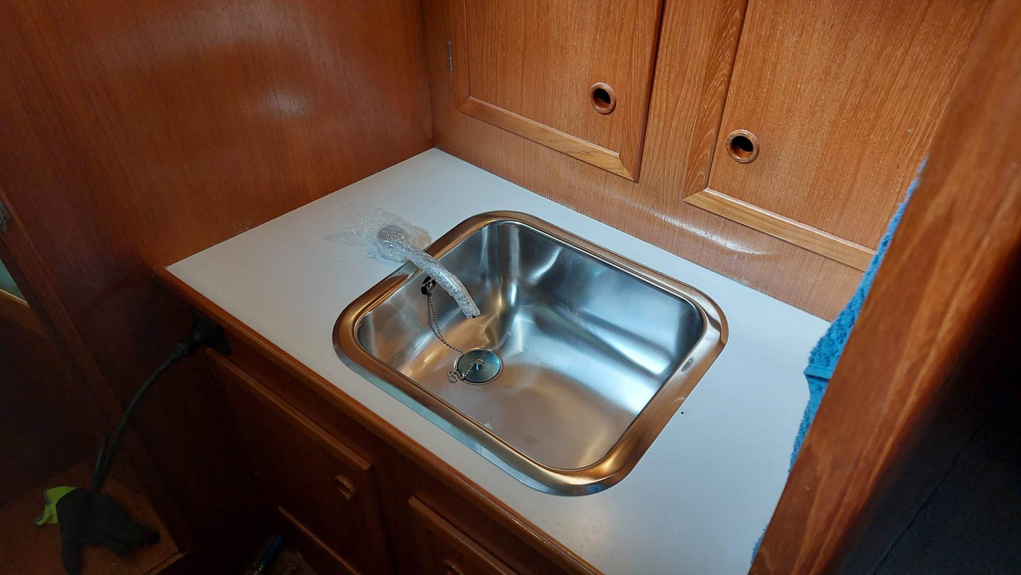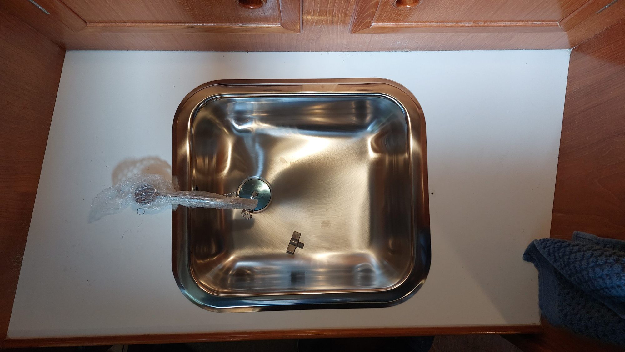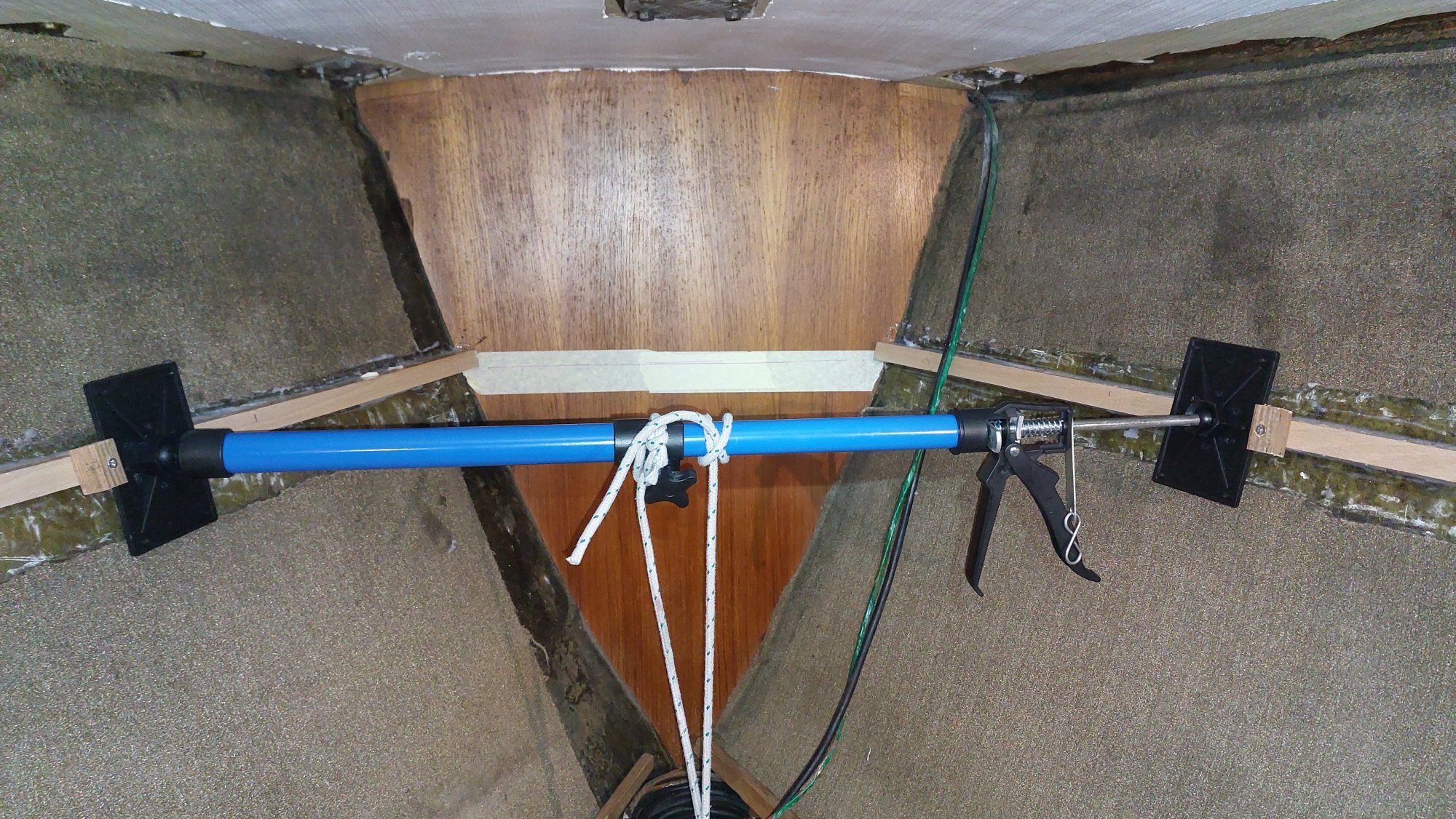 Der Wassertank in der Bilge ist nicht fertiggeworden. Der Tank im Vorschiff ist nutzbar, also wird eine Leitung durchs Boot gezogen. Am Ende sollen an der Pantry sowieso beide Tanks genutzt werden können.